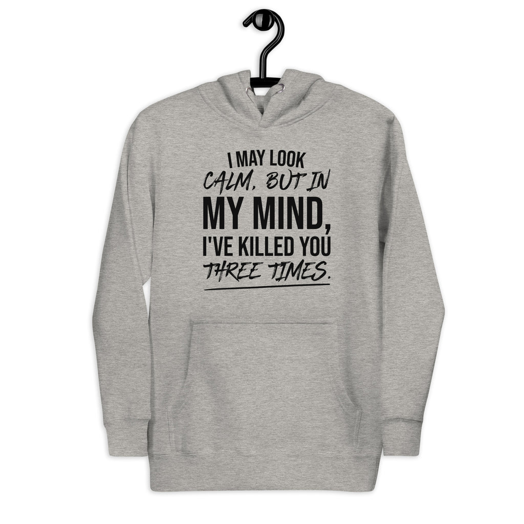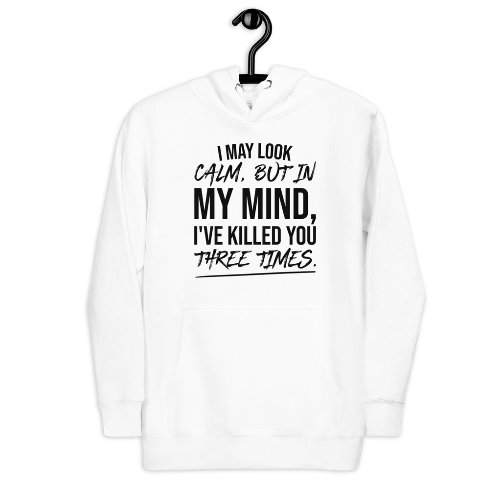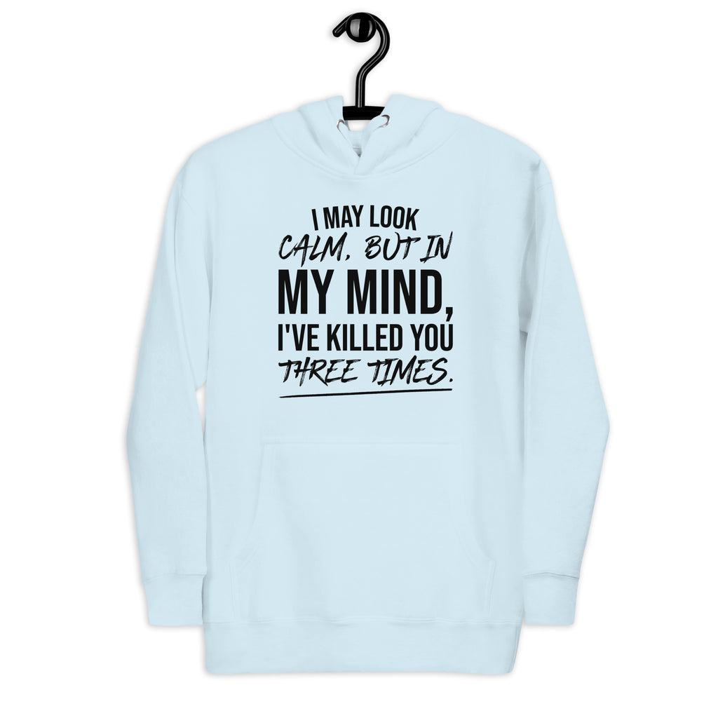 Stay calm on the outside, savage on the inside. The “I May Look Calm but In My Mind I’ve Killed You Three Times” hoodie brings together comfort and dark humor in the best way. Perfect for anyone who looks composed while their inner thoughts are on a whole other level, this hoodie is equal parts cozy, bold, and unapologetic. Wear it when you want to make a statement, spark laughs, or just embrace your perfectly wicked sense of humor.