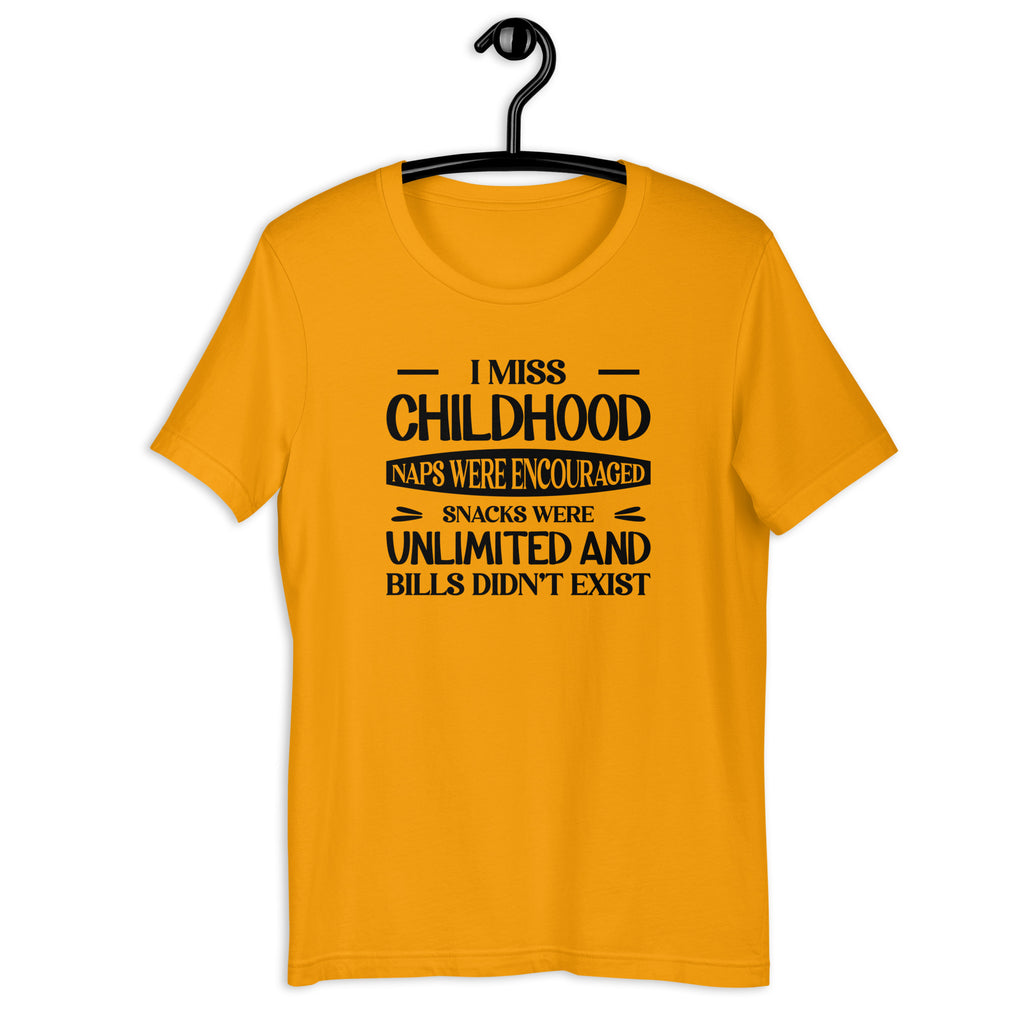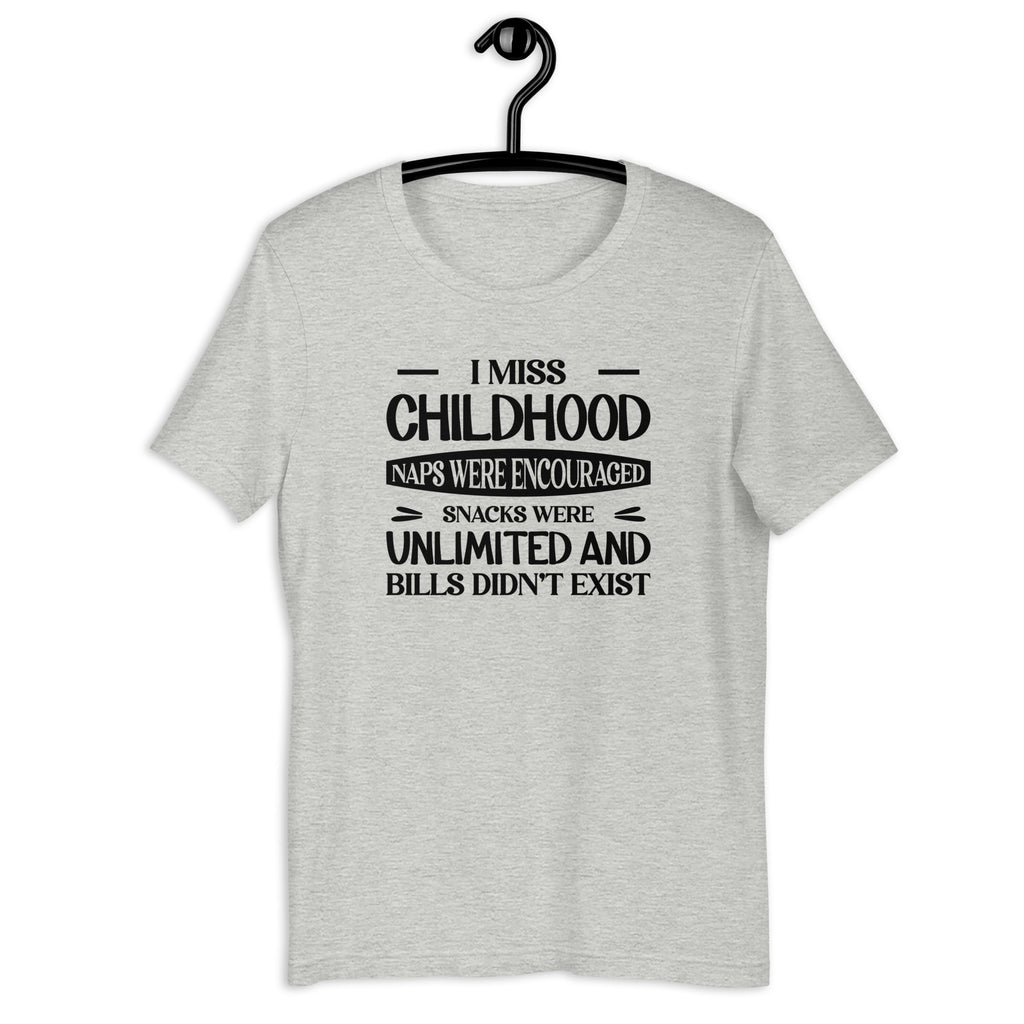 Keep it real with the “I Miss Childhood — Naps Were Encouraged, Snacks Were Unlimited, and Bills Didn’t Exist” T-shirt. Perfect for anyone who wishes adulthood came with snack breaks and scheduled naps, this tee blends nostalgia, humor, and a little bit of emotional damage into one cozy statement.