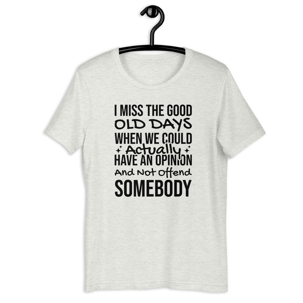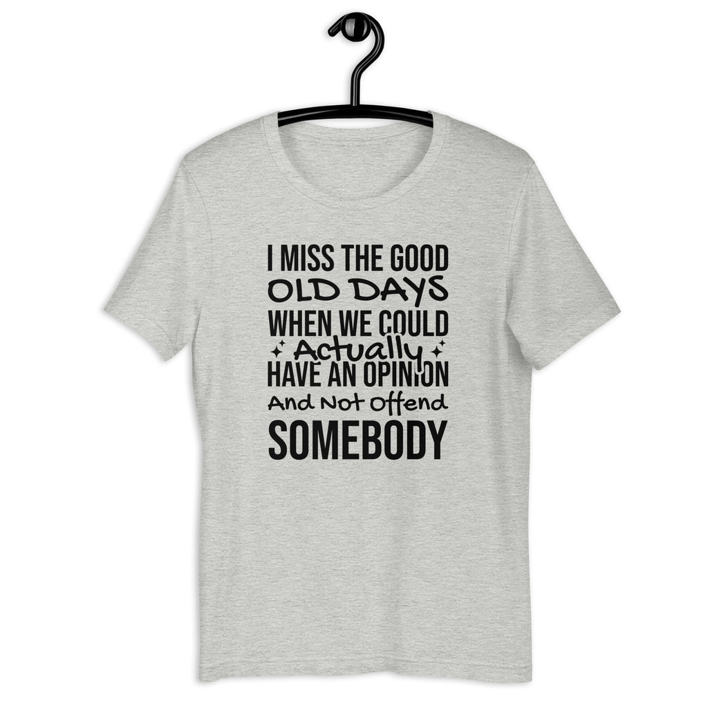 Take a stand for common sense with the “I Miss the Good Old Days When You Could Actually Have an Opinion and Not Offend Somebody” t-shirt. Perfect for anyone frustrated with today’s overly sensitive world, this shirt delivers a bold message with a touch of humor.