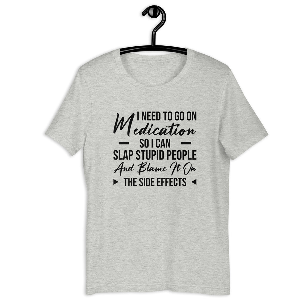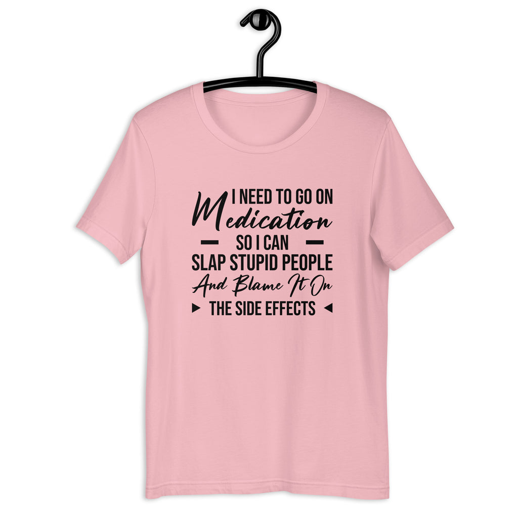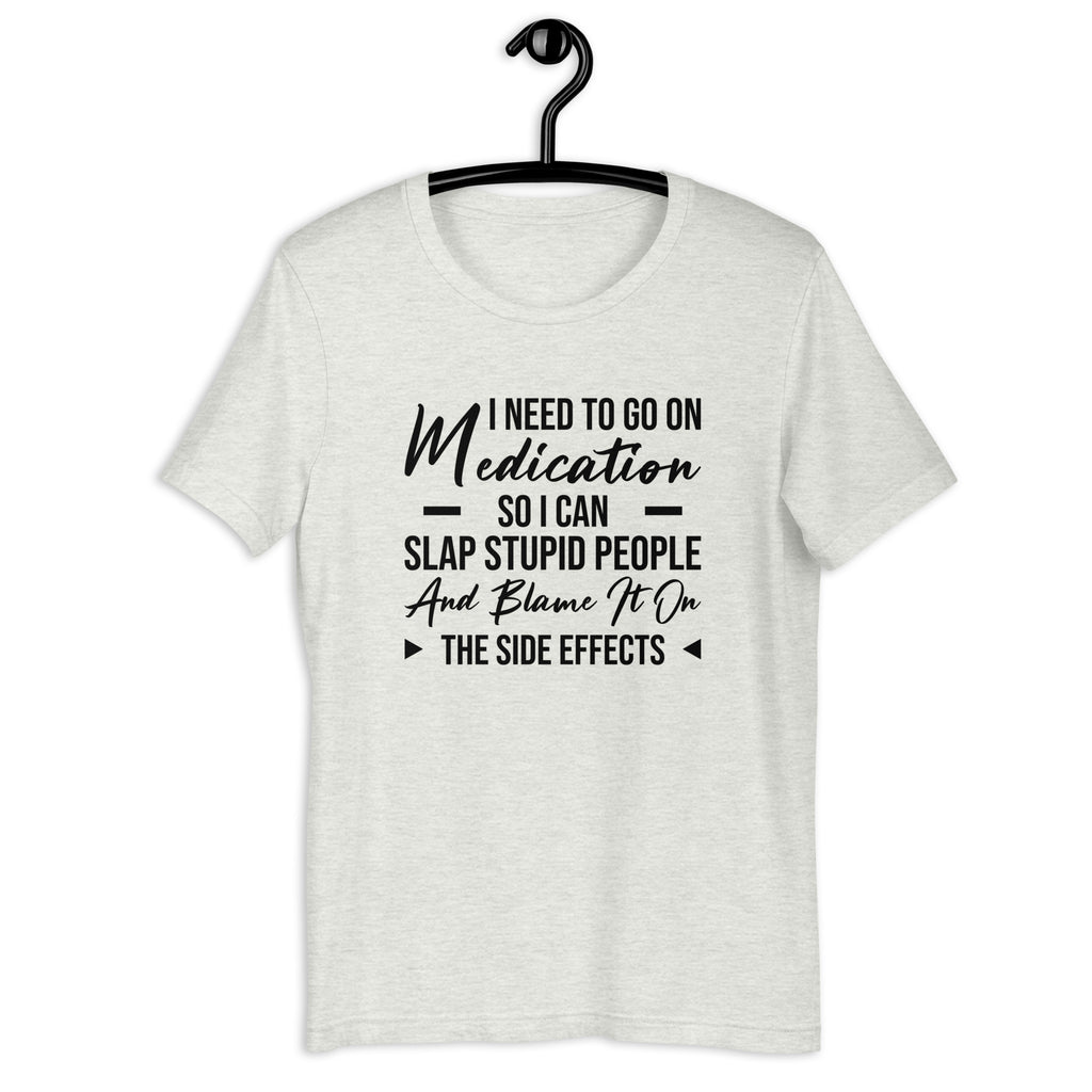 Funny, sarcastic, and wildly unapologetic. The “I Need to Go on Medication So I Can Slap Stupid People and Blame It on the Side Effects” T-shirt is made for those with zero tolerance for nonsense and a sharp sense of humor to match. It’s exaggerated, tongue-in-cheek, and perfectly captures that trying-to-stay-calm energy.