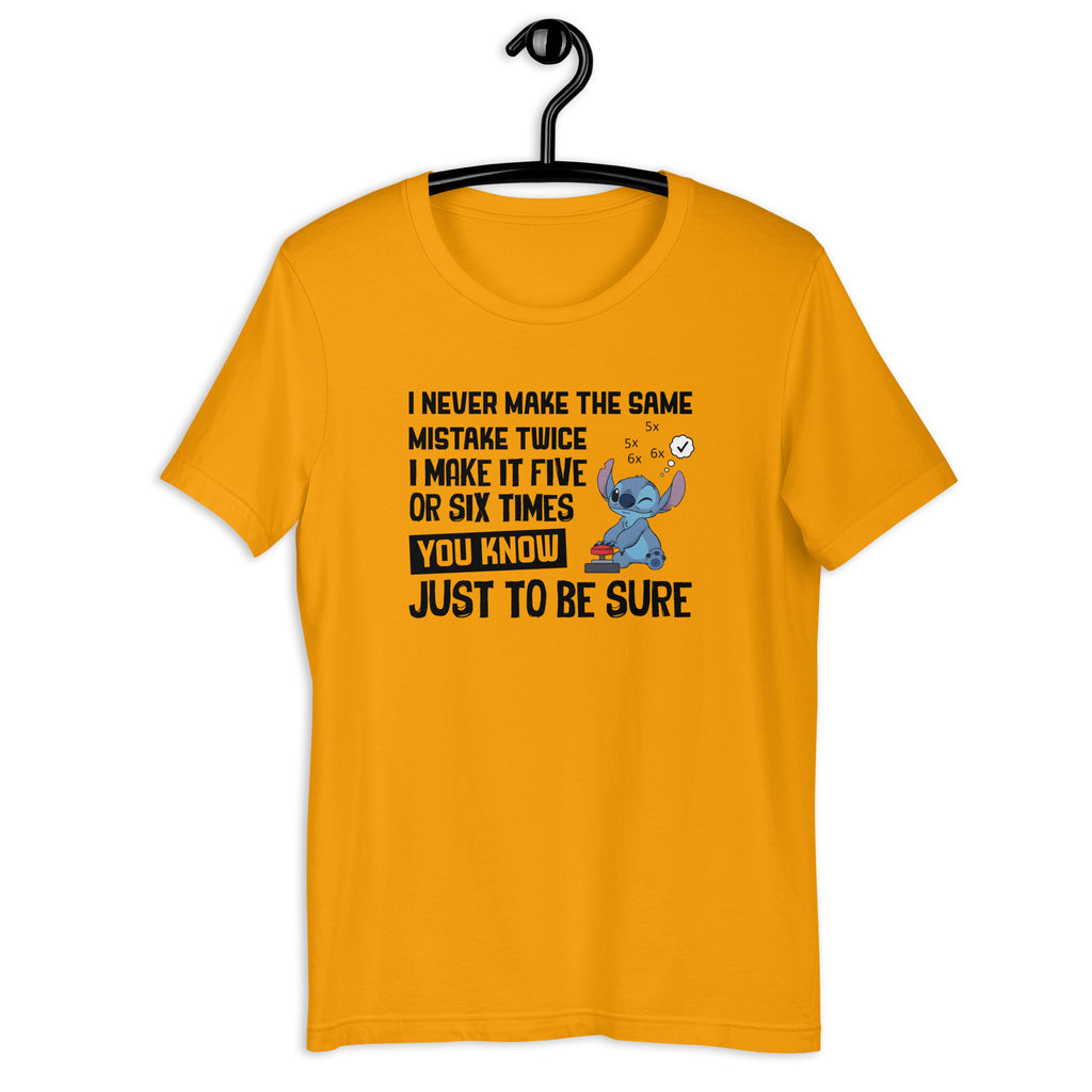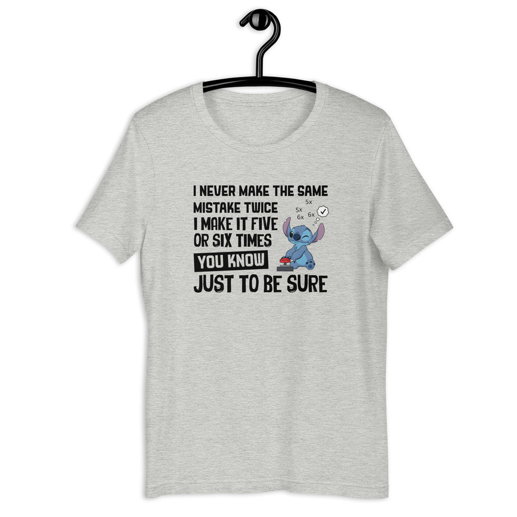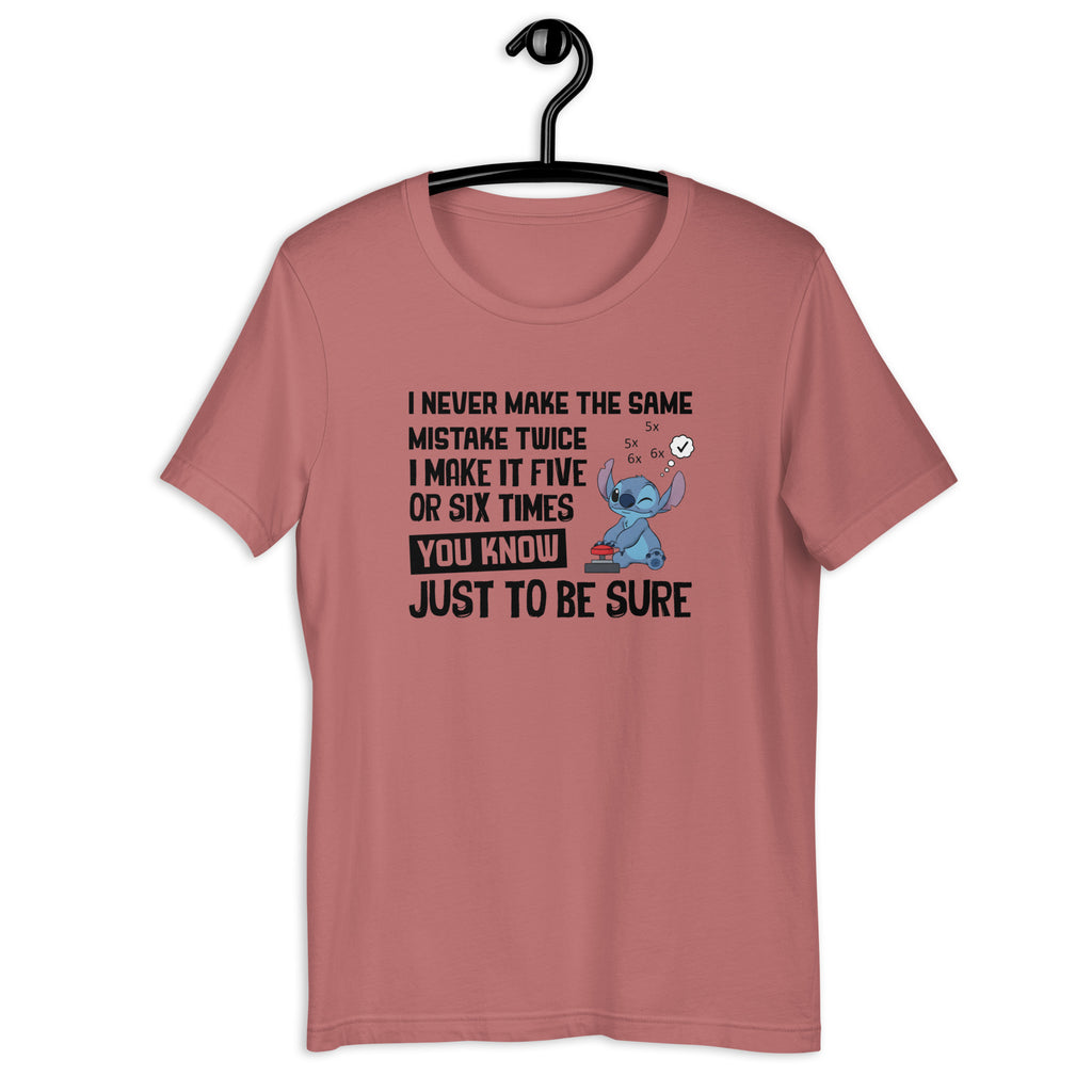 Own your perfectly imperfect chaos with the “I Never Make the Same Mistake Twice — I Make It Five or Six Times, Just to Be Sure” T-shirt — the perfect tee for anyone who learns life lessons the long way. This shirt turns self-aware clumsiness into comedy, celebrating the people who don’t just repeat mistakes… they double-check them.