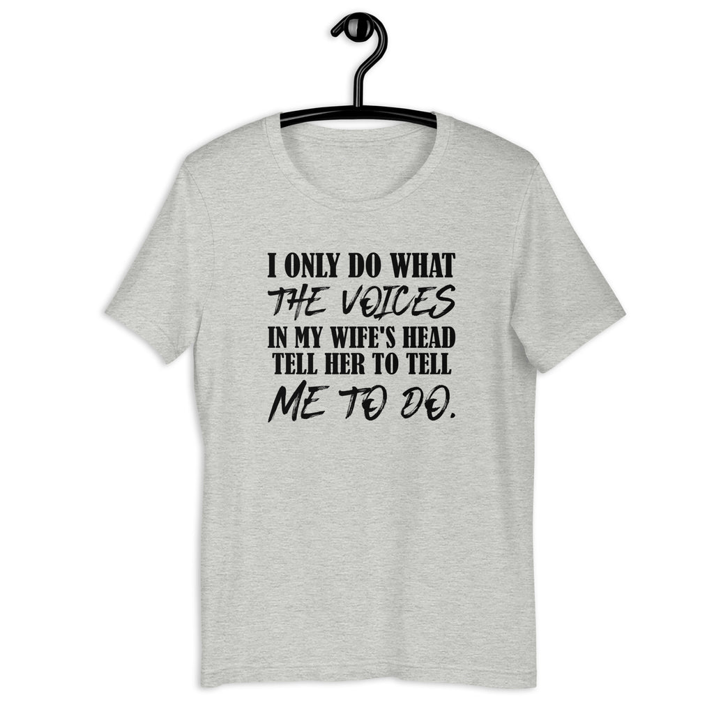 Keep marriage real (and hilarious) with the “I Only Do What the Voices in My Wife’s Head Tell Her to Tell Me to Do” t-shirt. Perfect for husbands who know the secret to a “happy” relationship—listening, obeying, and laughing it off—this tee is all about love, sarcasm, and a touch of survival strategy.