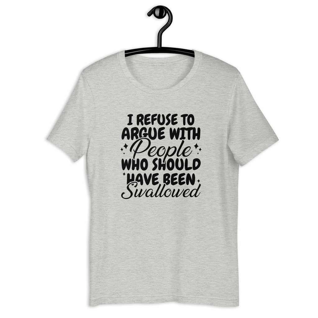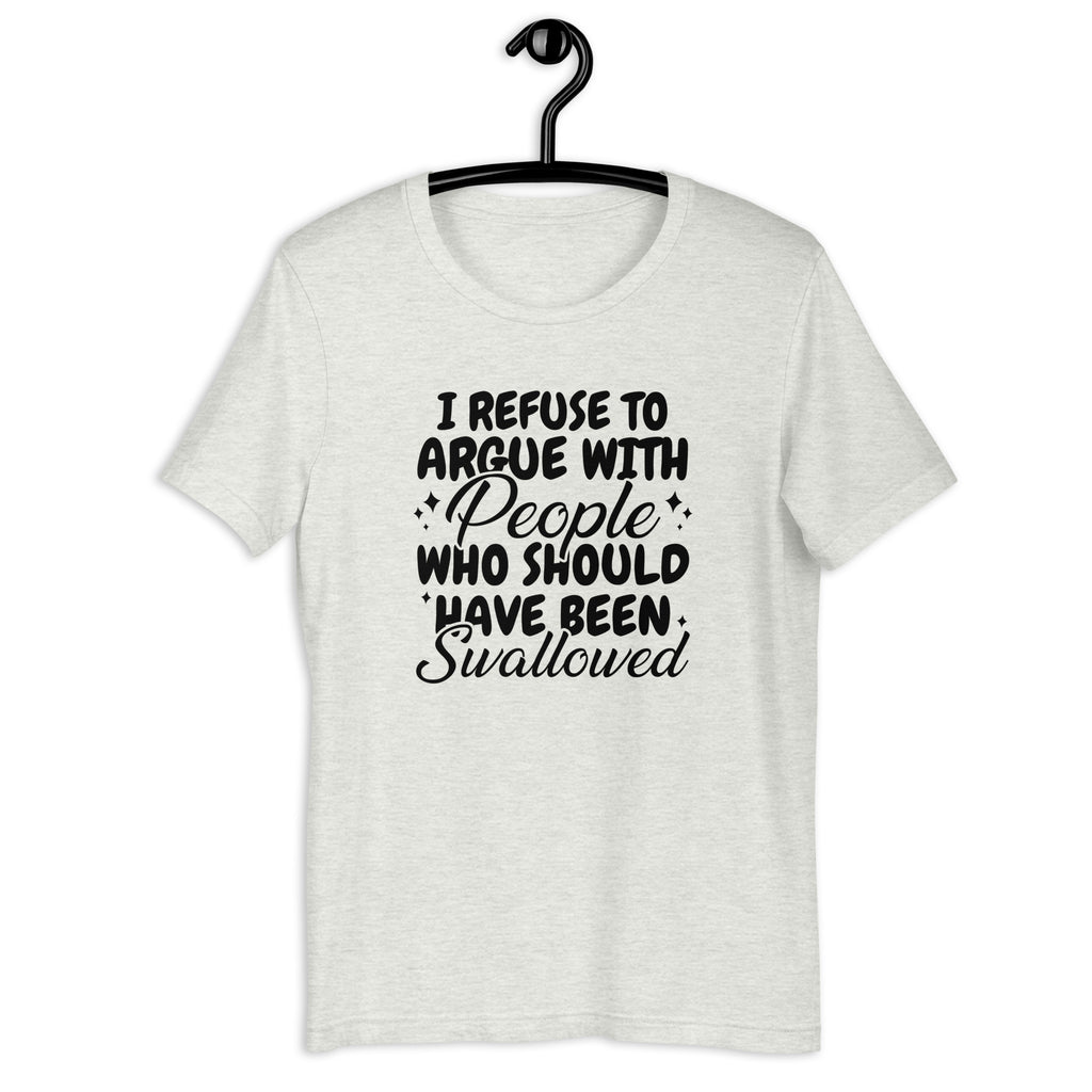 Keep it savage with the “I Refuse To Argue With People Who Should Have Been Swallowed” t-shirt. Bold, edgy, and unapologetically blunt, this shirt is perfect for anyone with a no-nonsense attitude and a wicked sense of humor. Say exactly what you’re thinking—without saying a word.