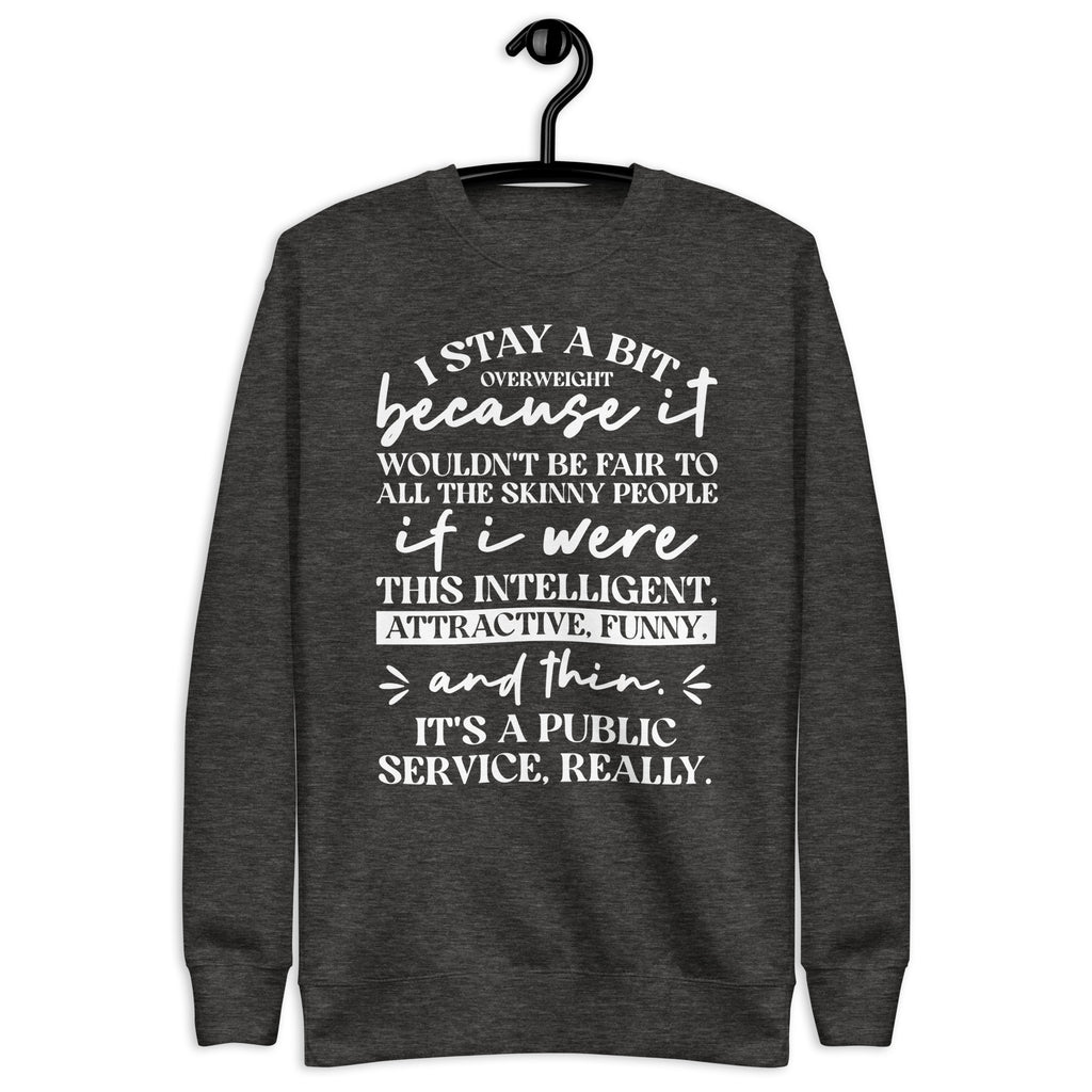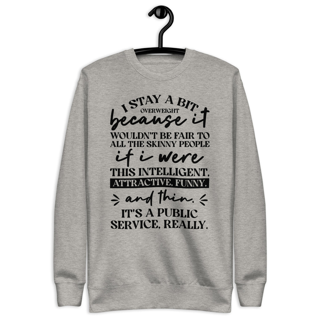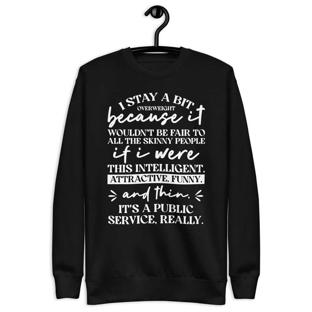 Show off your confidence and sense of humor with the “I Stay a Bit Overweight Because It Wouldn’t Be Fair to All the Skinny People If I Were This Intelligent, Attractive, Funny, and Thin — It’s a Public Service, Really” sweatshirt. Witty, bold, and totally relatable, this sweatshirt is perfect for anyone who embraces their charm and doesn’t take themselves too seriously.