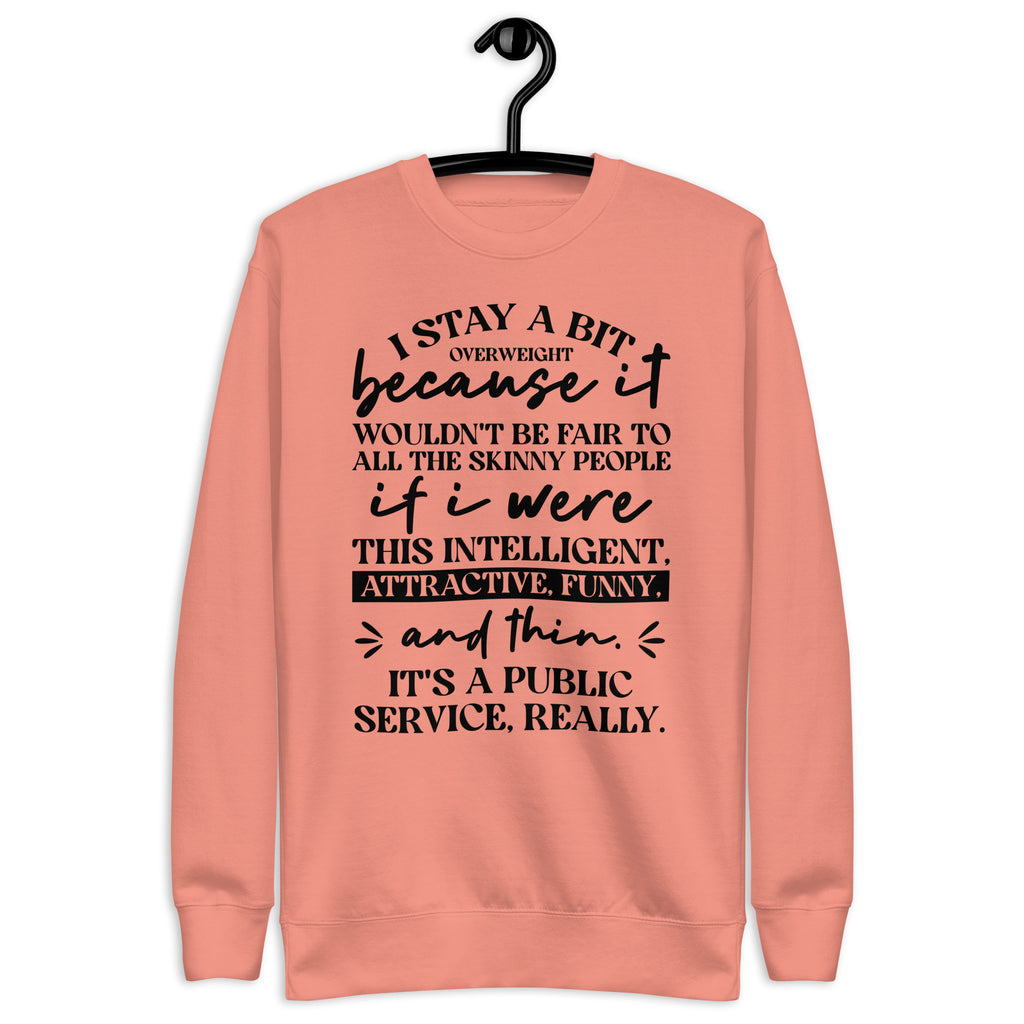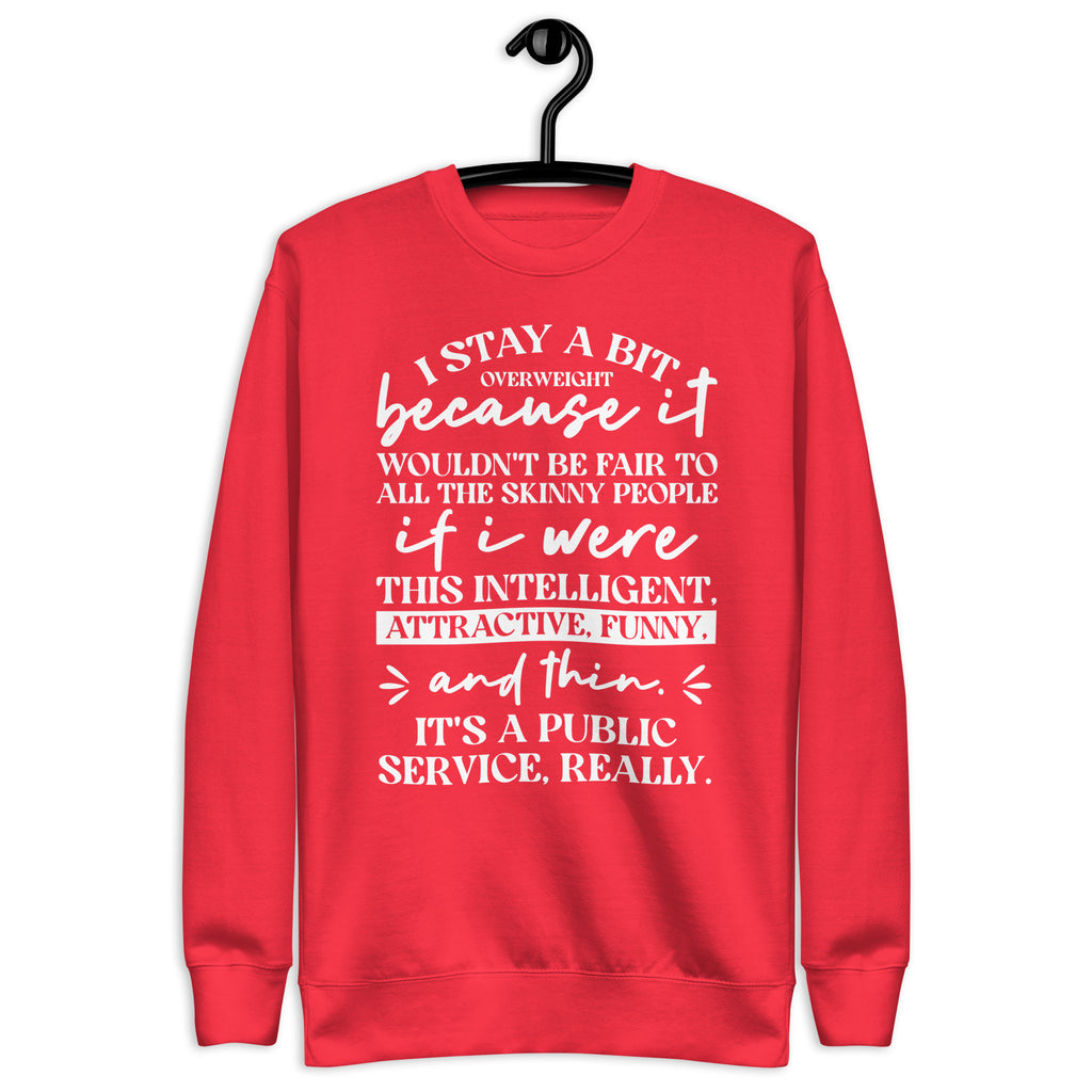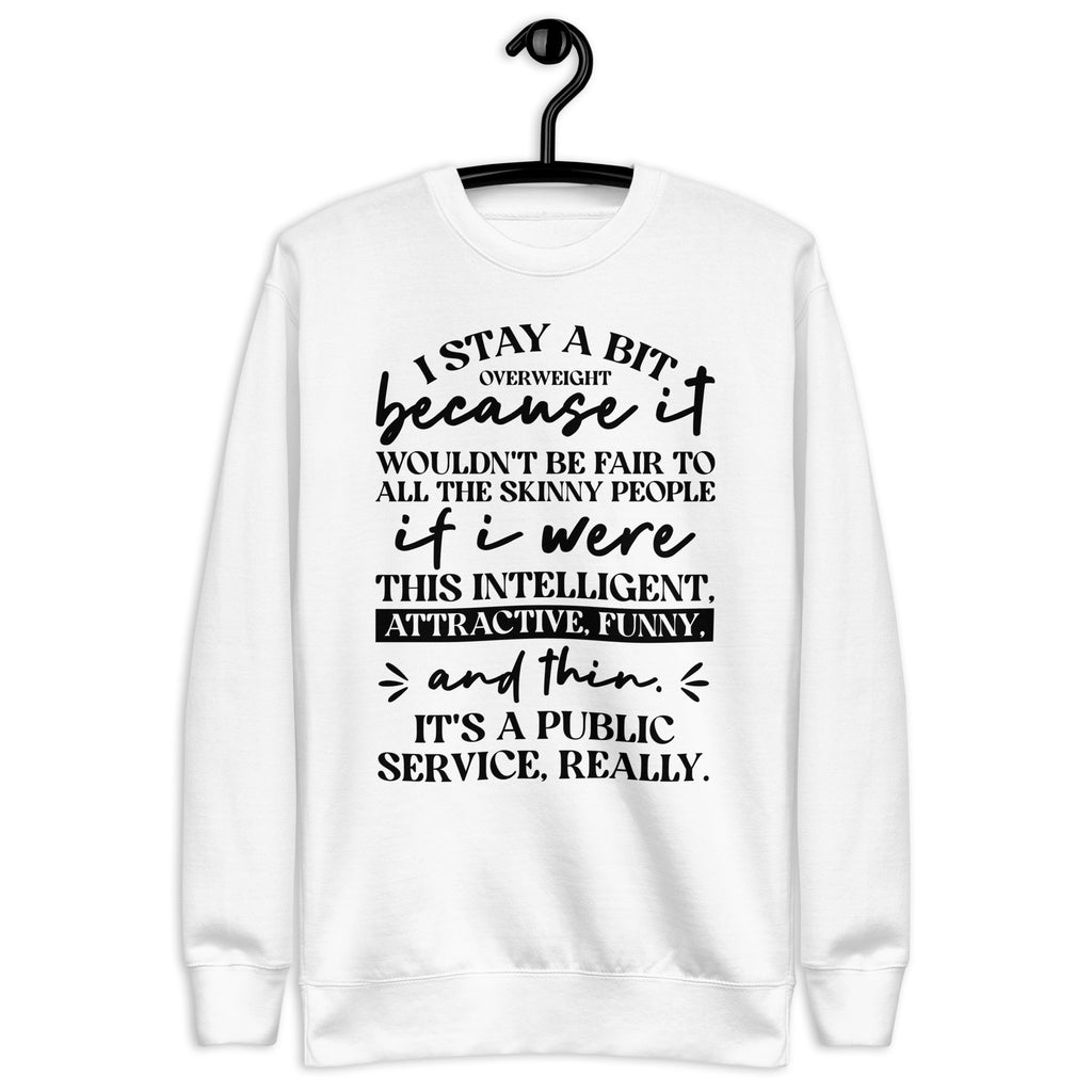 Show off your confidence and sense of humor with the “I Stay a Bit Overweight Because It Wouldn’t Be Fair to All the Skinny People If I Were This Intelligent, Attractive, Funny, and Thin — It’s a Public Service, Really” sweatshirt. Witty, bold, and totally relatable, this sweatshirt is perfect for anyone who embraces their charm and doesn’t take themselves too seriously.