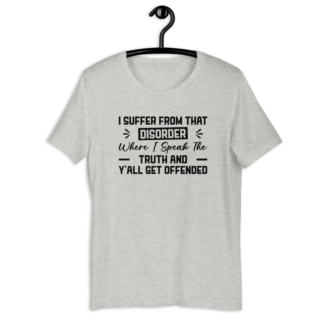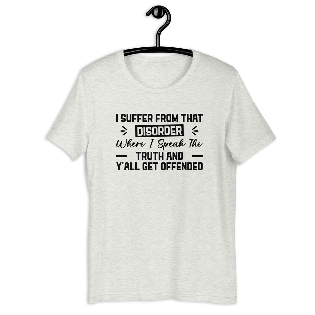 Let everyone know your honesty isn’t the problem with the “I SUFFER FROM THAT DISORDER WHERE I SPEAK THE TRUTH AND Y’ALL GET OFFENDED” T-shirt — the perfect tee for anyone whose mouth operates on reality, not sensitivity. This shirt calls out the modern epidemic of hurt feelings with bold humor and unapologetic attitude, reminding everyone that the truth doesn’t change just because someone can’t handle it.