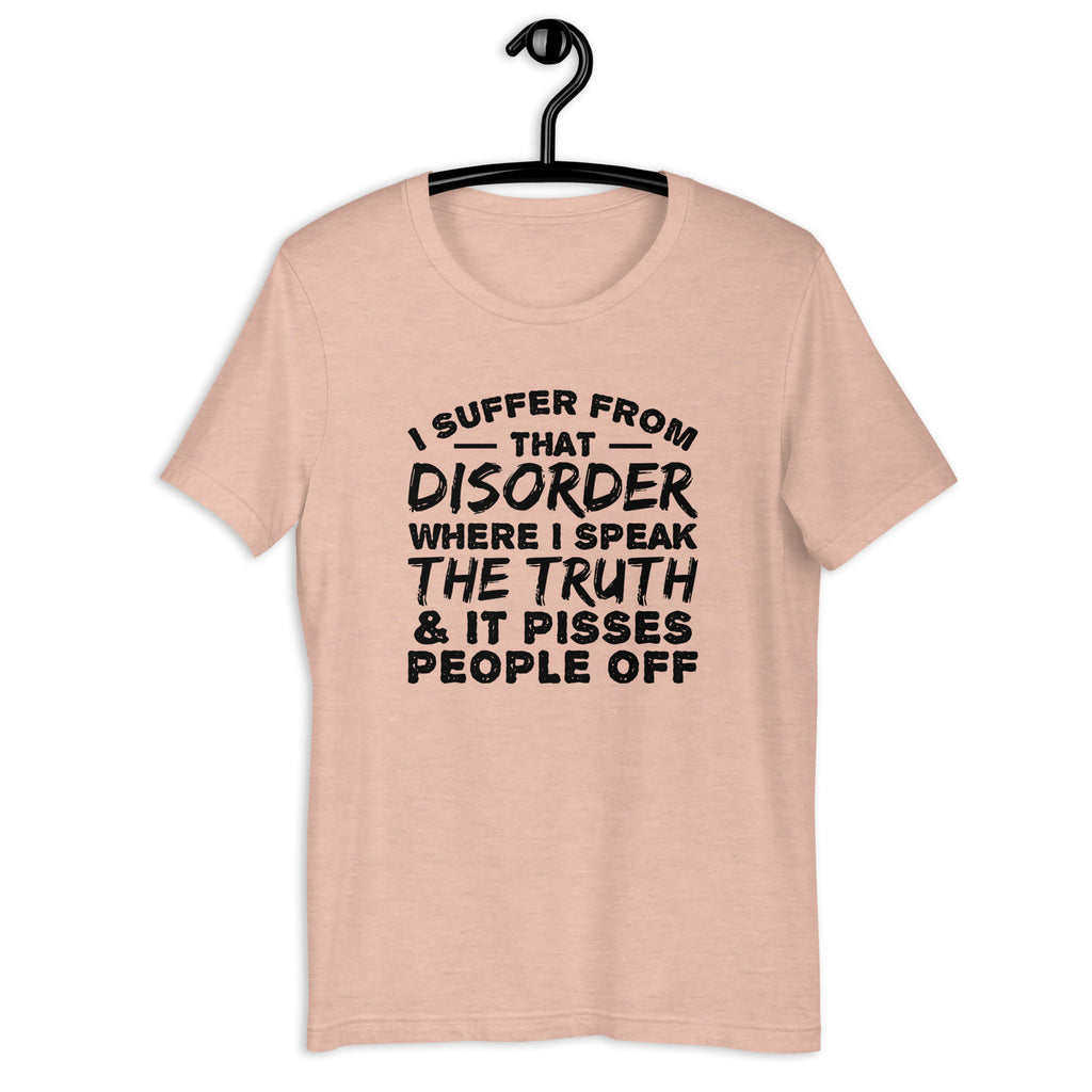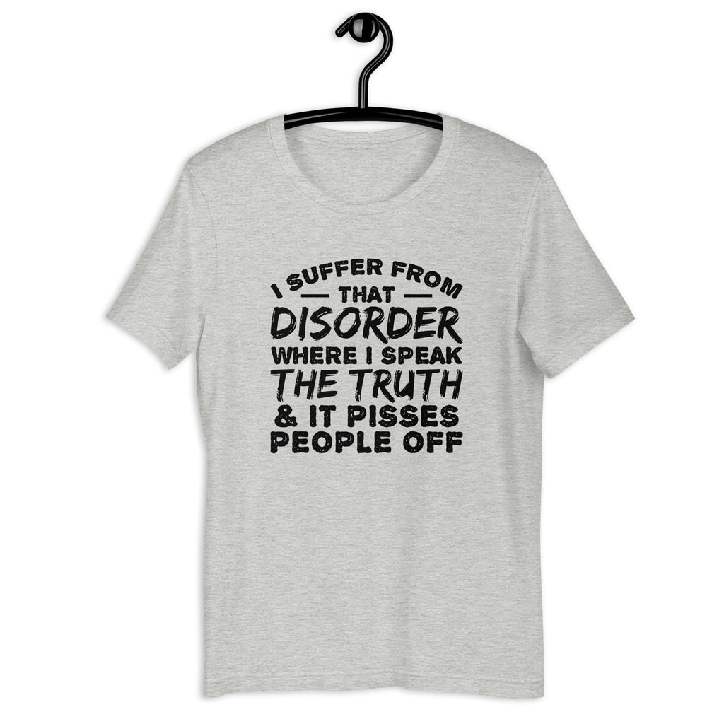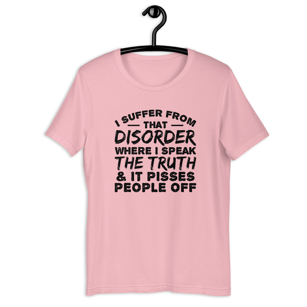 Own your honesty with this “I Suffer From That Disorder Where I Speak the Truth and It Pisses People Off” t-shirt. Bold, sarcastic, and a little savage, this tee is perfect for anyone who says what everyone else is thinking—and doesn’t care if it ruffles feathers.