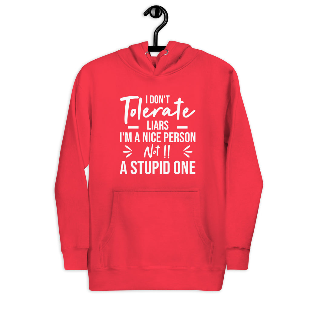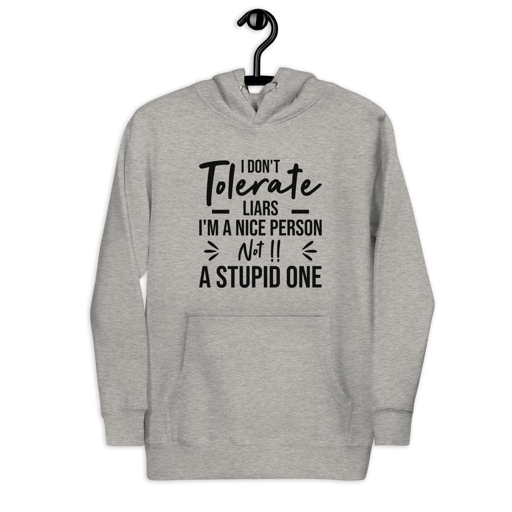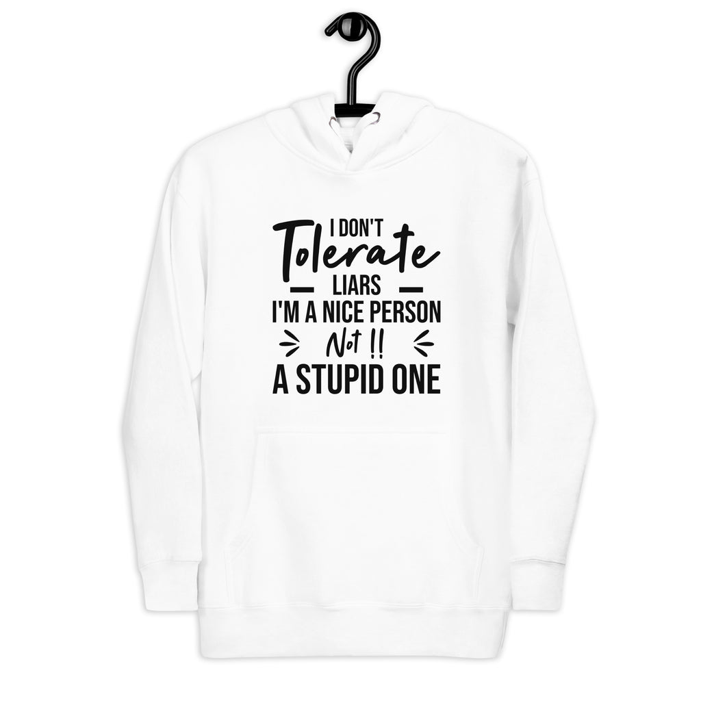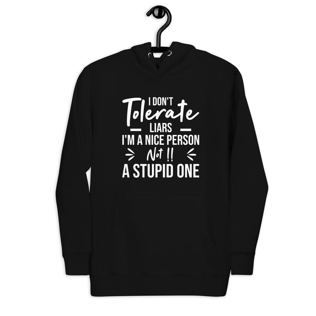 Bold, confident, and crystal clear. The “I Tolerate Liars — I’m a Nice Person, Not a Stupid One” hoodie is made for those who lead with kindness but refuse to be fooled. It delivers a strong message with attitude, letting the world know that being nice never means ignoring the truth.