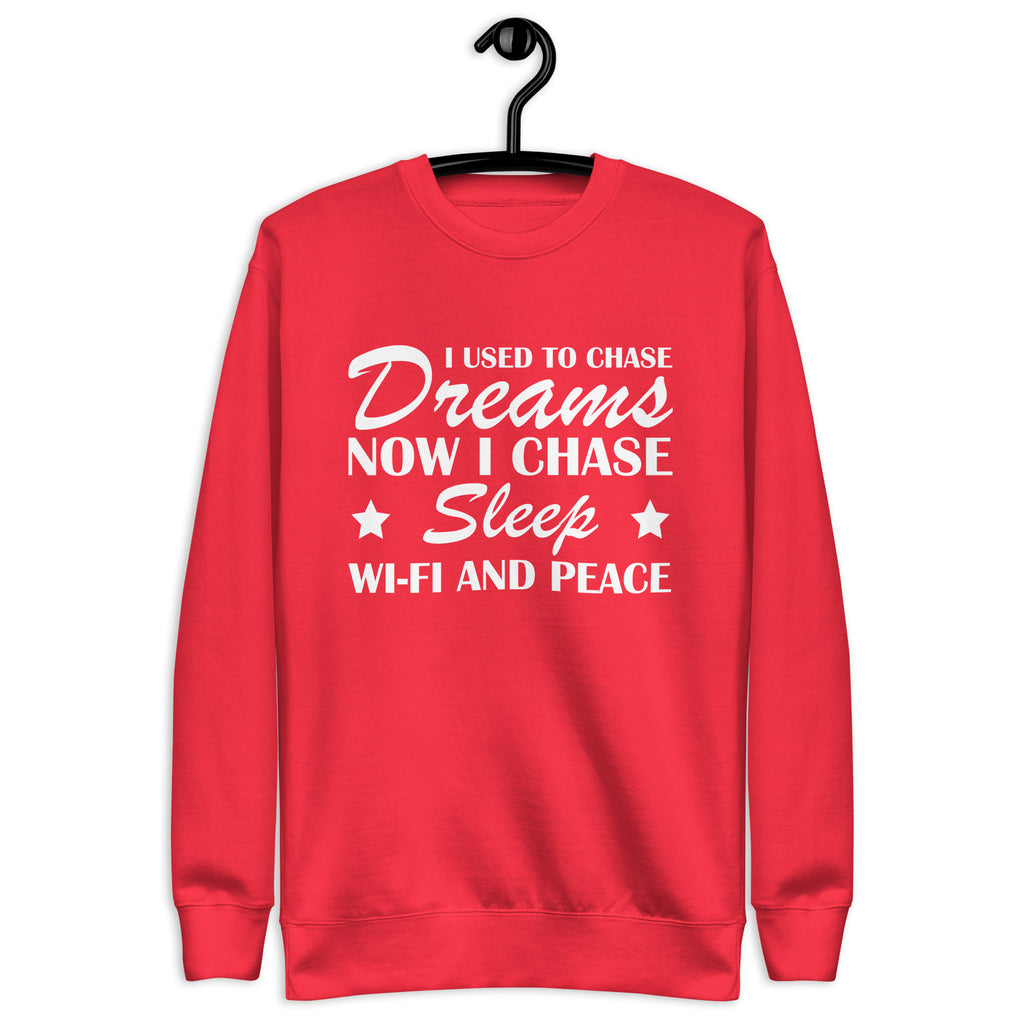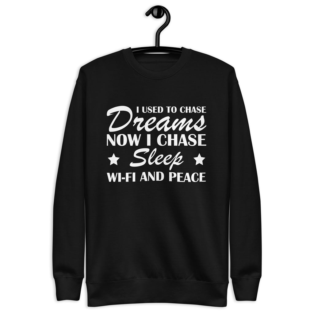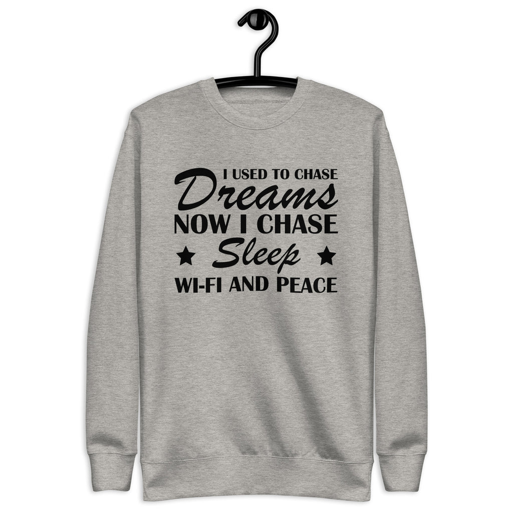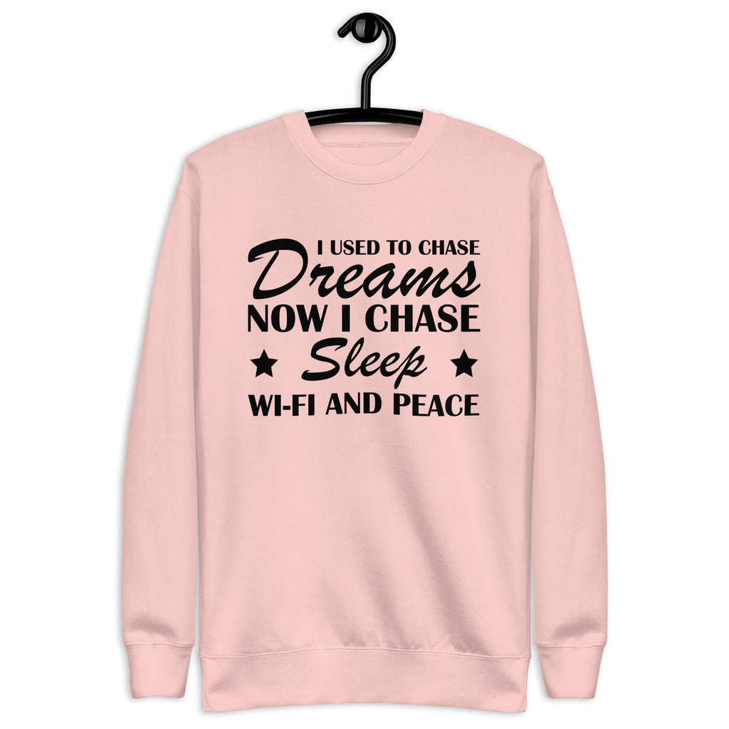 Once upon a time, you chased wild dreams. Now? You chase the real treasures of adulthood: sleep, Wi-Fi, and a little bit of peace. This “I Used to Chase Dreams, Now I Chase Sleep, Wi-Fi, and Peace” sweatshirt perfectly captures the glow-up from ambition to pure survival priorities.