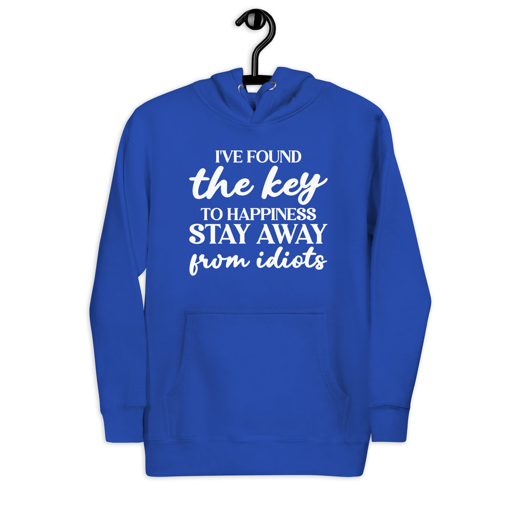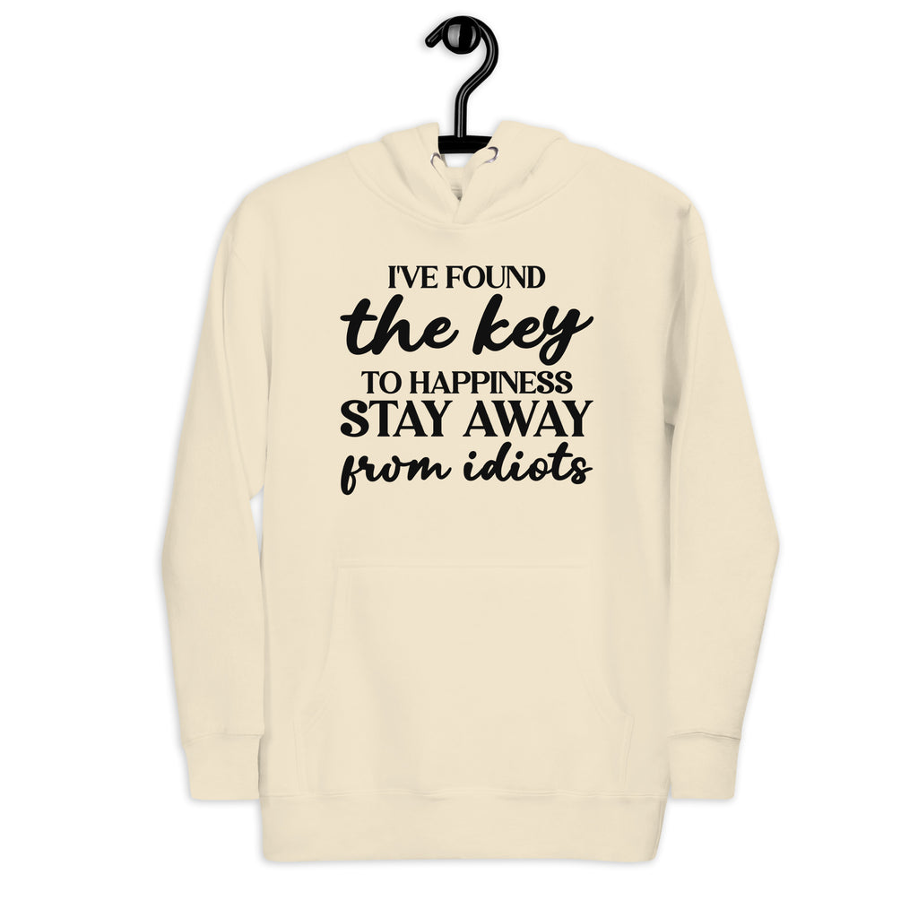 Stay warm and witty with the “I’ve Found the Key to Happiness Stay Away from Idiots” hoodie. Designed for those who appreciate a little sarcasm with their style, this hoodie delivers comfort and humor in one bold package. Whether you’re out and about, relaxing at home, or dodging the people who inspired the quote, this piece has you covered.