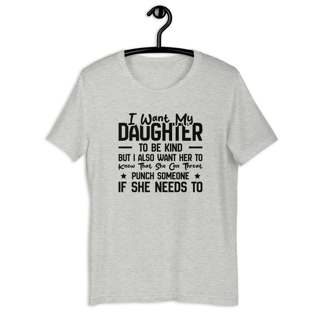 Let everyone know you’re raising a daughter who’s sweet and strong with the “I Want My Daughter to Be Kind, But I Also Want Her to Know She Can Throat Punch Someone If She Needs To” T-shirt. This tee delivers a hilarious mix of protective-parent energy, fierce love, and unapologetic realness — perfect for moms who believe in kindness but also in teaching their girls to stand up for themselves.