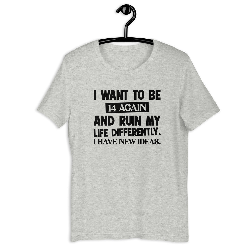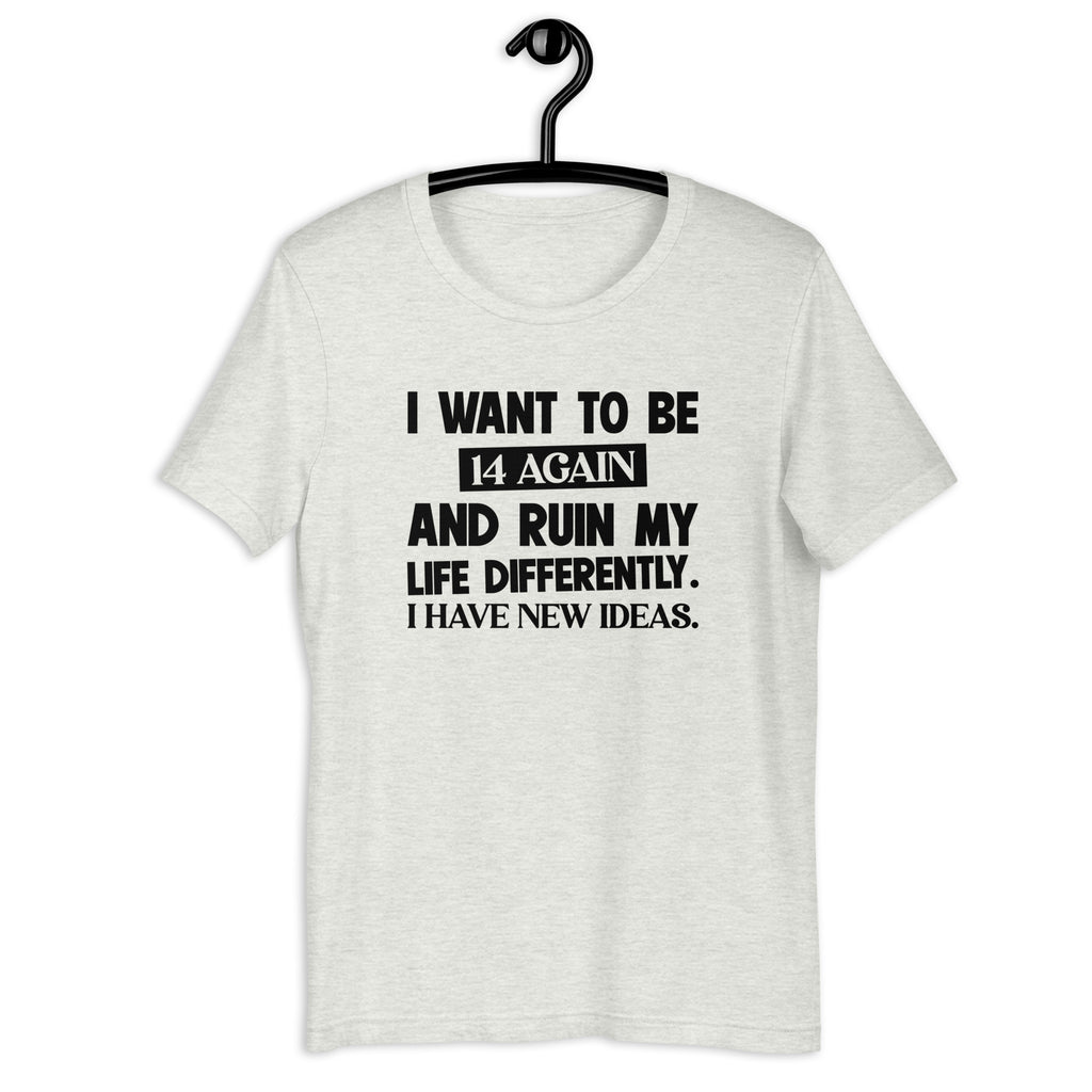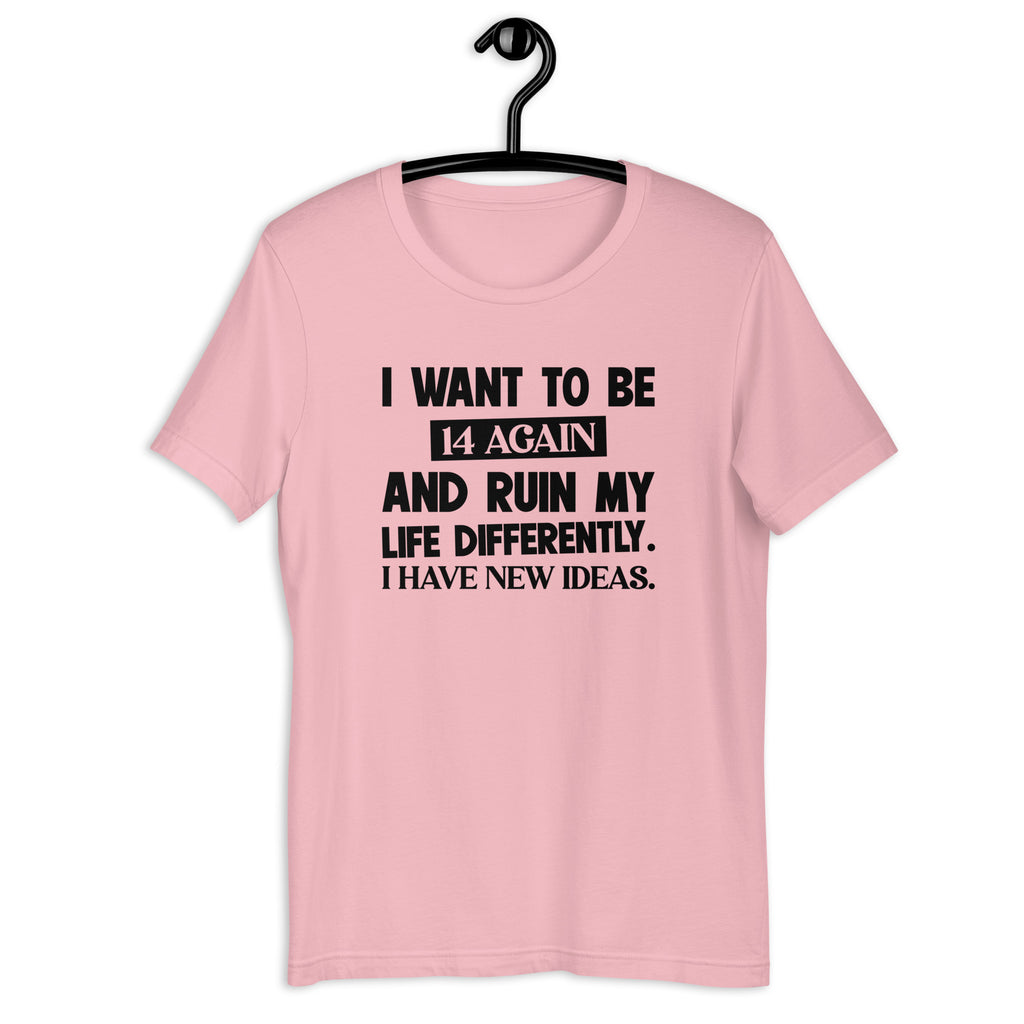 Hit rewind with the “I Want to Be 14 Again and Ruin My Life Differently — I Have New Ideas” t-shirt. Perfect for anyone who’s ever wished for a do-over (but with better plans), this shirt mixes nostalgia with dark humor for a hilariously honest statement piece.