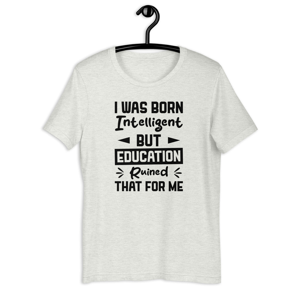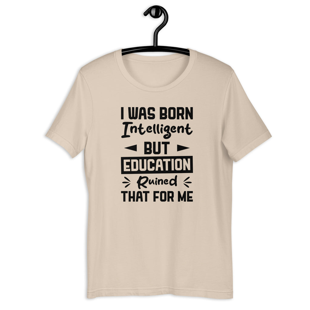 Smart, sarcastic, and academically betrayed — this “I Was Born Intelligent, But Education Ruined That for Me” t-shirt is for the ones who survived school with humor, trauma, and just enough brain cells left to joke about it. Perfect for former honor-roll kids turned burnt-out adults, class clowns with hidden genius, and anyone who knows textbooks don't teach real-life skills like sarcasm and strategic chaos.
