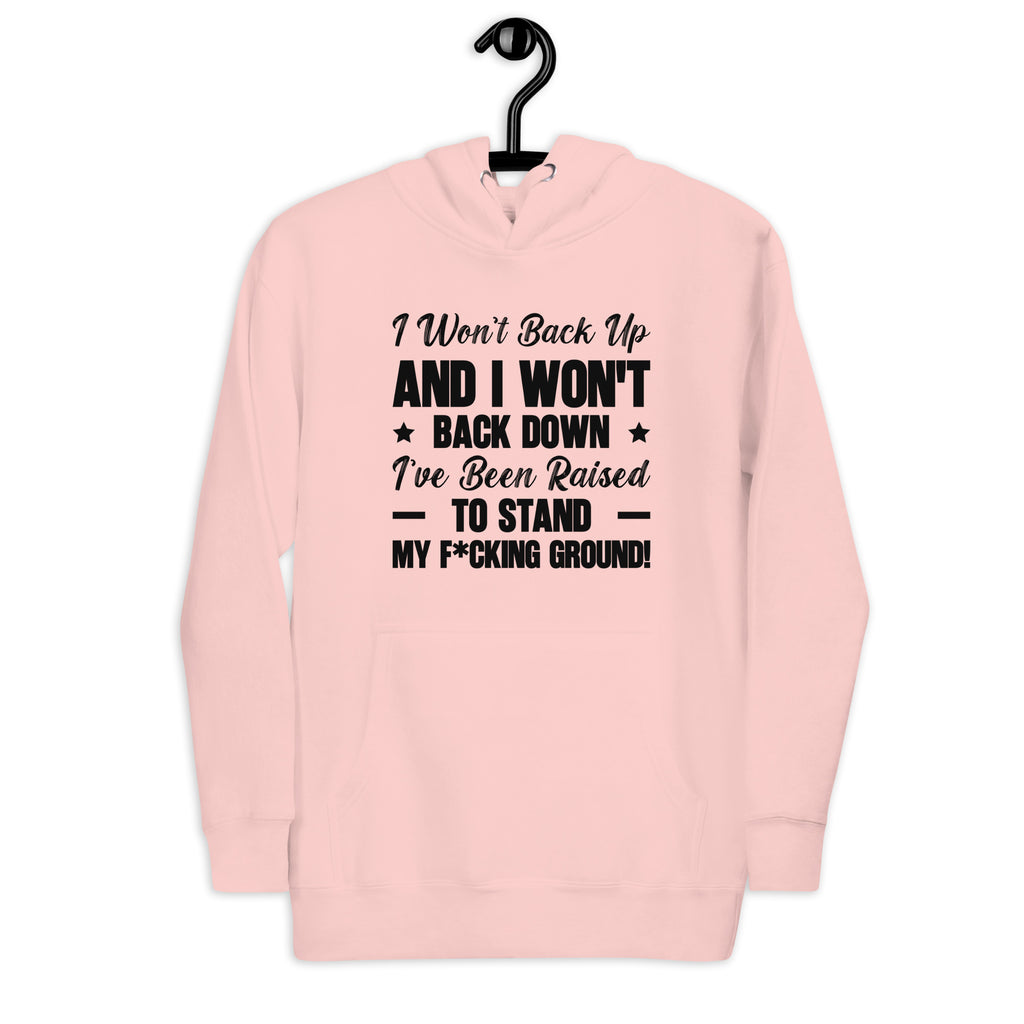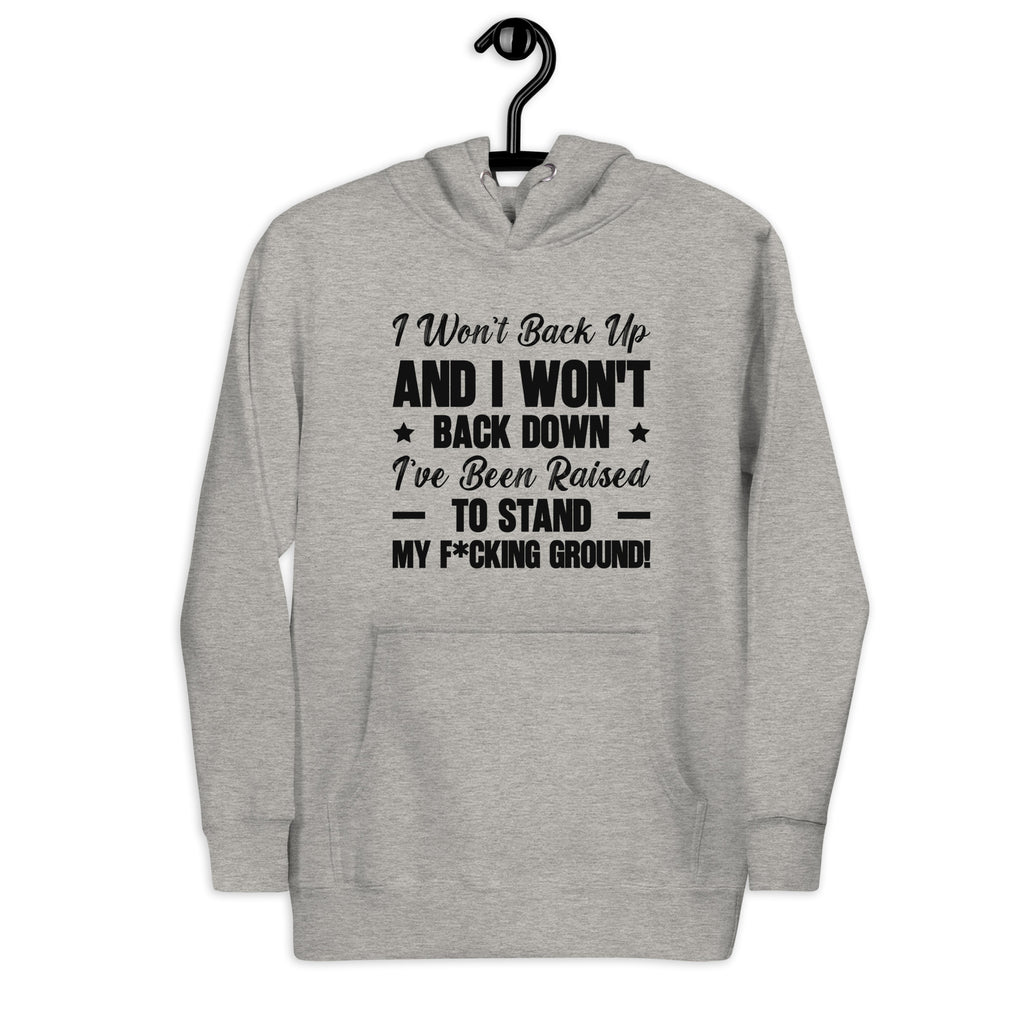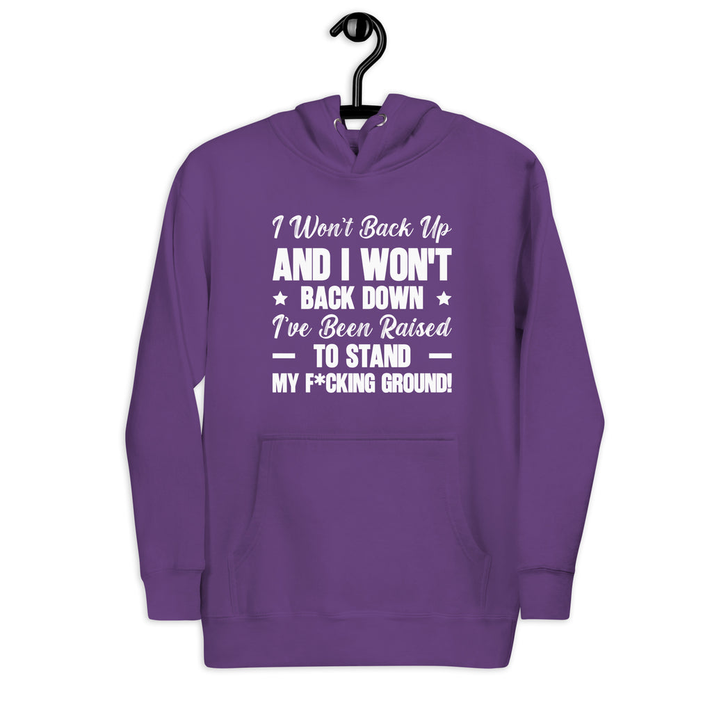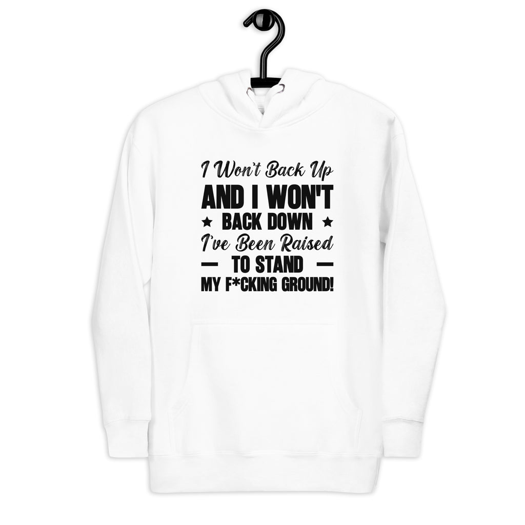 Fearless, bold, and unapologetically confident. The “I Won’t Back Up and I Won’t ★ Back Down — I’ve Been Raised to Stand My F*cking Ground!” hoodie is a declaration of strength and unwavering self-respect. It’s for anyone who refuses to compromise on their values or let anyone push them around.