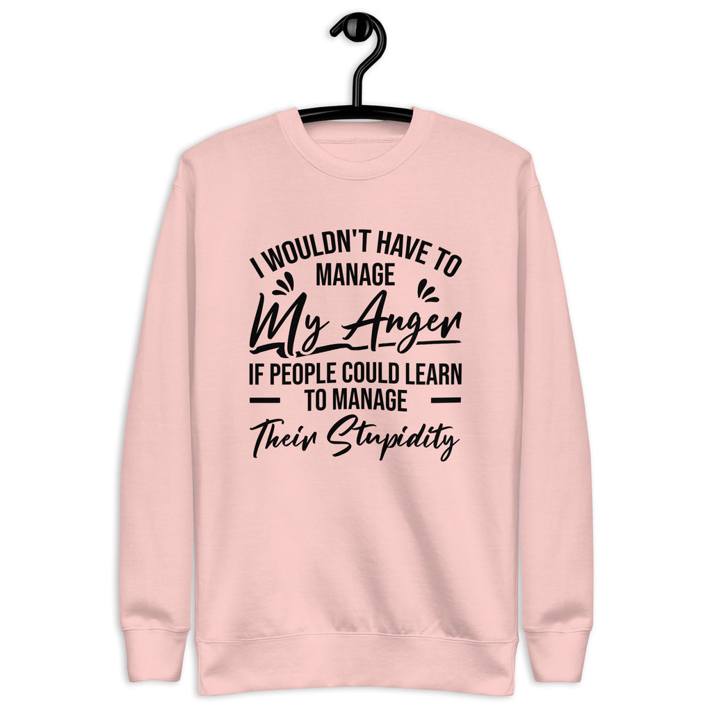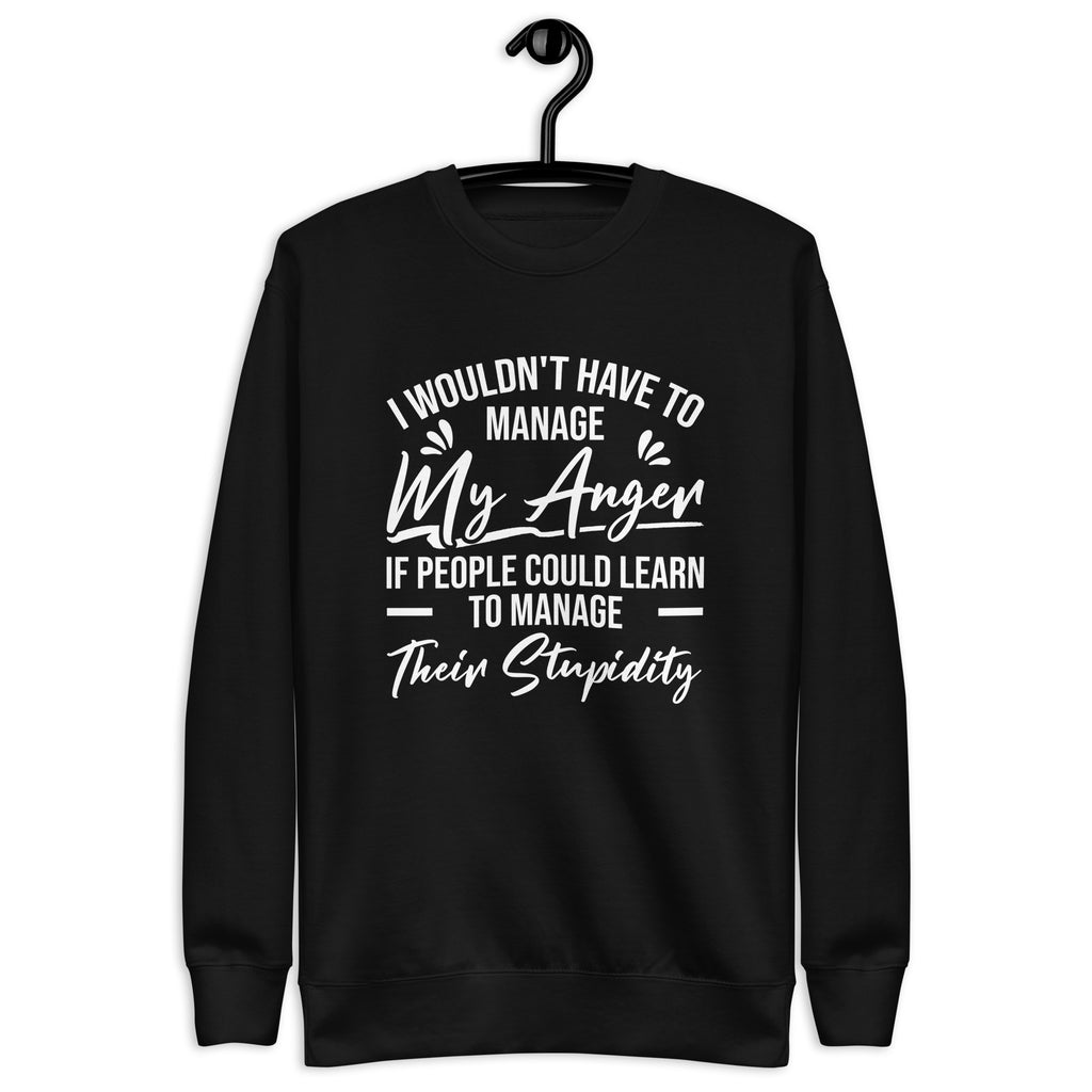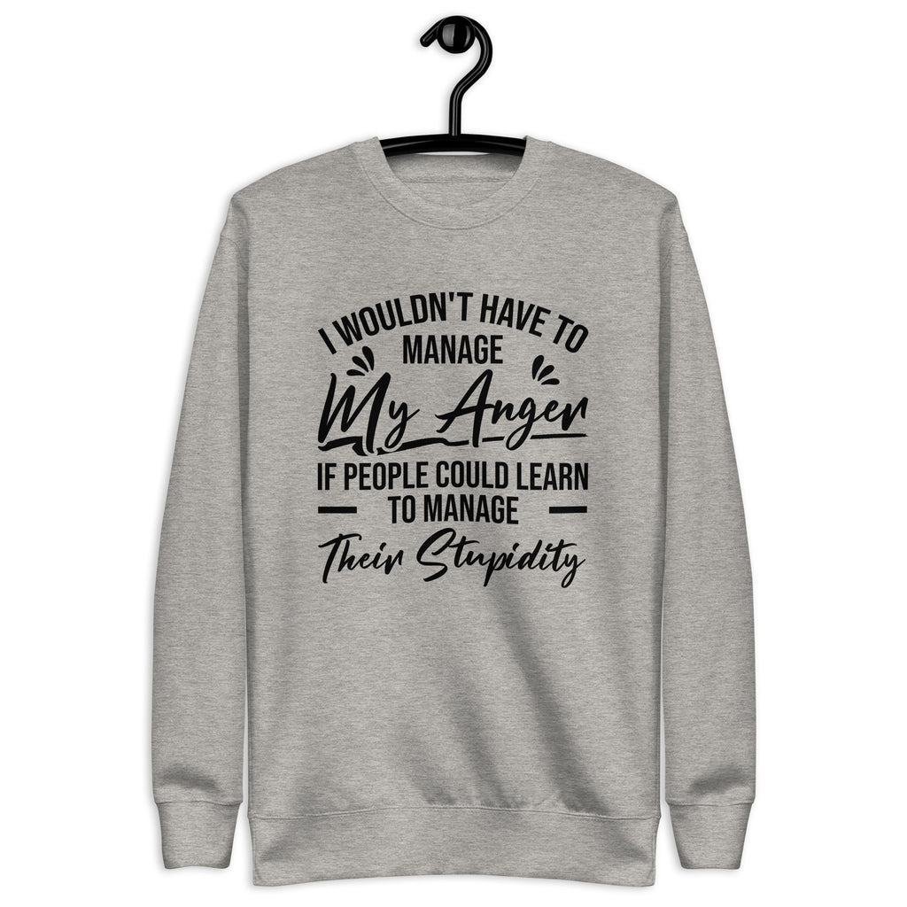 Blunt, relatable, and unapologetically honest. The “I Wouldn’t Have to Manage My Anger If People Could Learn to Manage Their Stupidity” sweatshirt is made for those who’ve mastered self-control—despite constant testing. It delivers sharp humor with confidence, turning everyday frustration into a statement piece.