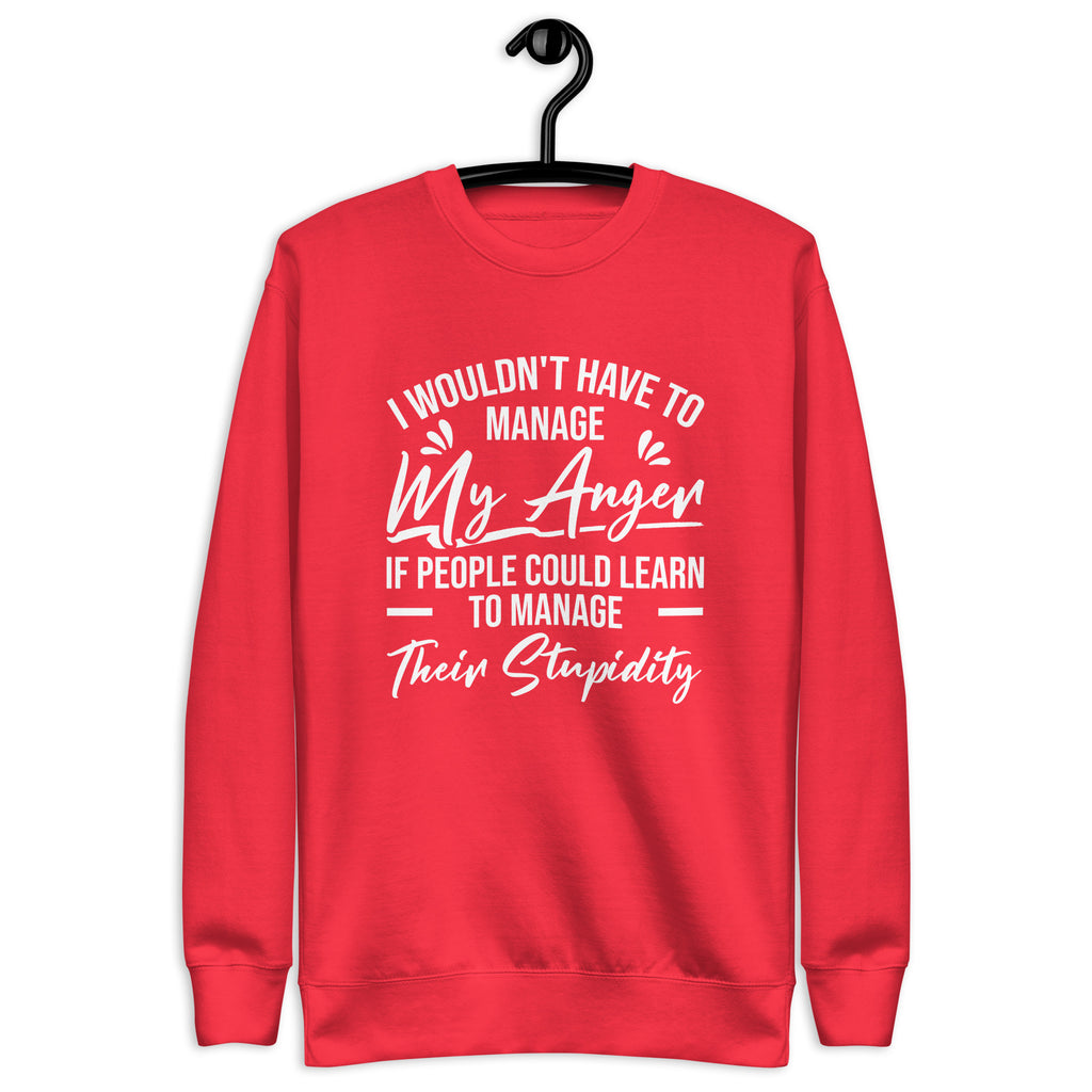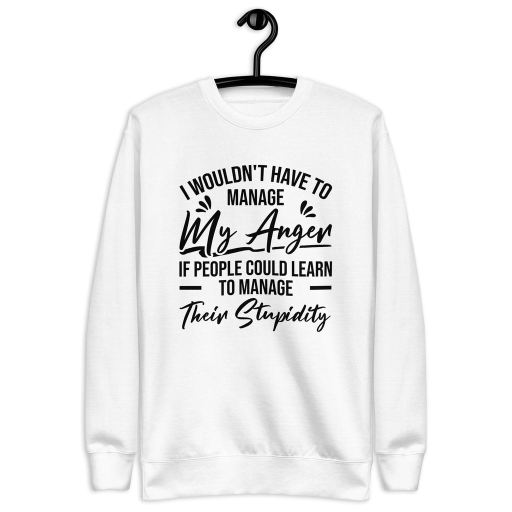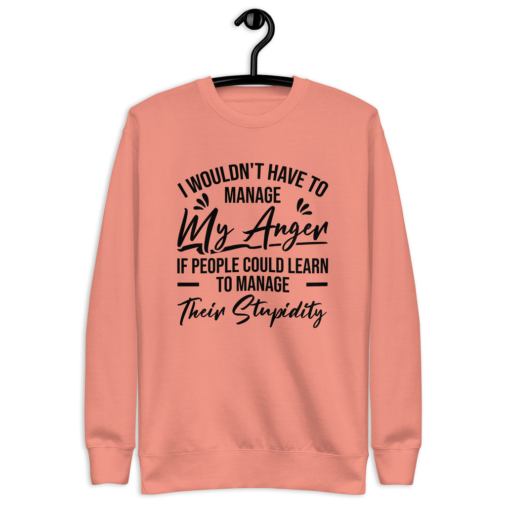 Blunt, relatable, and unapologetically honest. The “I Wouldn’t Have to Manage My Anger If People Could Learn to Manage Their Stupidity” sweatshirt is made for those who’ve mastered self-control—despite constant testing. It delivers sharp humor with confidence, turning everyday frustration into a statement piece.