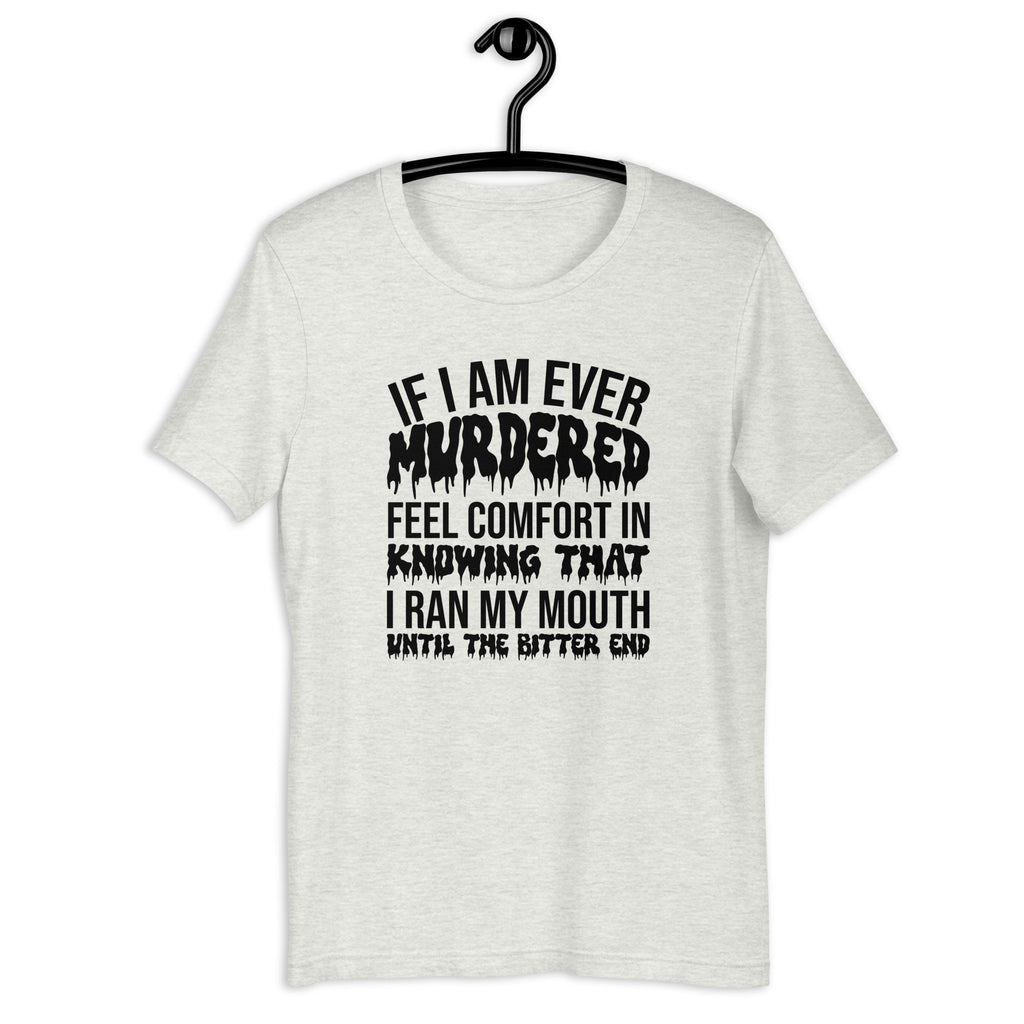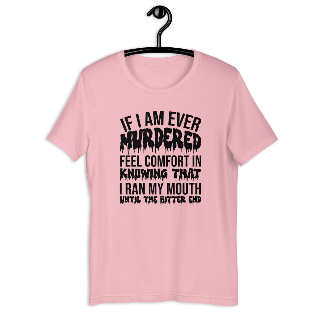 For the unapologetically outspoken. The “If I’m Ever Murdered Feel Comfort in Knowing That I Ran My Mouth Until the Bitter End” t-shirt is equal parts savage and hilarious. Perfect for anyone whose sharp tongue and fearless honesty define them, this tee proudly embraces the art of speaking your mind—no matter the cost.