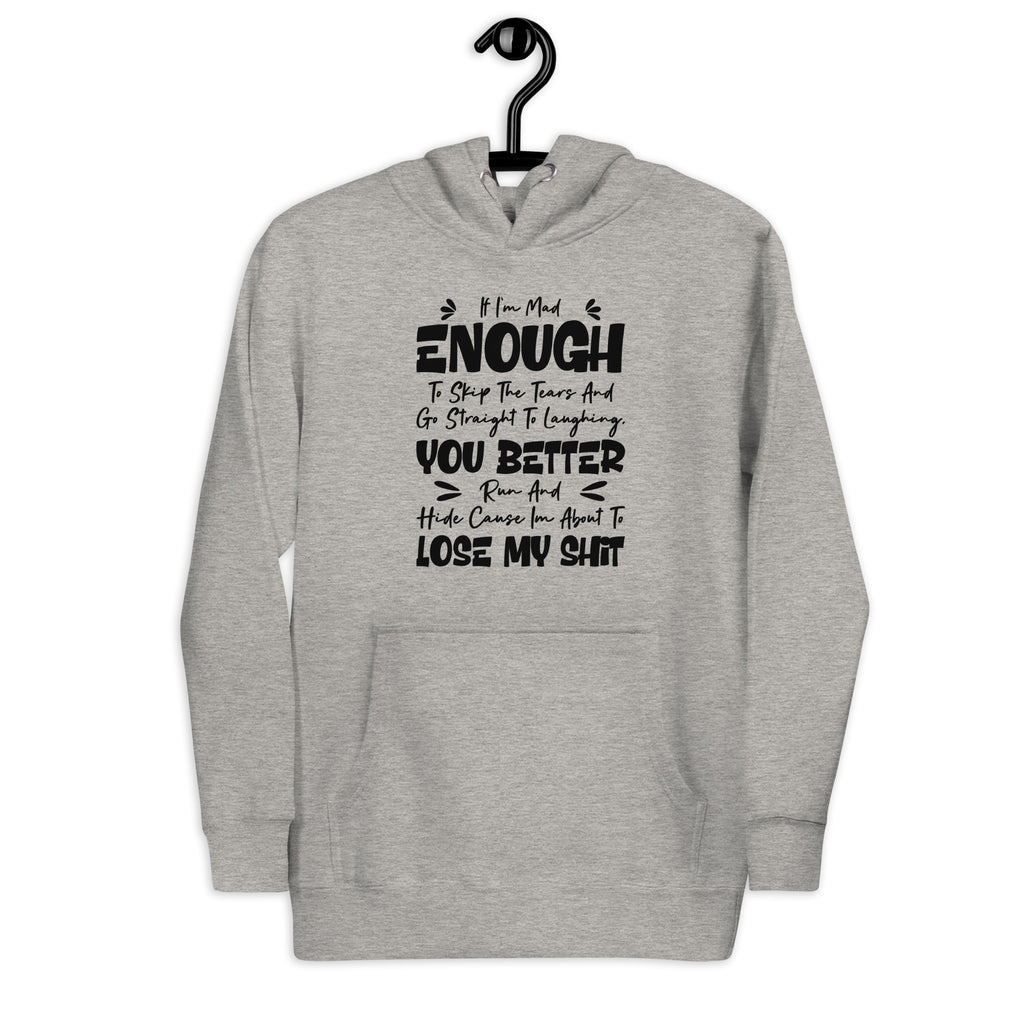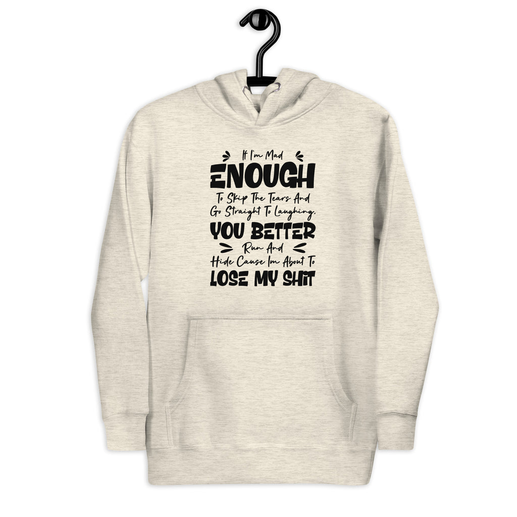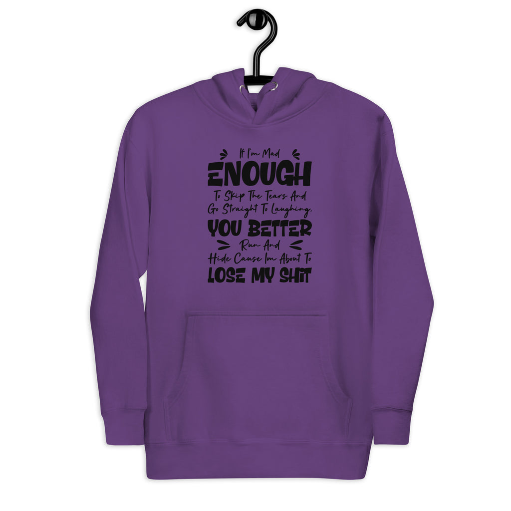 Stay warm and warn the world with this “If I’m Mad Enough to Skip the Tears and Go Straight to Laughing, You Better Run and Hide ‘Cause I’m About to Lose My Sh*t” hoodie! Perfect for the dramatic reactors, emotional tornadoes, and lovable loose cannons who laugh right before the chaos hits, this hoodie delivers comedy and caution.