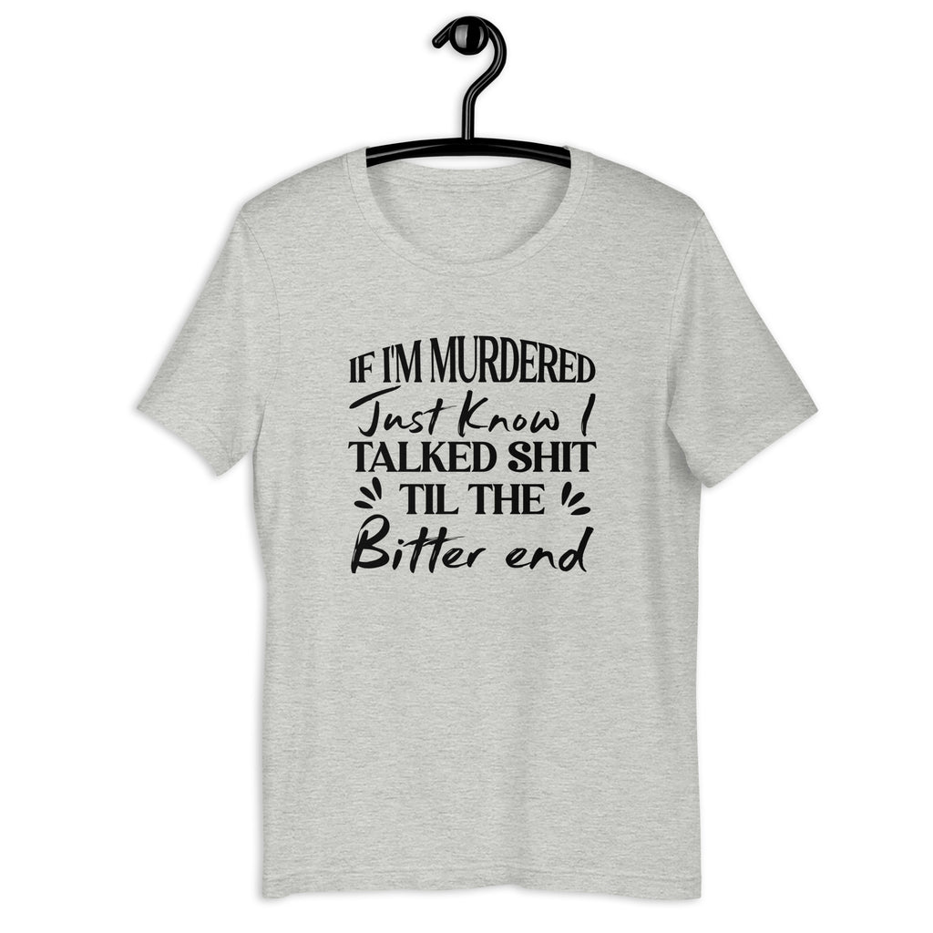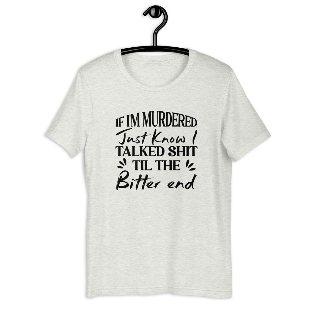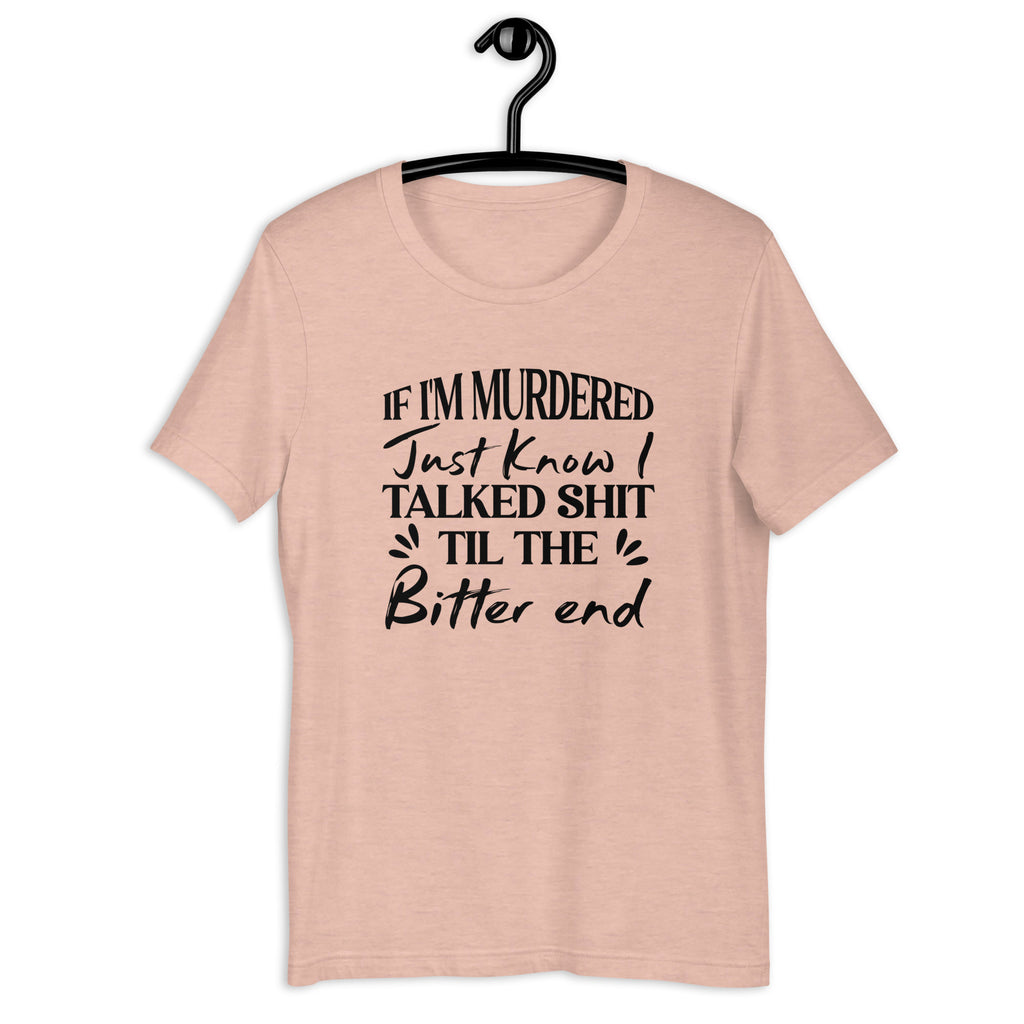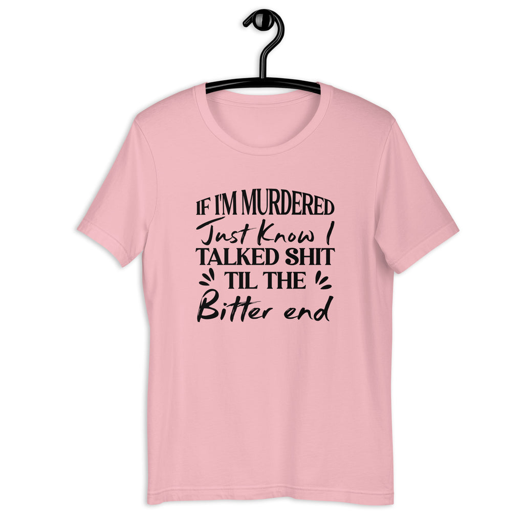Make a fearless statement with the “If I Murdered Just Know I Talked Sh*t Til the Bitter End” t-shirt. Perfect for anyone with a sharp tongue and unapologetic attitude, this tee brings dark humor and sass together in one unforgettable design.
