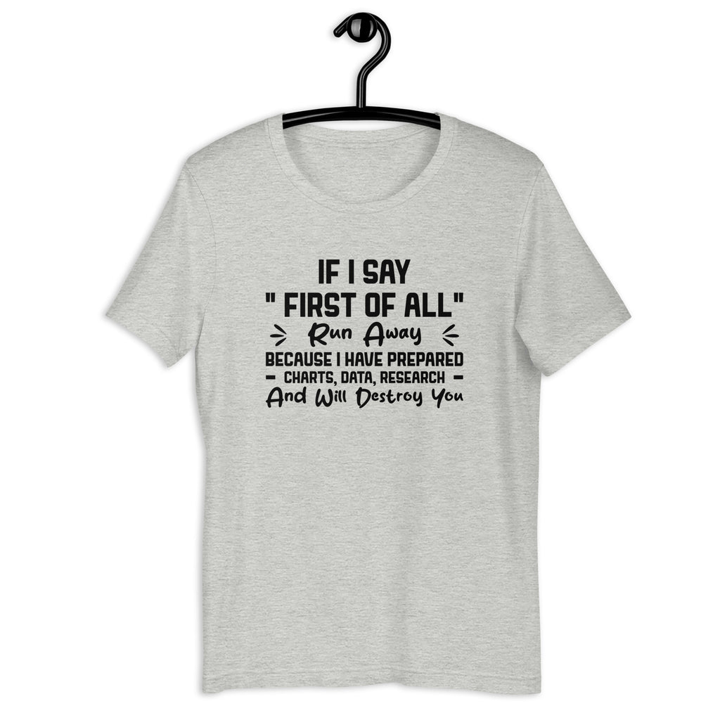 Give everyone a hilarious but serious warning with the “If I Say ‘First of All’ — Run Away” T-shirt — the perfect tee for anyone who argues with facts, receipts, and a fully documented breakdown ready to go. This shirt lets people know that once you say “first of all,” it’s already too late — the charts, data, and research are loaded, and someone’s about to get verbally demolished.
