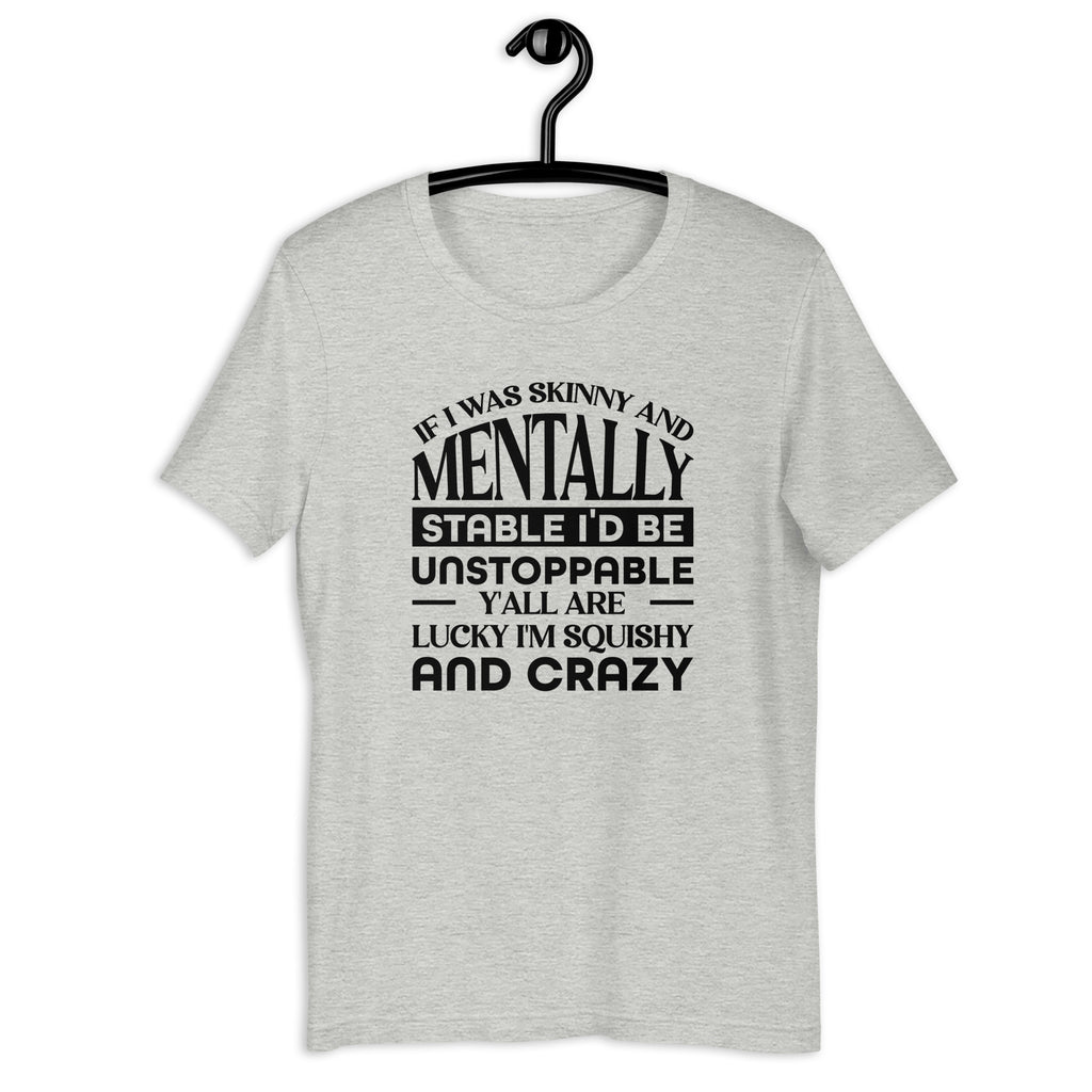 Show off your humor and confidence with the “If I Was Skinny and Mentally Stable, I’d Be Unstoppable — Y’all Are Lucky I’m Squishy and Crazy” T-shirt. This funny and relatable tee is perfect for anyone who embraces their imperfections, loves to laugh, and knows they’re fabulous just the way they are.