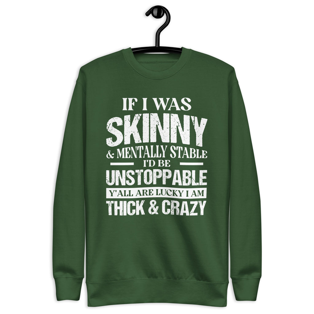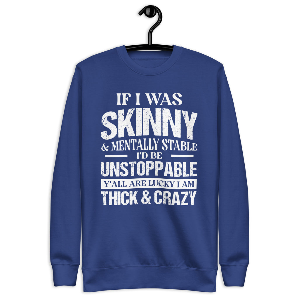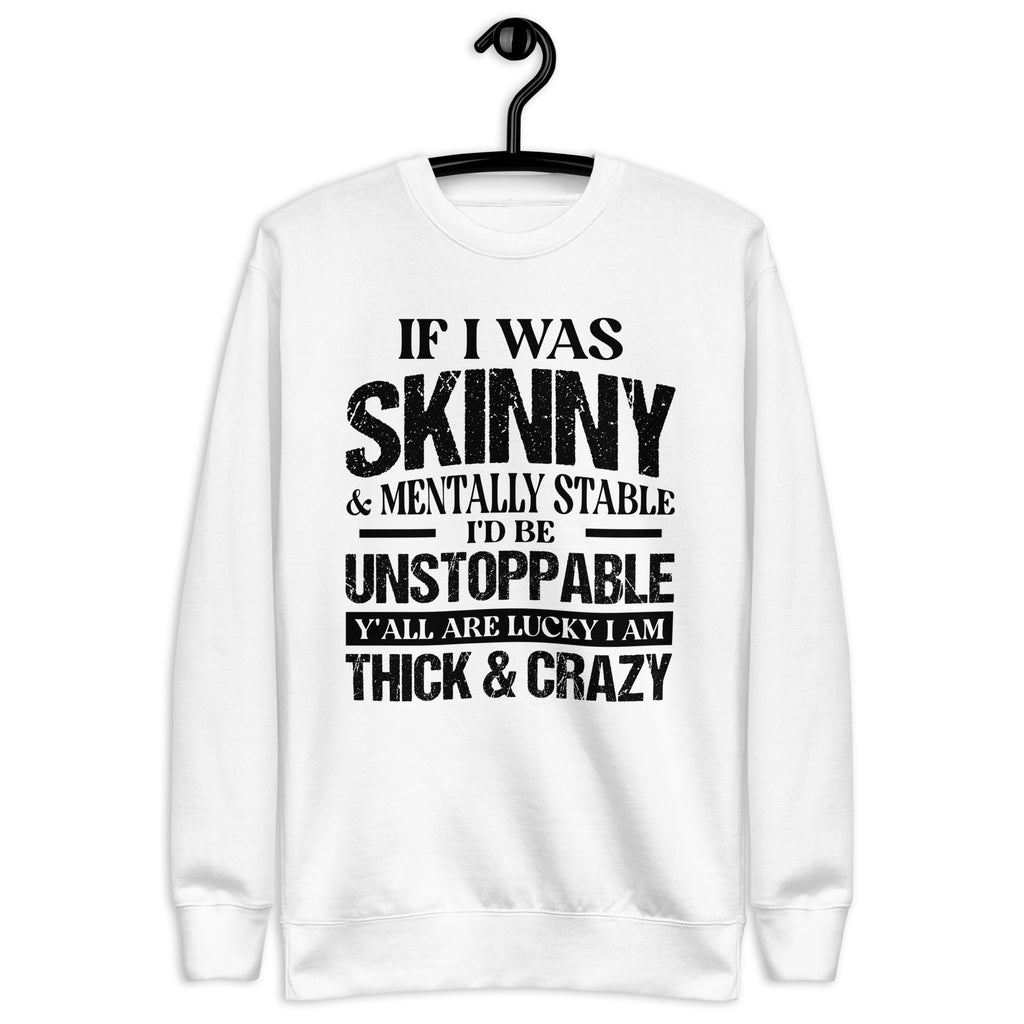 Turn heads and embrace your unapologetic attitude with the “If I Was Skinny and Mentally Stable I Would Be Unstoppable — Y’all Are Lucky I’m Thick and Crazy” sweatshirt. Funny, fierce, and fearless, this piece is perfect for anyone who owns their flaws and still shines with confidence.