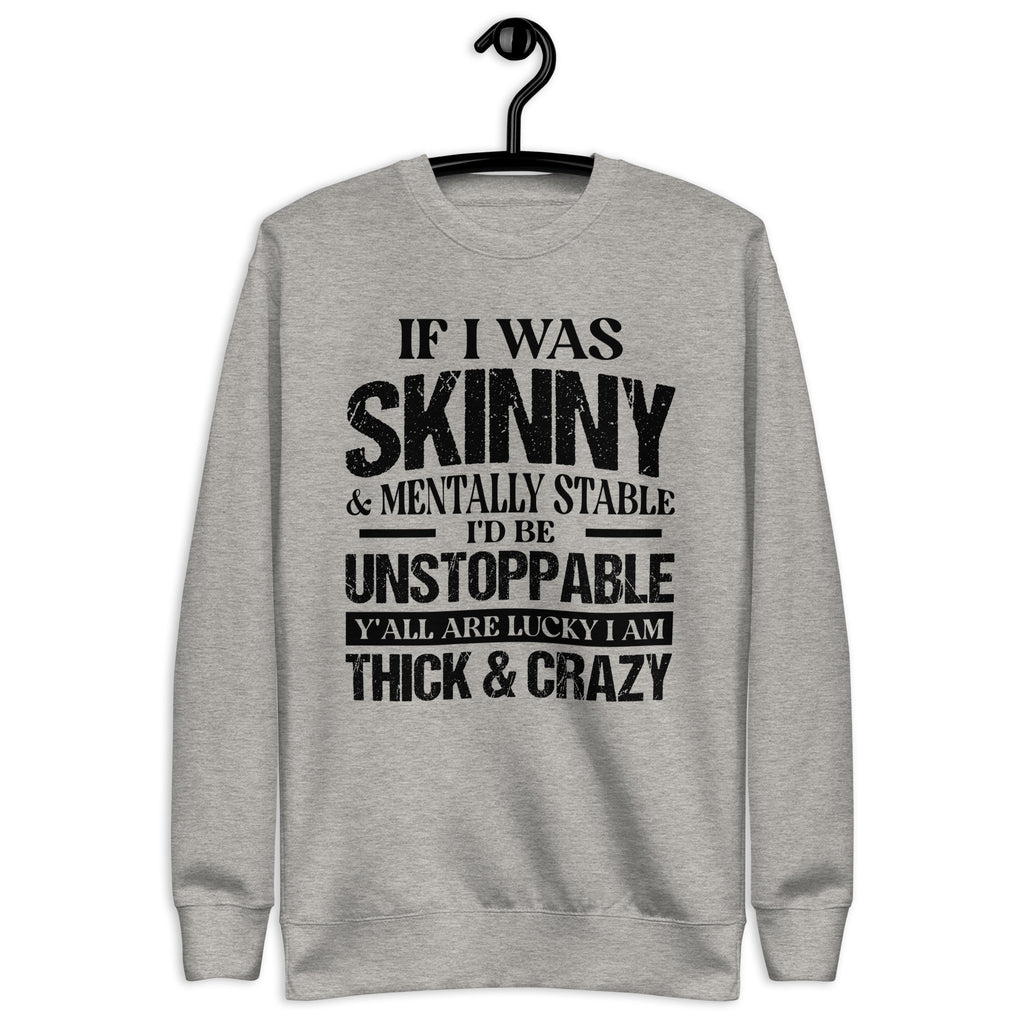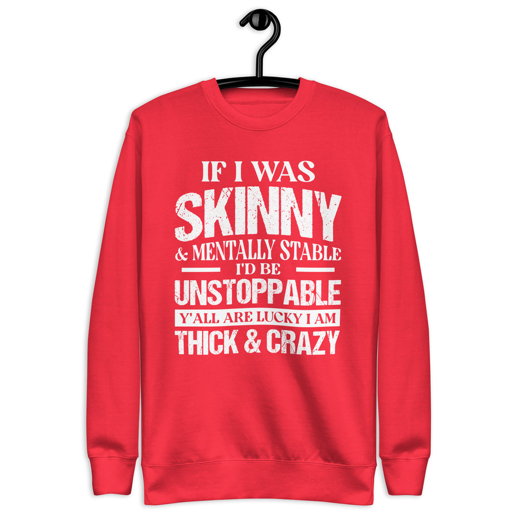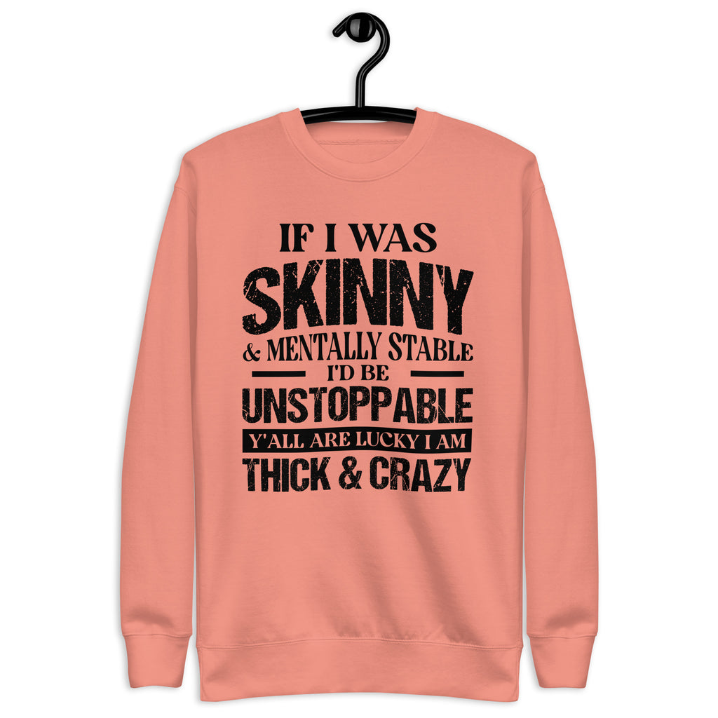Turn heads and embrace your unapologetic attitude with the “If I Was Skinny and Mentally Stable I Would Be Unstoppable — Y’all Are Lucky I’m Thick and Crazy” sweatshirt. Funny, fierce, and fearless, this piece is perfect for anyone who owns their flaws and still shines with confidence.