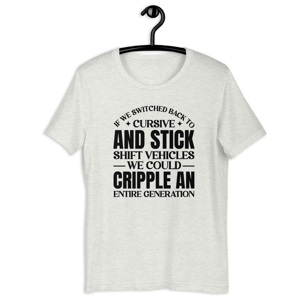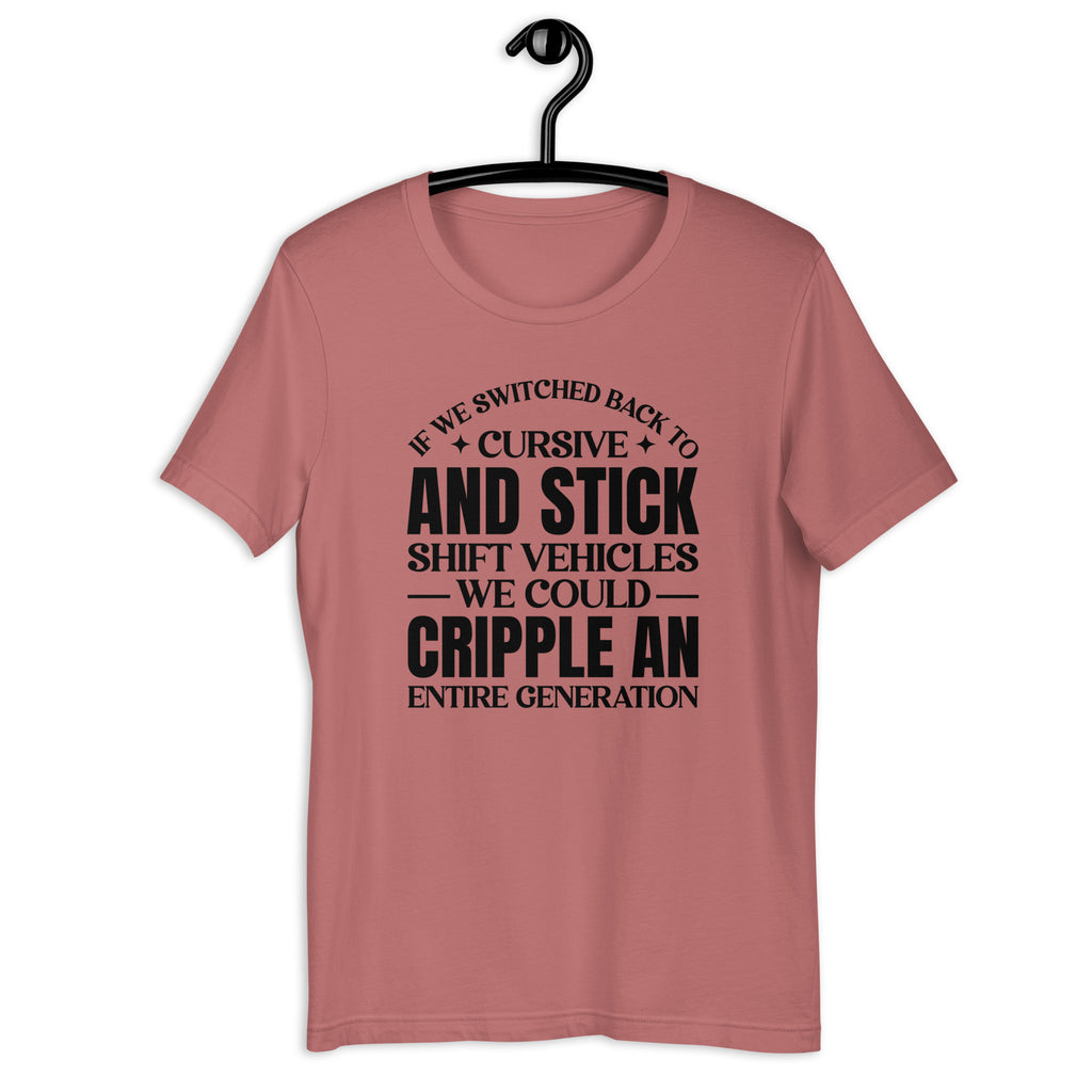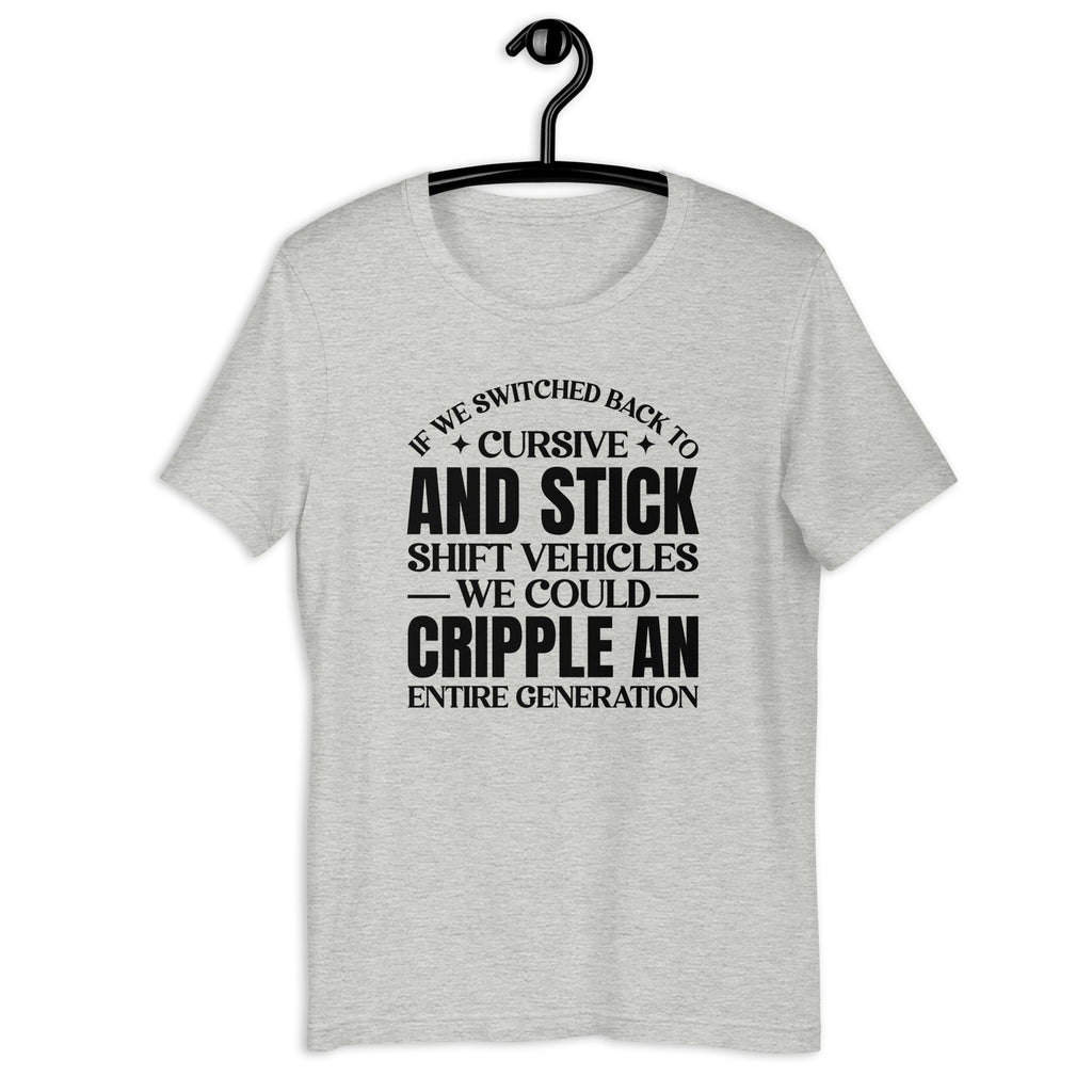 Old school skills: 1. Modern generation: 0. This “If We Switched Back to Cursive and Stick Shift Vehicles, We Could Cripple an Entire Generation” t-shirt is a hilarious nod to the lost arts that once came standard.