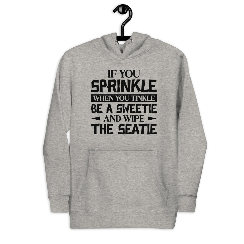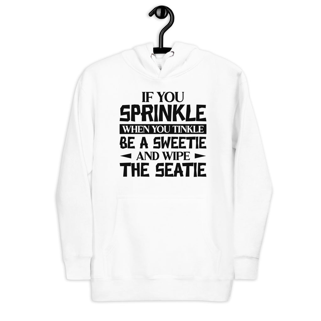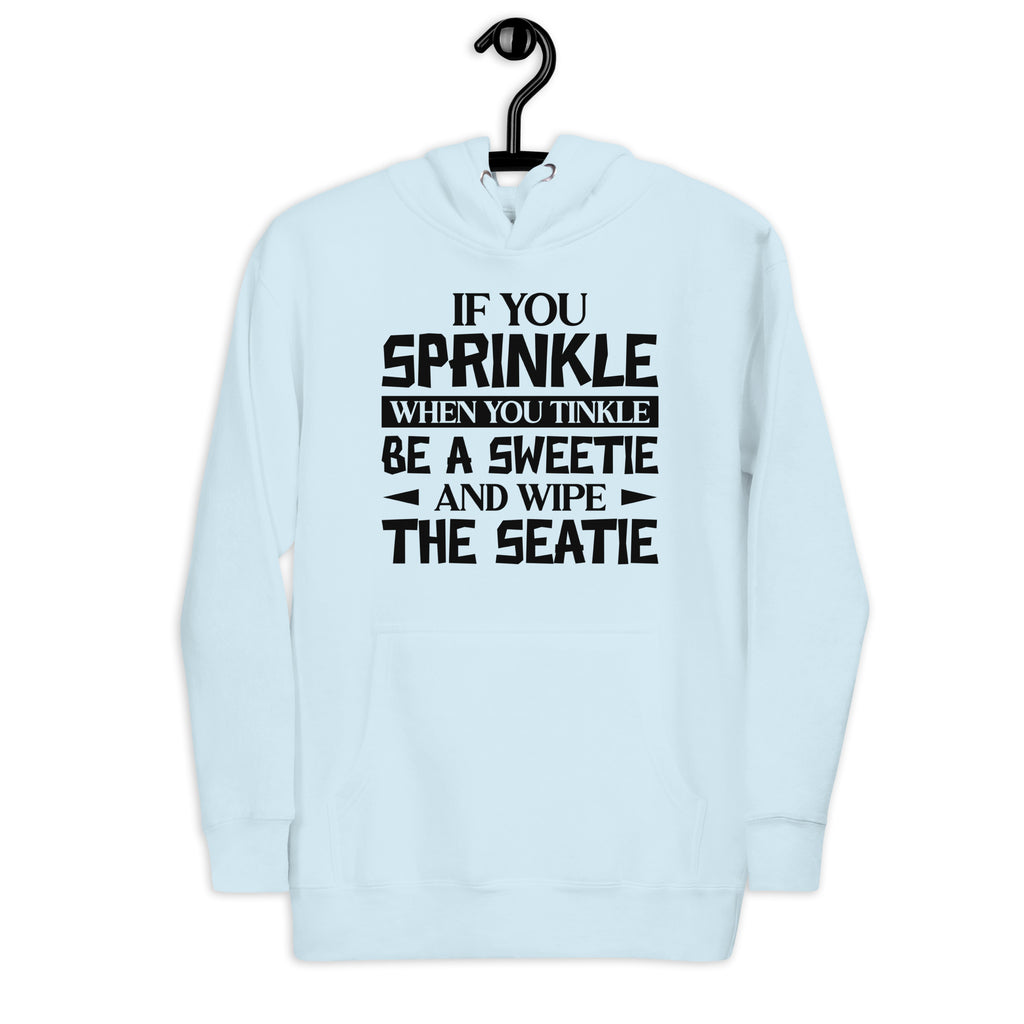 Keep it lighthearted and funny with the “If You Sprinkle When You Tinkle, Be a Sweetie and Wipe the Seatie” hoodie. Perfect for anyone who loves a good laugh and believes in keeping things clean, this cozy hoodie turns a classic bathroom reminder into a hilarious fashion statement.