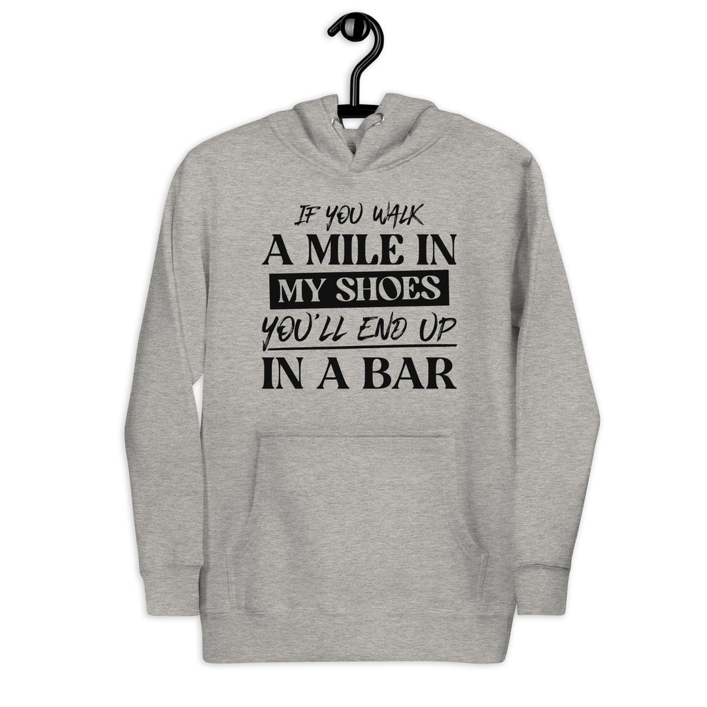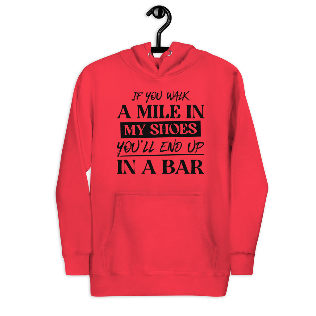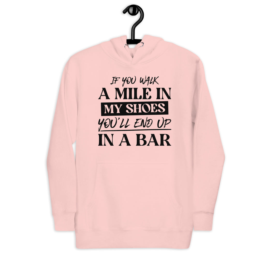 If you walk a mile in my shoes, you won’t just understand me — you’ll end up at the bar wondering how we got here. This “If You Walk a Mile in My Shoes, You’ll End Up in a Bar” hoodie is made for the beautifully chaotic souls who cope, celebrate, and problem-solve with a little humor and a well-deserved drink.