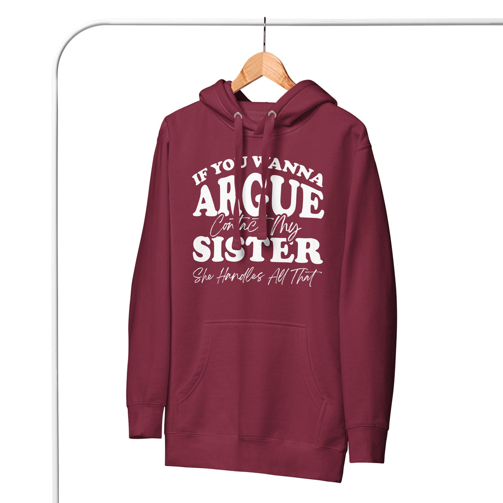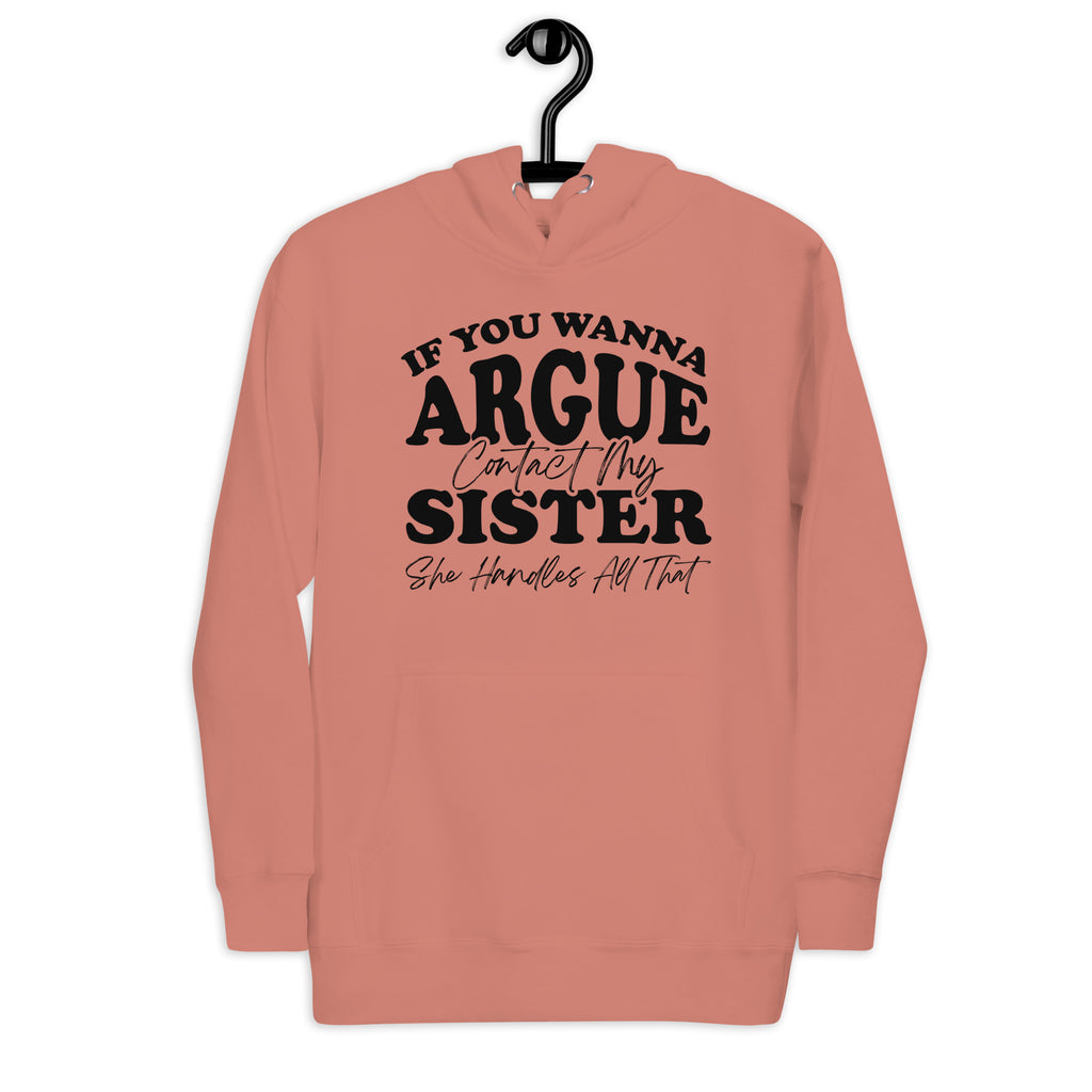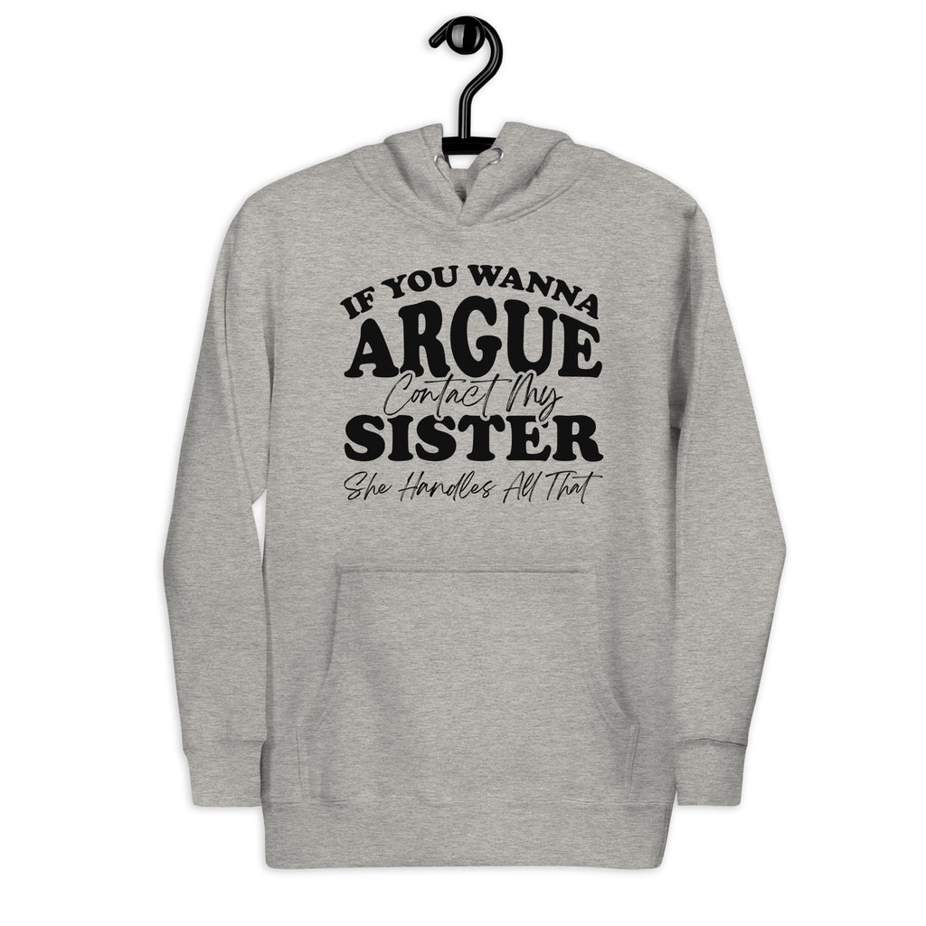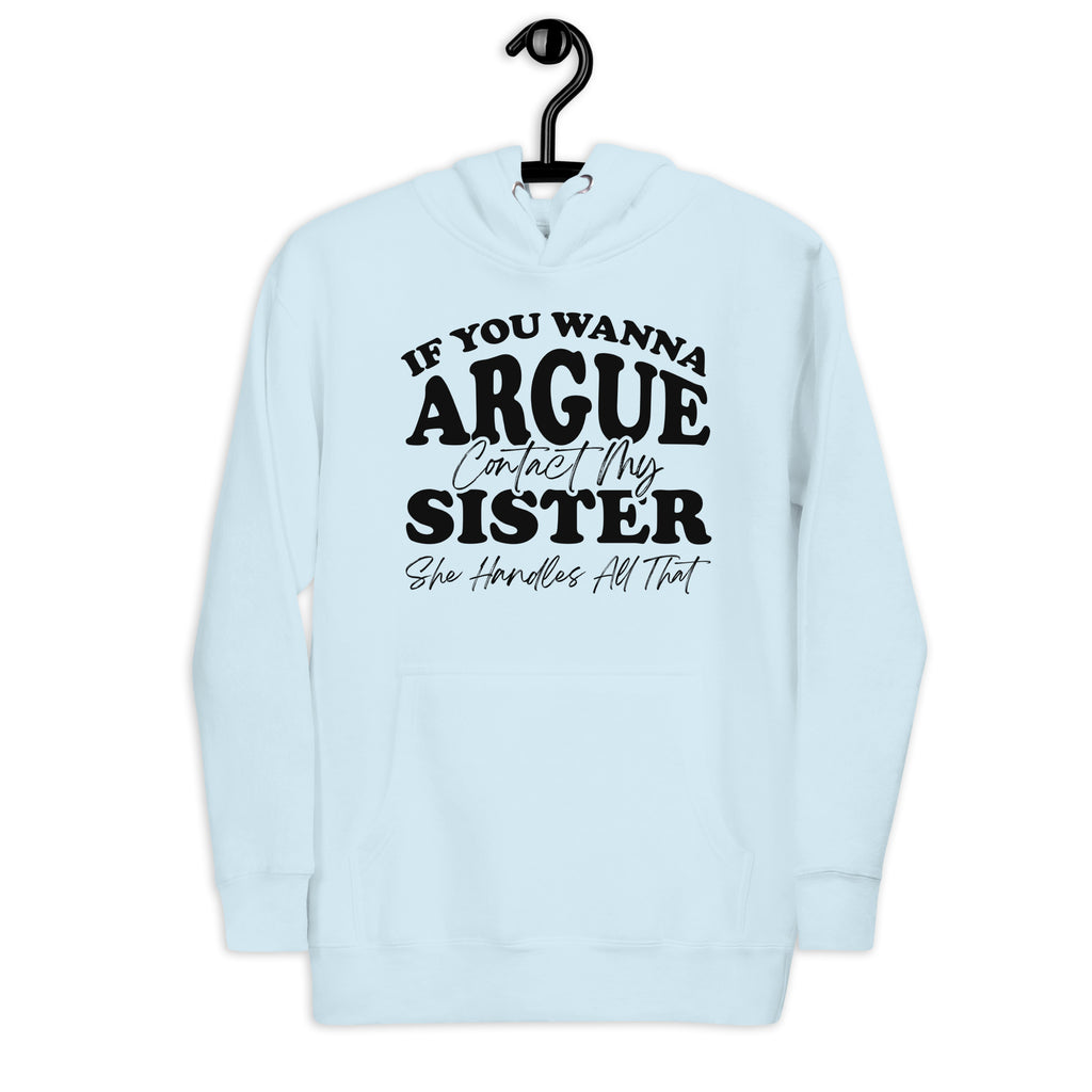 Skip the drama with this “If You Wanna Argue, Contact My Sister—She Handles All That” hoodie. Sarcastic, playful, and totally relatable, this hoodie is perfect for anyone who’s mastered the art of avoiding pointless arguments.