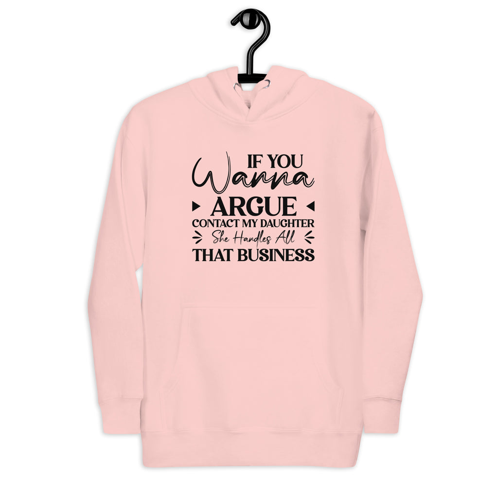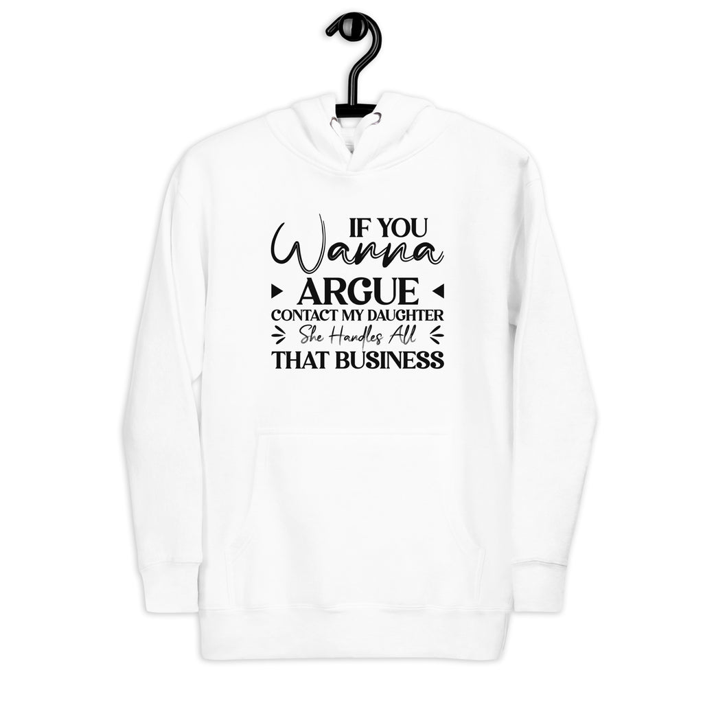 Funny, bold, and full of family attitude. The “If You Wanna Argue — She Handles All That Business. Contact My Daughter” hoodie is a playful declaration of passing the torch to the real boss. It blends humor with confidence, making it perfect for parents who know exactly who runs the argument department.