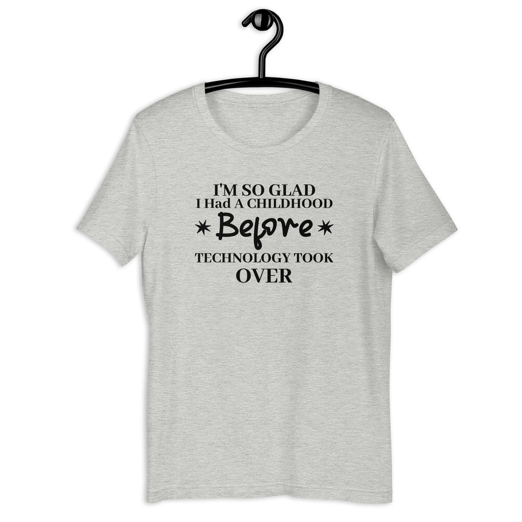 Take a trip down memory lane with the “I’m So Glad I Had a Childhood Before Technology Took Over” t-shirt. Perfect for anyone who remembers playing outside until the streetlights came on, swapping tapes or CDs, and actually talking face-to-face. This shirt is a fun, nostalgic nod to simpler times before screens and social media ruled the world.