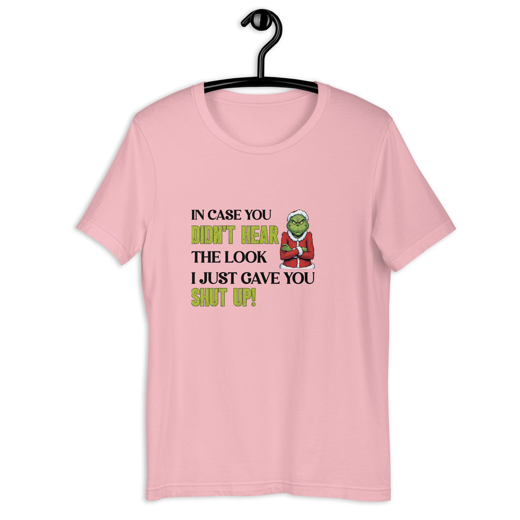Say it without words with the “In Case You Didn’t Hear the Look I Just Gave You… Shut Up!” T-shirt. Perfect for anyone who communicates with sass, attitude, and a killer glare, this tee turns body language into a bold fashion statement.