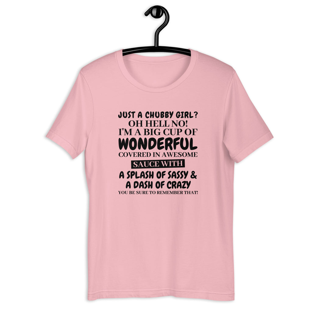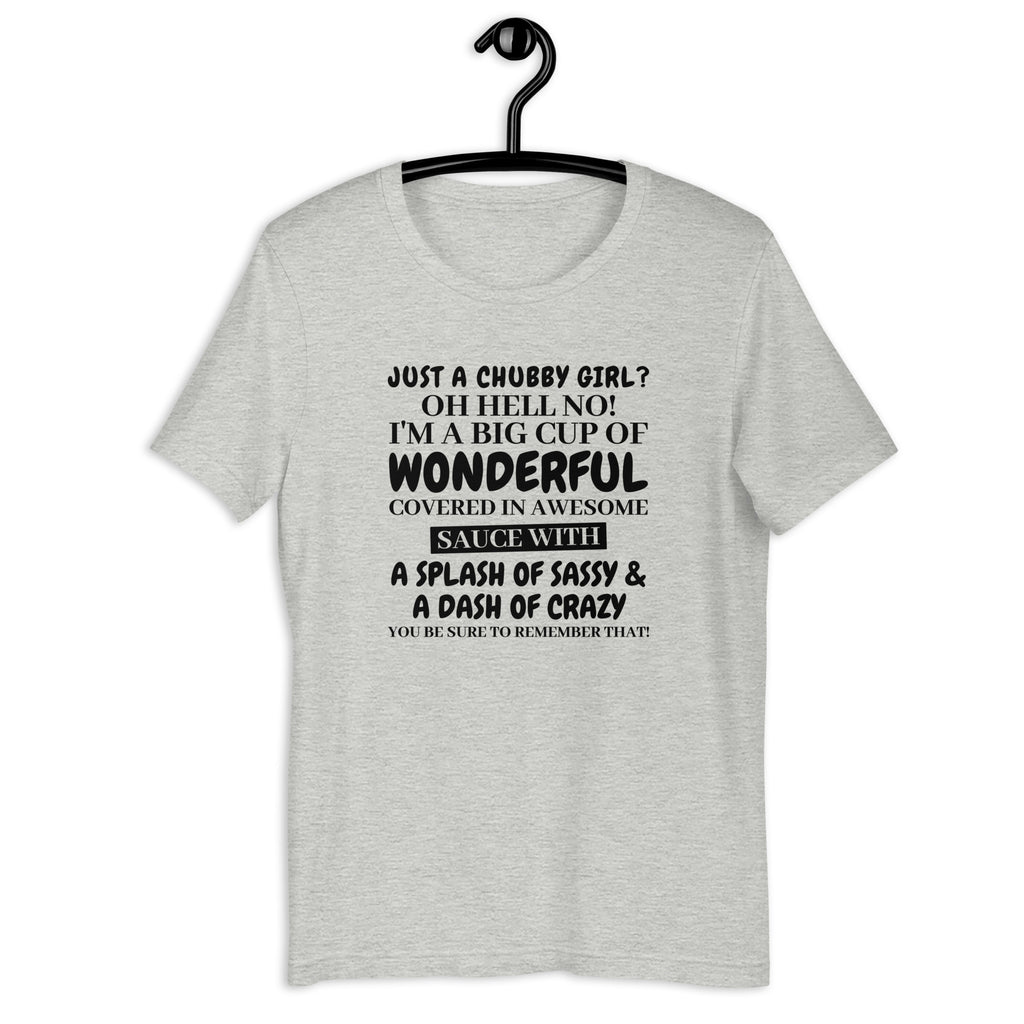 Sassy, bold, and full of confidence—this tee says it all! Featuring the hilarious and empowering phrase “Just a Chubby Girl? Oh Hell No, I’m a Big Cup of Wonderful Covered in Awesome Sauce with a Splash of Sassy,” this shirt is perfect for anyone who owns their attitude with pride.
