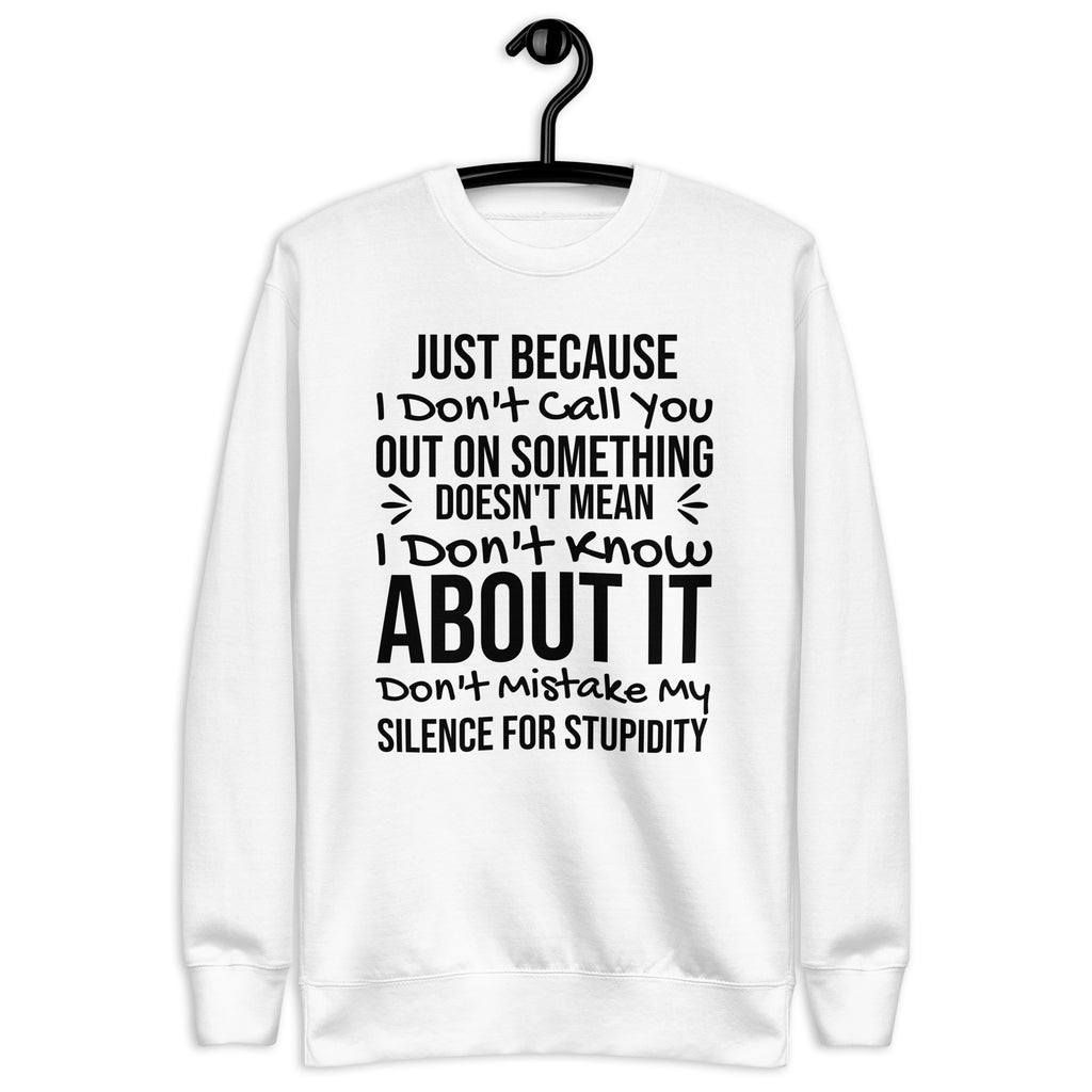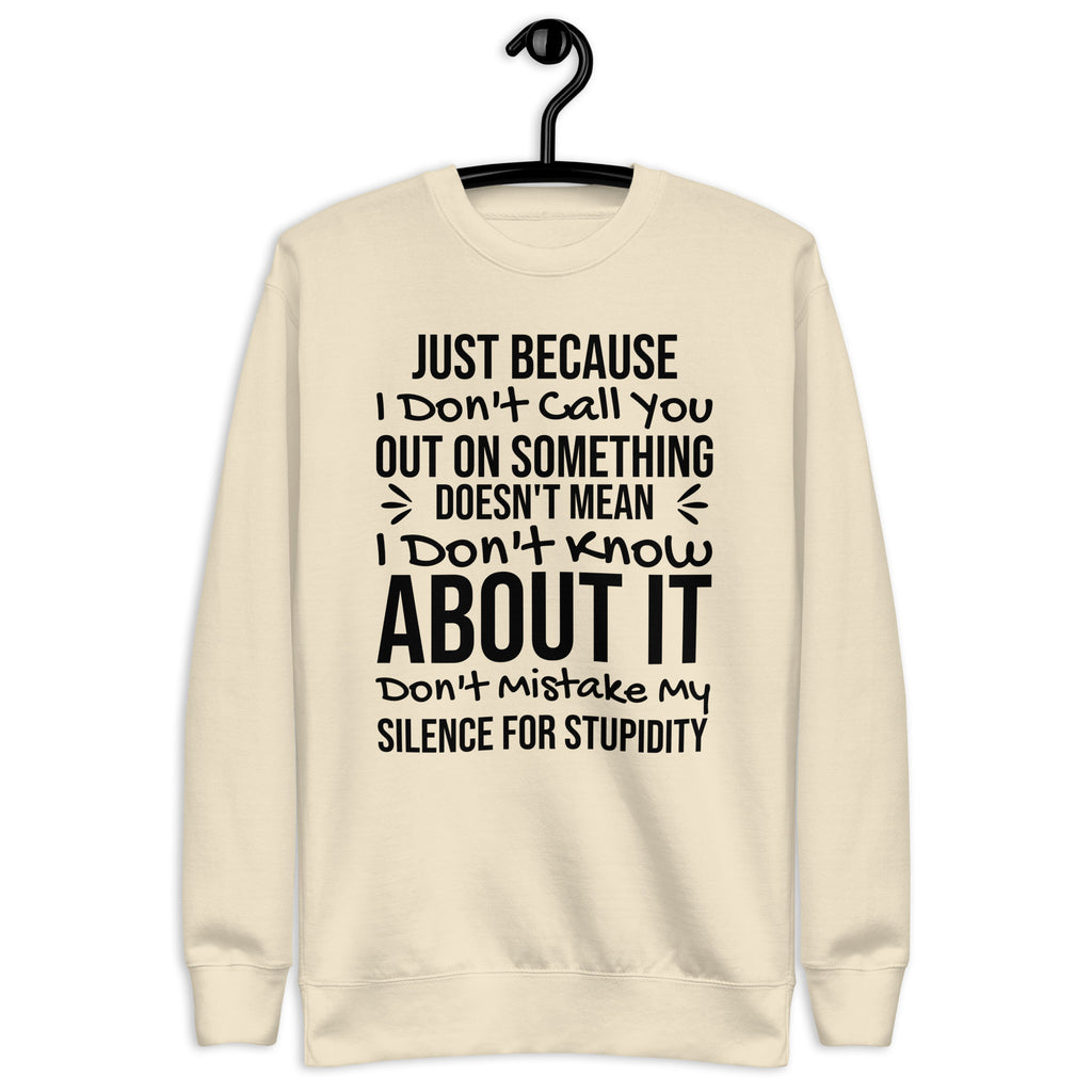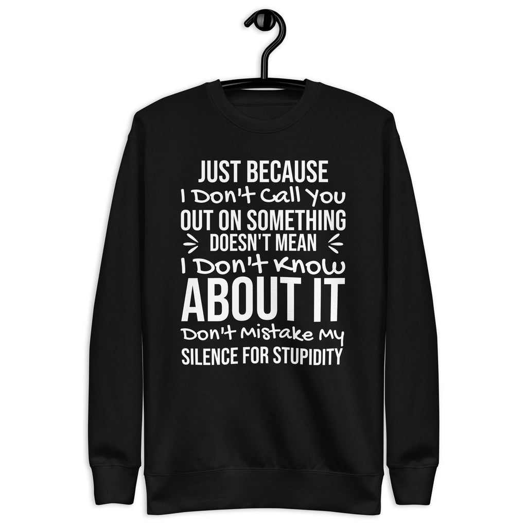 Stay bold and unapologetic in the “Just Because I Don’t Call You Out on Something Doesn’t Mean I Don’t Know About It — Don’t Mistake My Silence for Stupidity” sweatshirt. With its sharp and clever message, this design is perfect for anyone who values observation over confrontation and isn’t afraid to let their style do the talking.