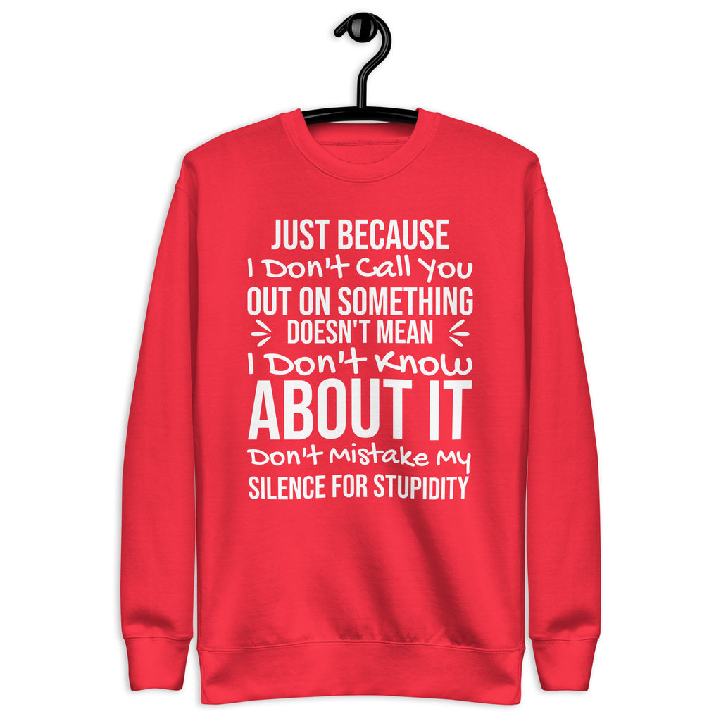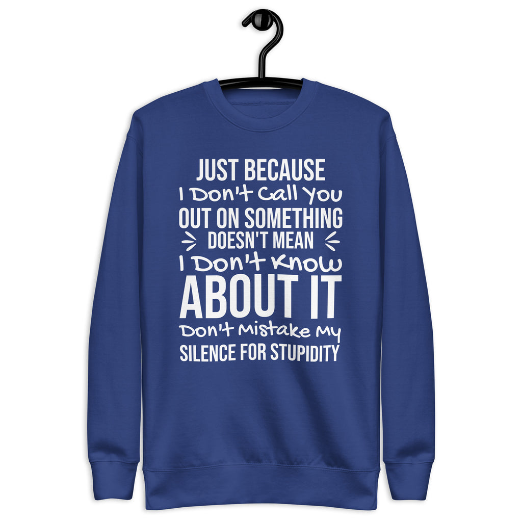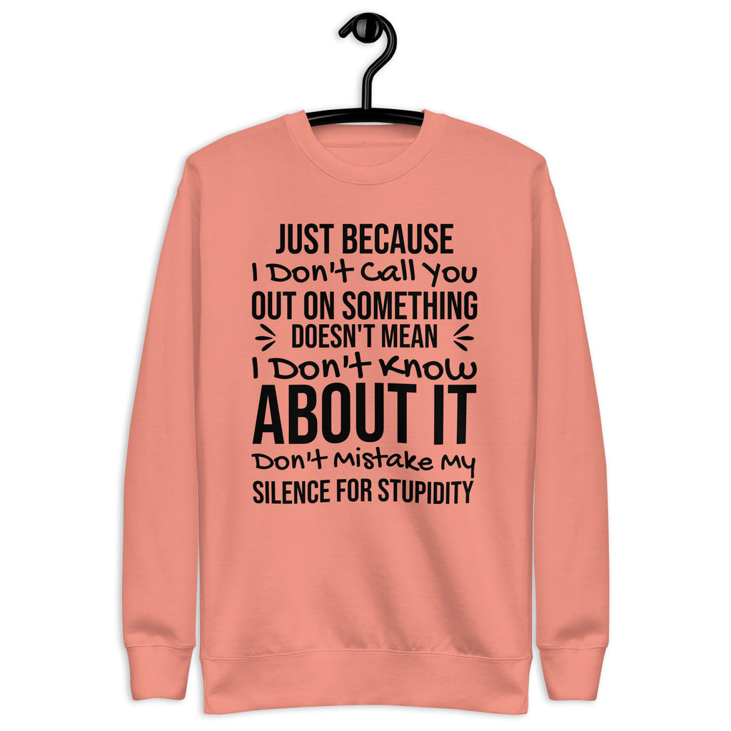 Stay bold and unapologetic in the “Just Because I Don’t Call You Out on Something Doesn’t Mean I Don’t Know About It — Don’t Mistake My Silence for Stupidity” sweatshirt. With its sharp and clever message, this design is perfect for anyone who values observation over confrontation and isn’t afraid to let their style do the talking.