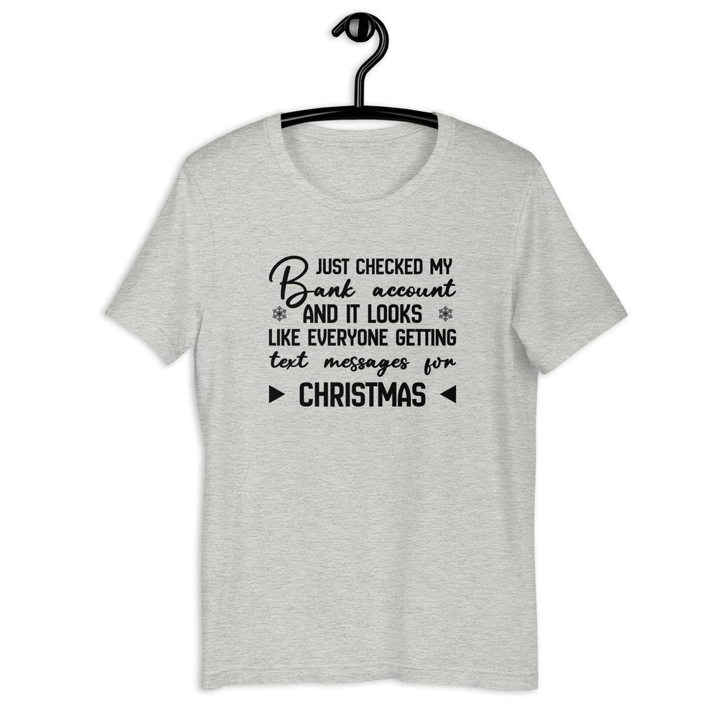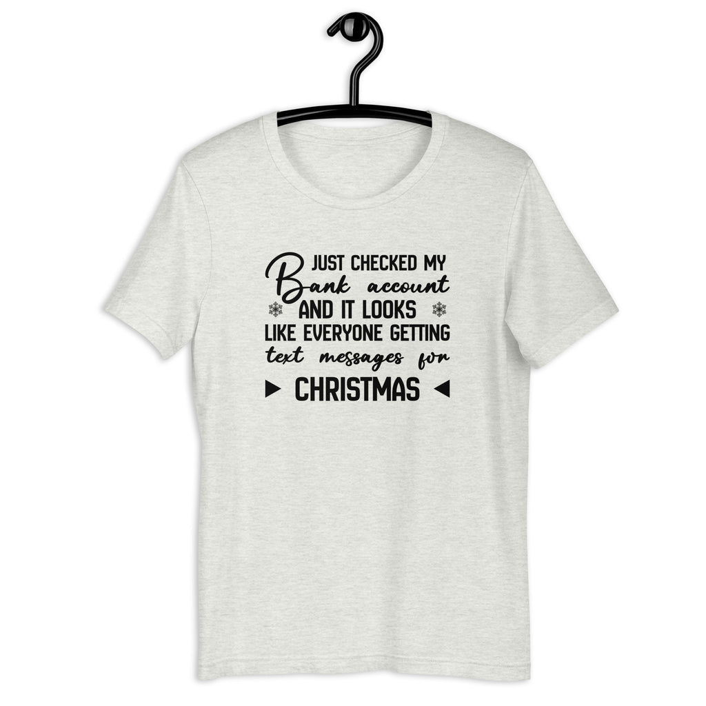 Relatable, funny, and perfectly sarcastic. The “Just Checked My Bank Account and It Looks Like Everyone Getting Text Messages for Christmas” t-shirt is for anyone who knows the struggle of holiday spending all too well. It’s a witty take on financial reality with a healthy dose of humor.