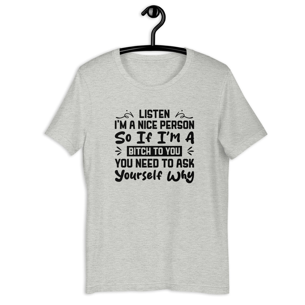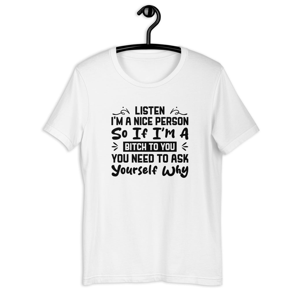 Give everyone a reality check with the “Listen — I’m a Nice Person. So If I’m a Bitch to You, You Need to Ask Yourself Why” T-shirt — the perfect tee for anyone who is kind by default, but absolutely refuses to tolerate disrespect. This shirt captures that sharp, honest moment when someone realizes you didn’t change — their behavior did.