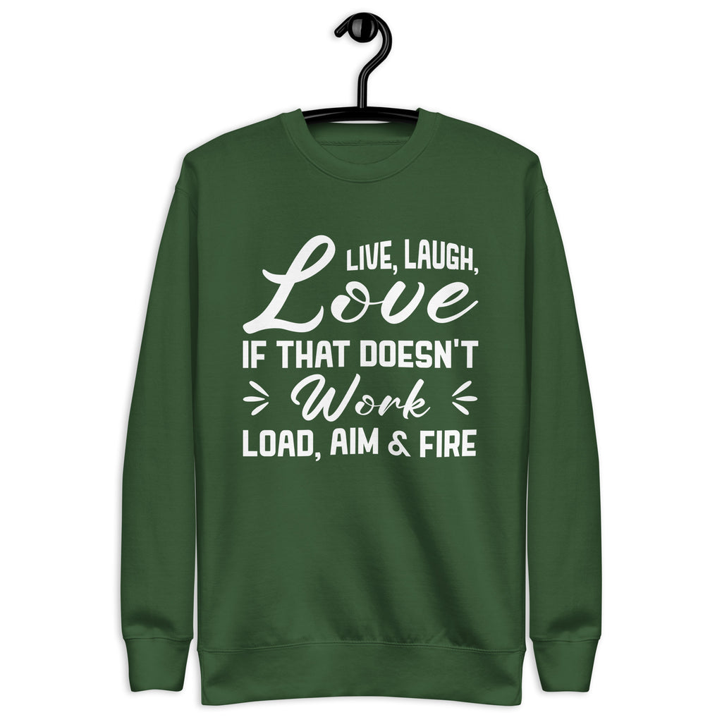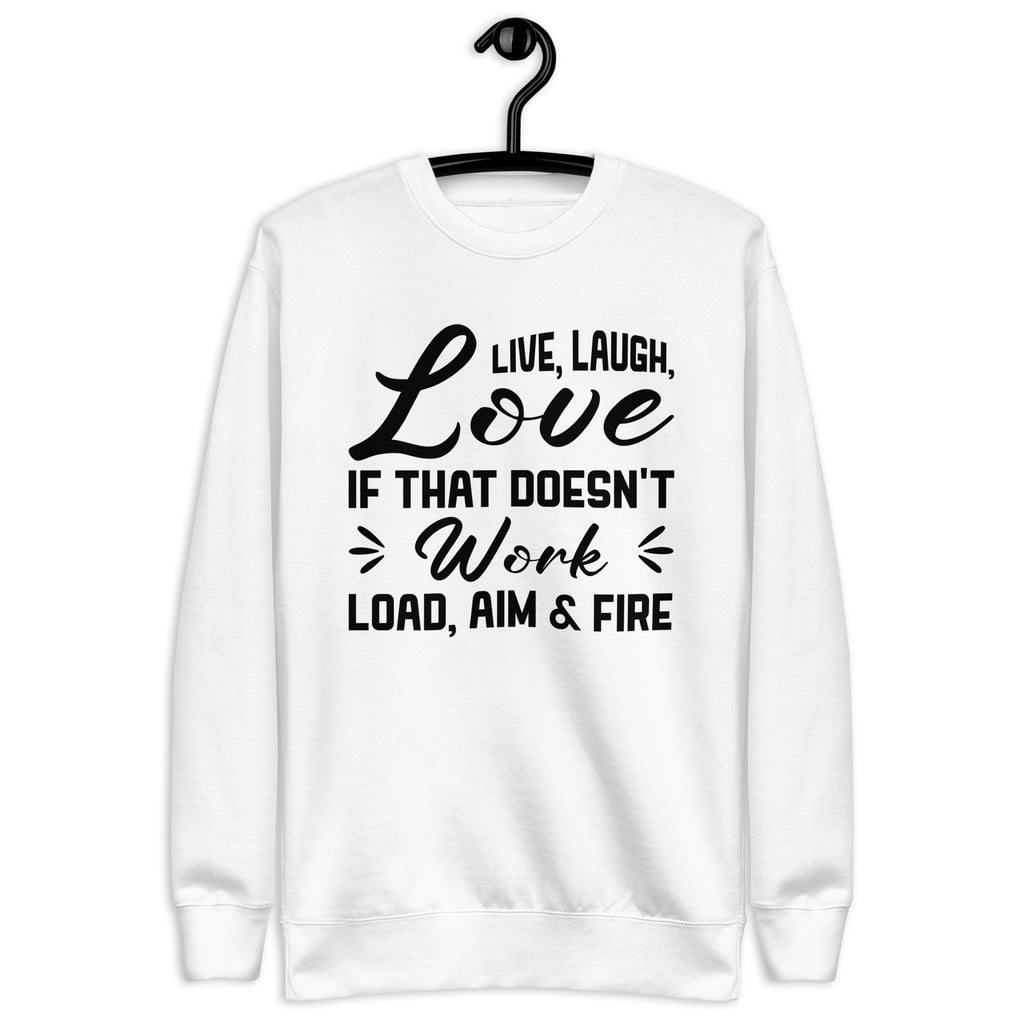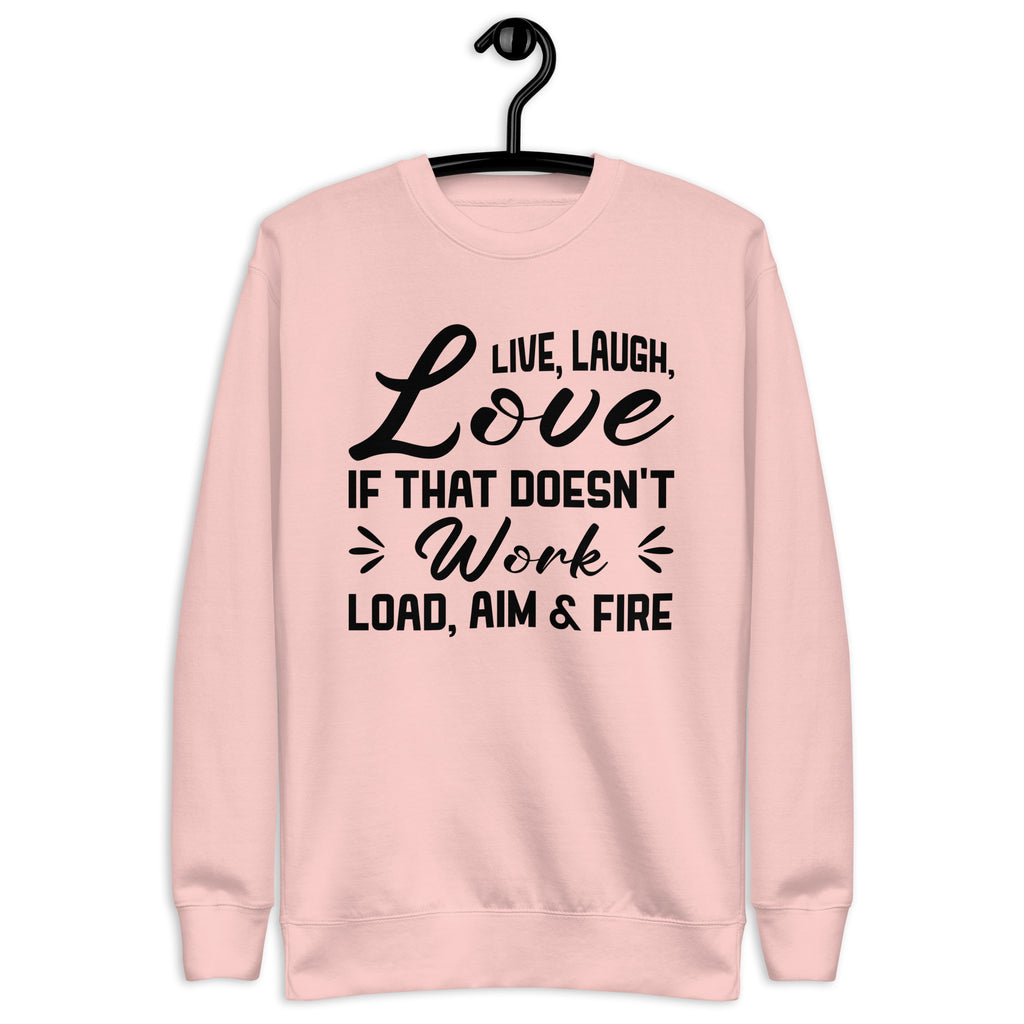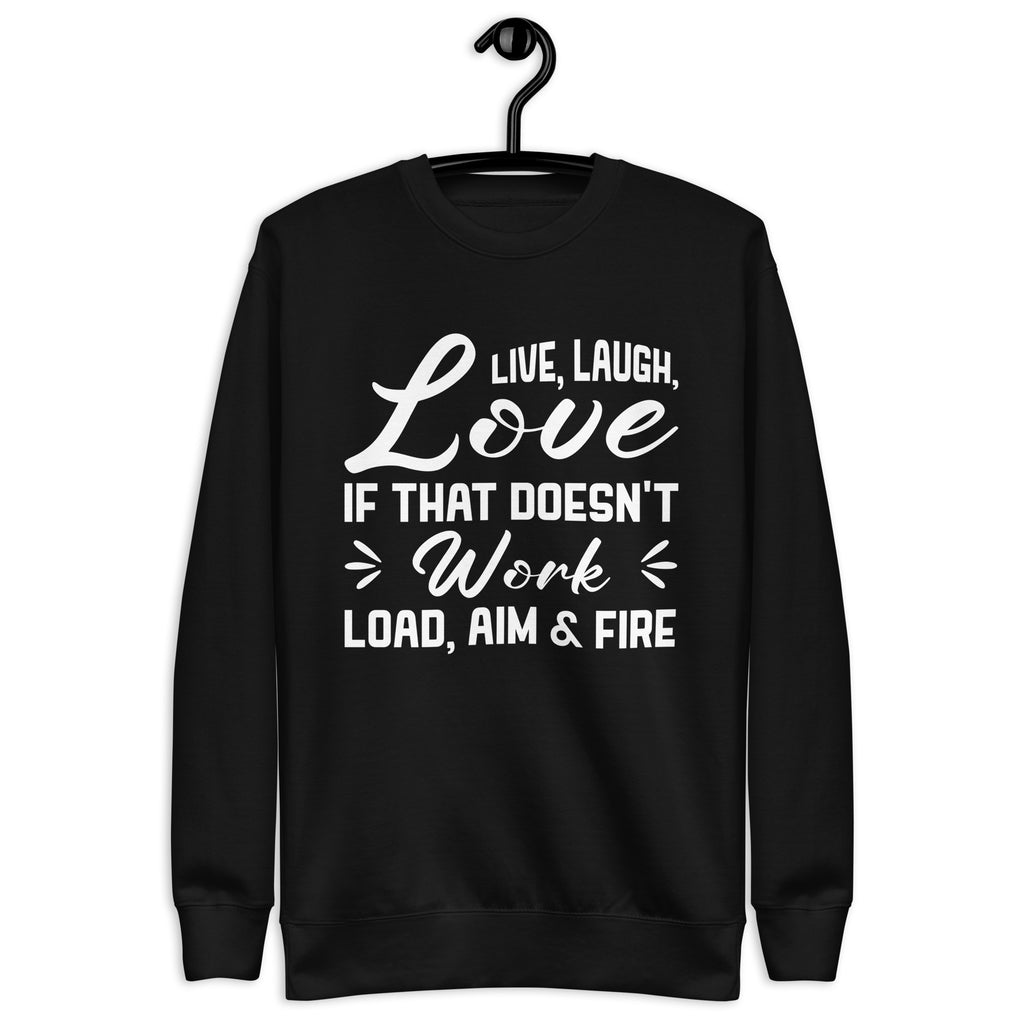 Witty, daring, and darkly humorous. The “LIVE, LAUGH, LOVE — If That Doesn’t Work, Load, Aim & Fire” sweatshirt is for those who take life with a sense of humor and a healthy dose of sarcasm. It flips the usual inspirational mantra on its head, blending charm with edge.