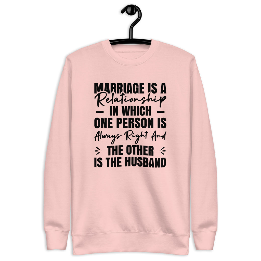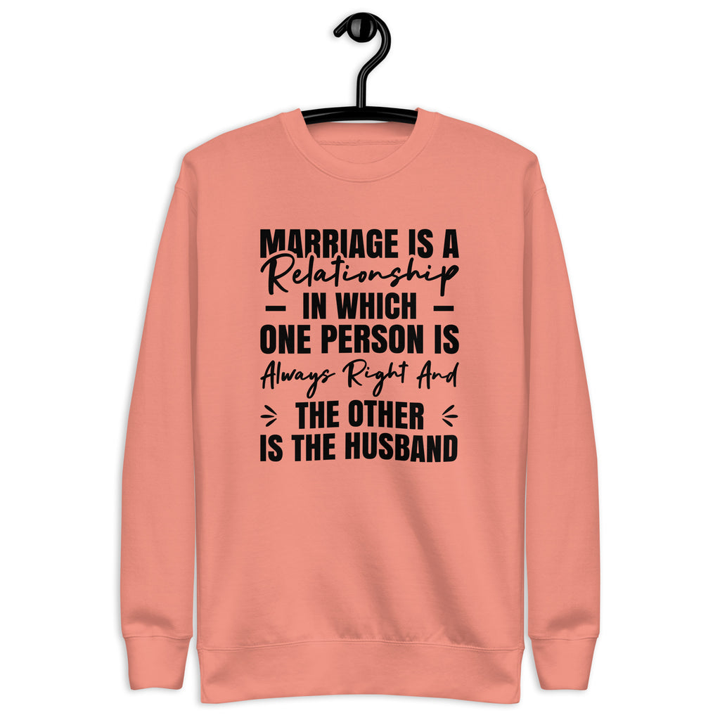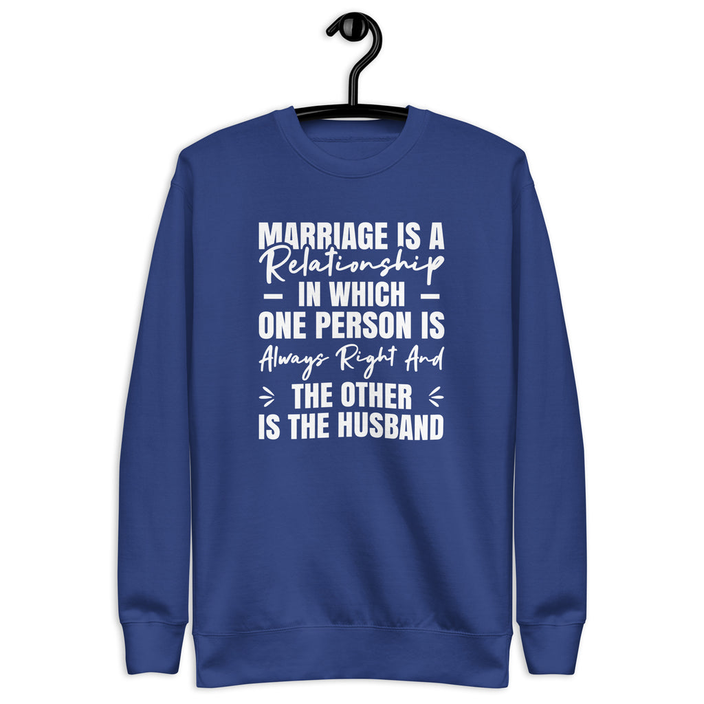 Playful, sarcastic, and dangerously relatable. The “Marriage Is a Relationship in Which One Person Is Always Right—and the Other Is the Husband” sweatshirt delivers classic marriage humor with a knowing wink. It’s a lighthearted take on love, compromise, and the unspoken rules every married couple understands.