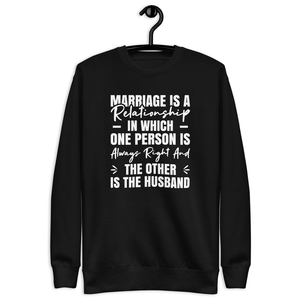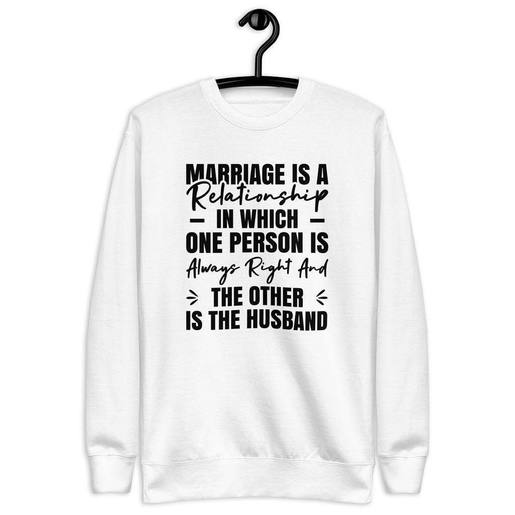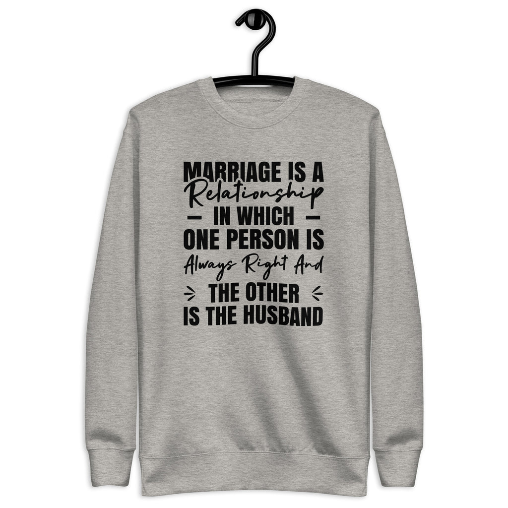 Playful, sarcastic, and dangerously relatable. The “Marriage Is a Relationship in Which One Person Is Always Right—and the Other Is the Husband” sweatshirt delivers classic marriage humor with a knowing wink. It’s a lighthearted take on love, compromise, and the unspoken rules every married couple understands.
