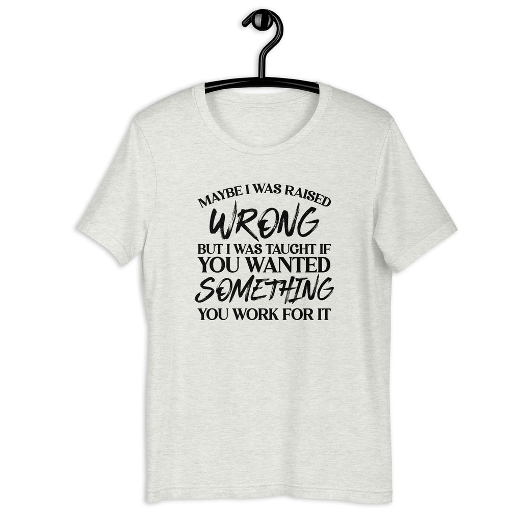 Show off your work ethic with the “Maybe I Was Raised Wrong but I Was Taught If You Wanted Something You Work for It” t-shirt. A bold and relatable design for anyone who believes in earning their way, this shirt is perfect for those who value effort, hustle, and old-school principles.