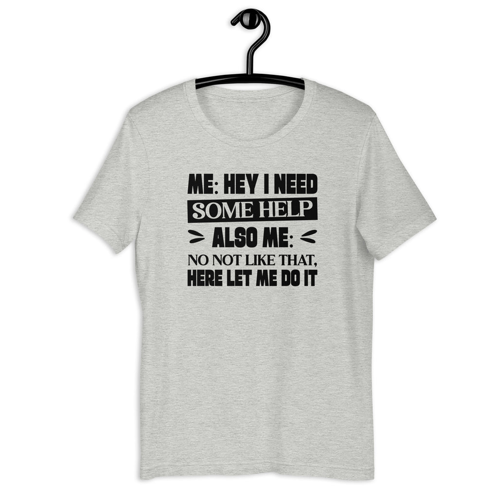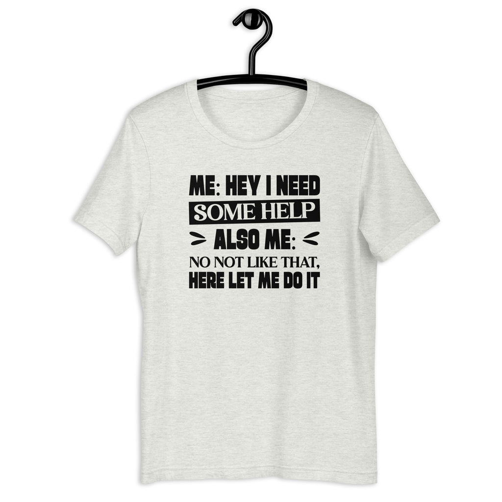 Independent, stubborn, and fully aware of your own control issues — this “Me: Hey I Need Some Help Also Me: No Not Like That, Here Let Me Do It” t-shirt is for the ones who ask for assistance but immediately take over because nobody does it right except you.
