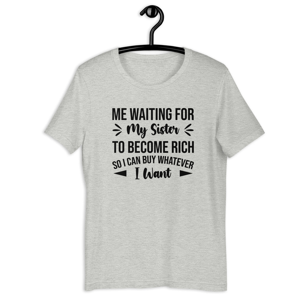 Celebrate sibling loyalty (and strategic financial planning) with the “Me Waiting for My Sister to Become Rich So I Can Buy Whatever I Want” T-shirt — the perfect tribute to that unbreakable bond built on love, support, and slightly unrealistic expectations. This tee captures the hilarious truth of rooting for your sister’s success… mostly because her future paycheck is part of your long-term life plan.