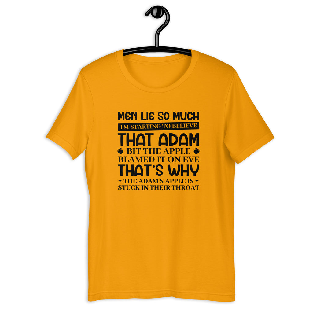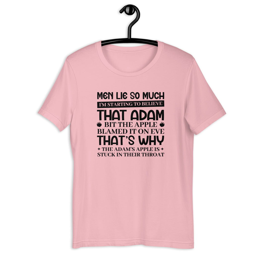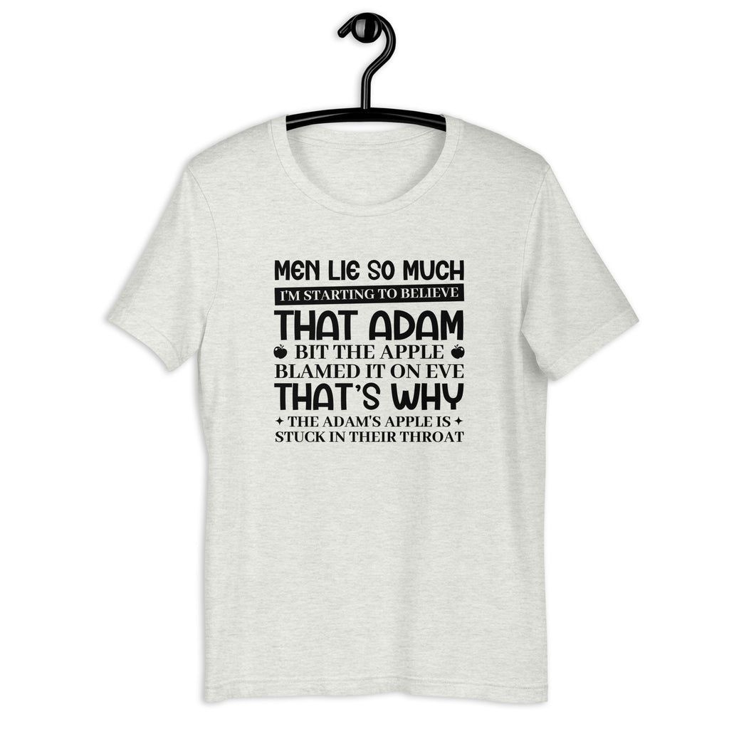 Some stories just don’t add up—and this one is too funny not to wear. The “Men Lie So Much I’m Starting to Believe That Adam Bit the Apple, Blamed It on Eve, and That’s Why the Adam’s Apple Is Stuck in Their Throat” t-shirt brings a clever twist to an age-old tale.