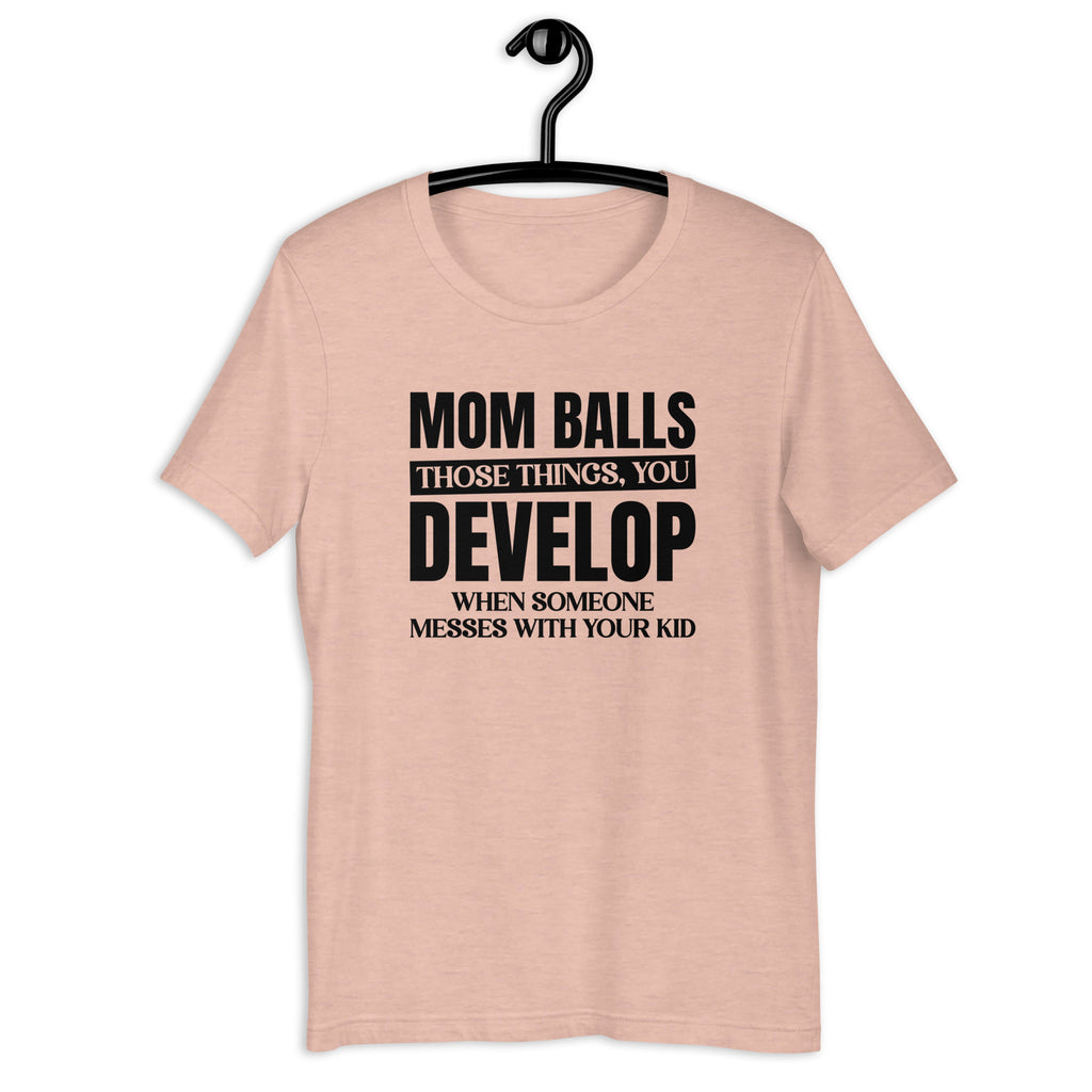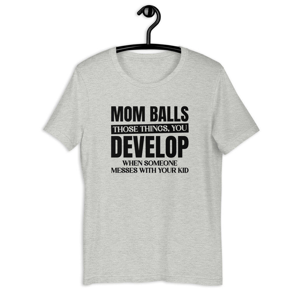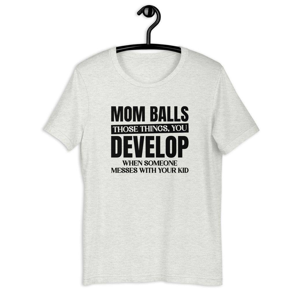 The “Mom’s Balls – Those Things You Develop When Someone Messes With Your Kid” t-shirt is the ultimate badge of fearless motherhood. Bold, witty, and unapologetically protective, this tee celebrates the fierce side of moms who don’t play when it comes to their children.