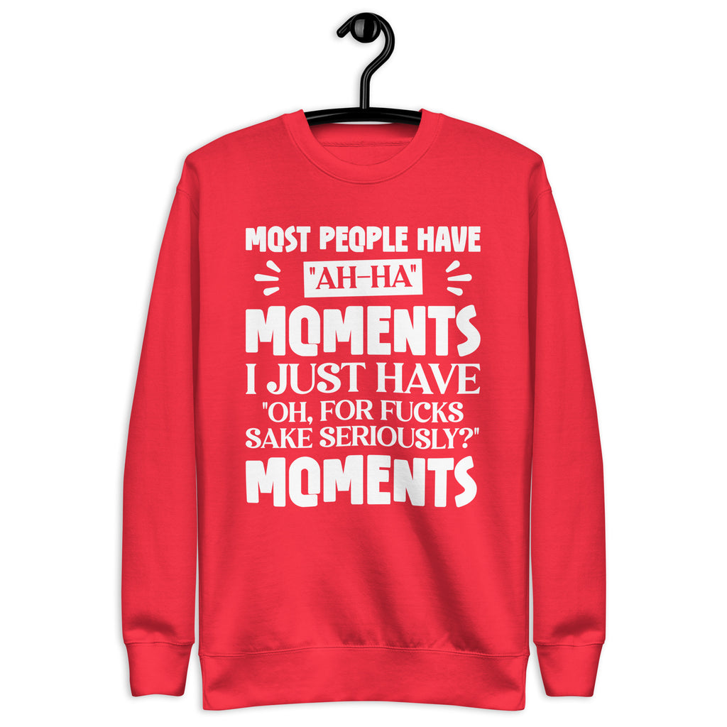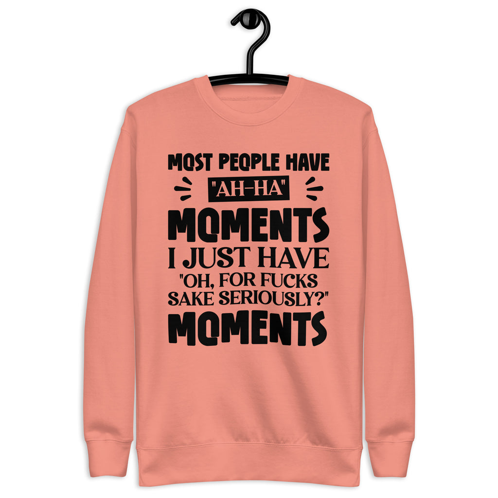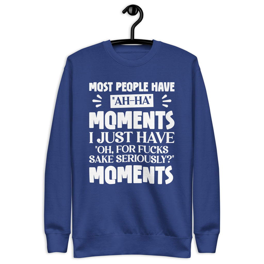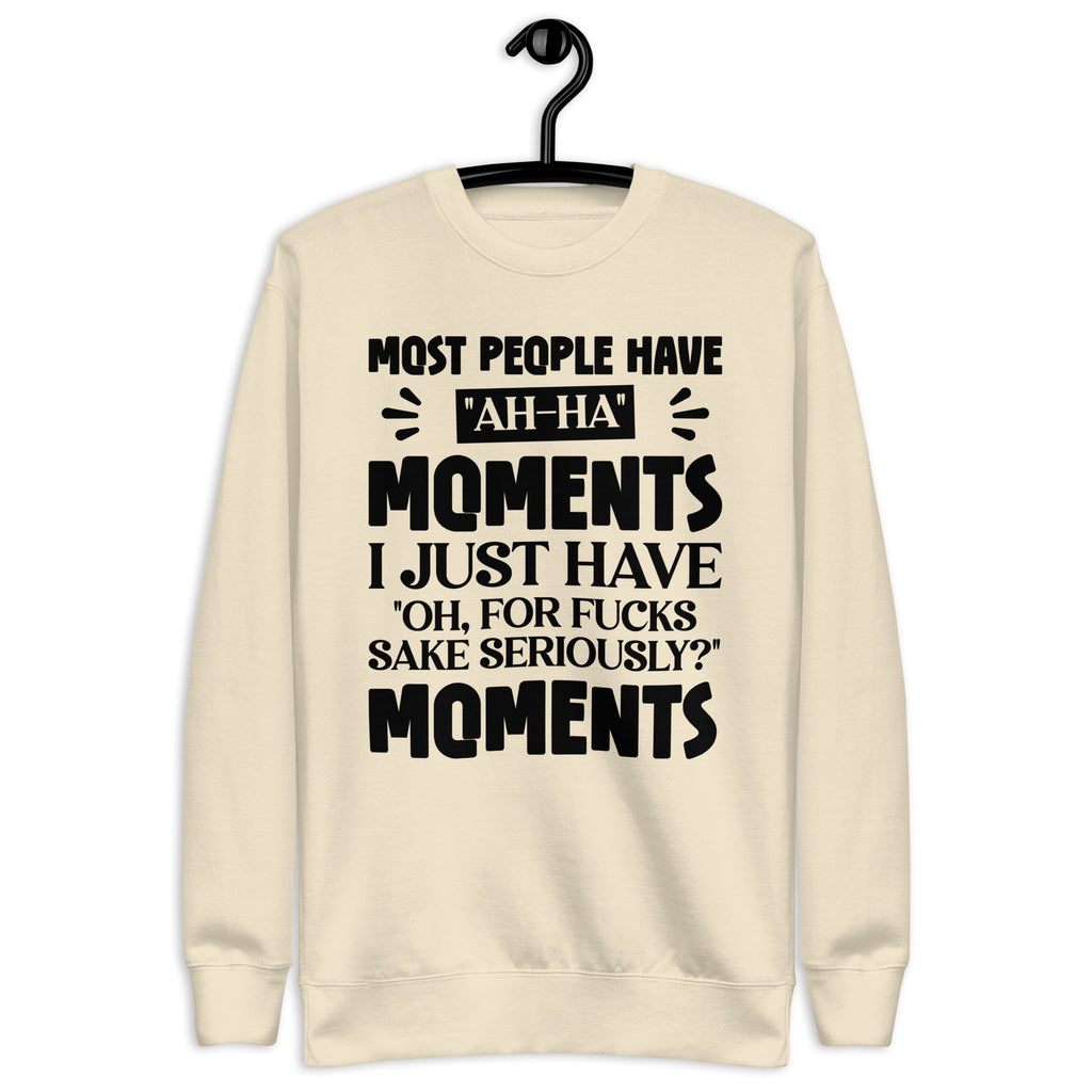 Keep it real and hilariously relatable with this “Most People Have ‘Ah Ha’ Moments — I Just Have ‘Oh for F*ck’s Sake, Seriously?’ Moments”* sweatshirt. Perfect for anyone who deals with life’s daily nonsense one sarcastic sigh at a time, this funny design captures the mood we’ve all been in a few too many times.