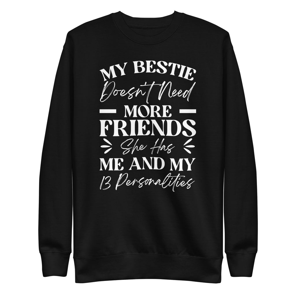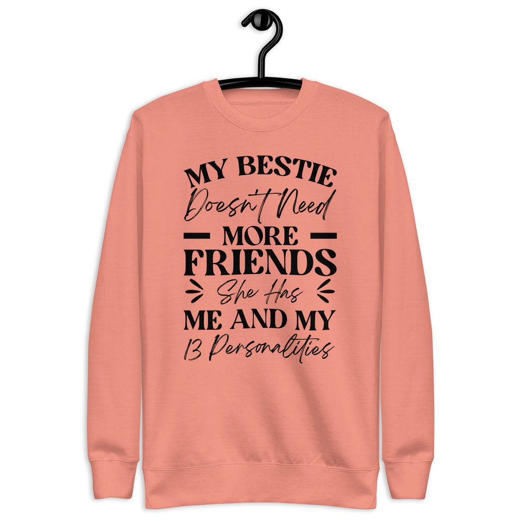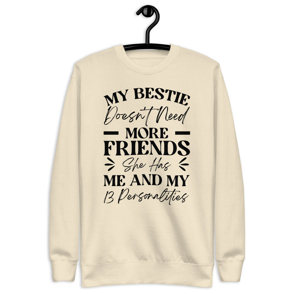 One bestie, endless personalities. The “My Bestie Doesn’t Need More Friends, She Has Me and My 13 Personalities” sweatshirt is the perfect blend of humor, comfort, and chaos. Designed for besties who share everything — from laughs to meltdowns — it’s a playful way to celebrate a friendship that’s never boring.
