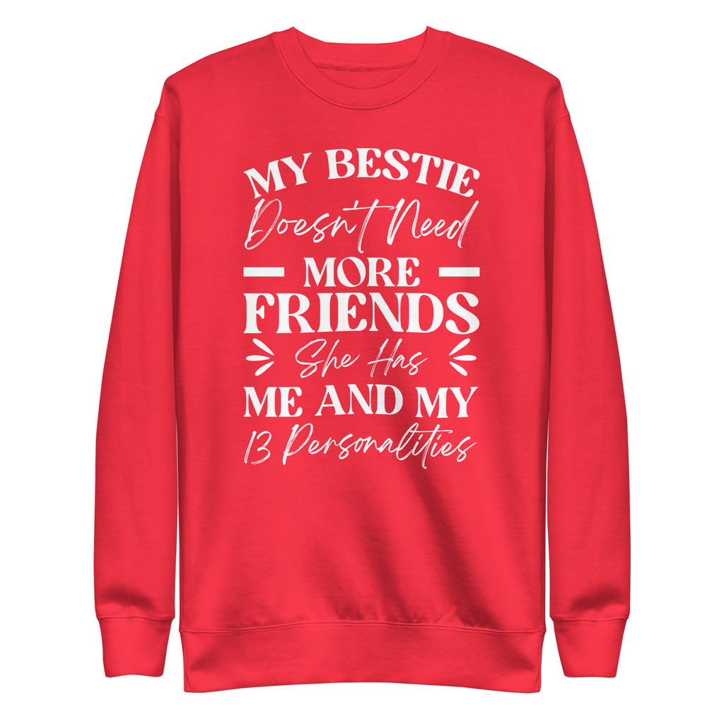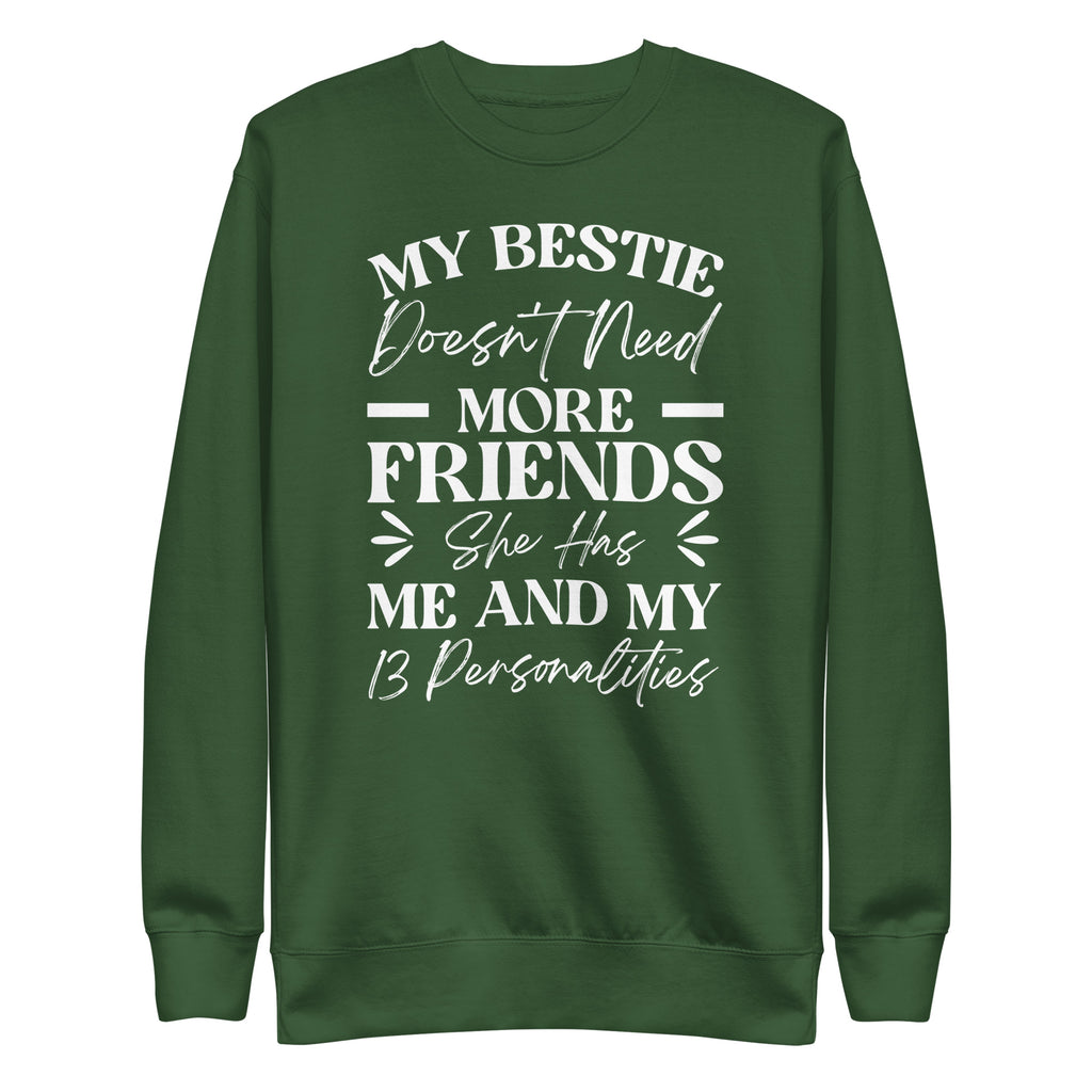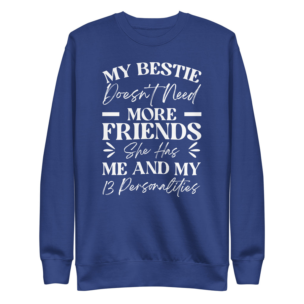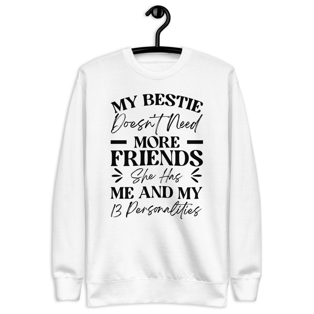 One bestie, endless personalities. The “My Bestie Doesn’t Need More Friends, She Has Me and My 13 Personalities” sweatshirt is the perfect blend of humor, comfort, and chaos. Designed for besties who share everything — from laughs to meltdowns — it’s a playful way to celebrate a friendship that’s never boring.